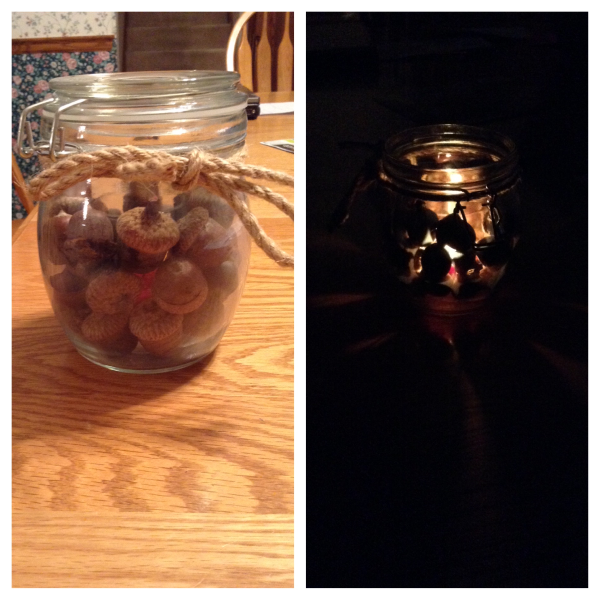 - Place the candle holder with candle into said mason jar. Tyler and I purchased a taller candle holder and a tea light candle, and the acorns fit very nicely around them.