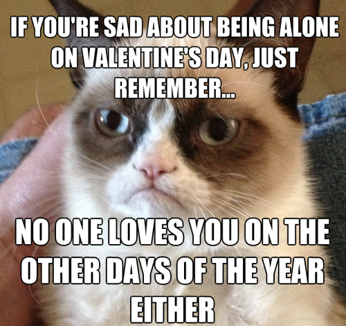 ^^ A little harsh, Grumpy Cat…but you get the point. I get so annoyed by the whiny people who are desperate for a Valentine. Riddle me this: Do you really want a date for one night with some equally desperate sleazeball who’s probably more concerned about having sex than anything else? The answer is no, you don’t! And if you get approached by one of these said sleazeballs, flip your gorgeous mane of hair and walk away. STORY TIME! So I don’t know if you guys remember when I told you about that pathetic excuse of a man who broke up with me via Facebook, but he got in touch with me this week. (#ew) He suggested we go see a movie – I suggested he go fuck himself. Moral of the story: I could have easily said he should take me out on a Valentine’s Day date this weekend but I have standards. AND I hate him! In other words, don’t let your standards drop for one night of frivolity.