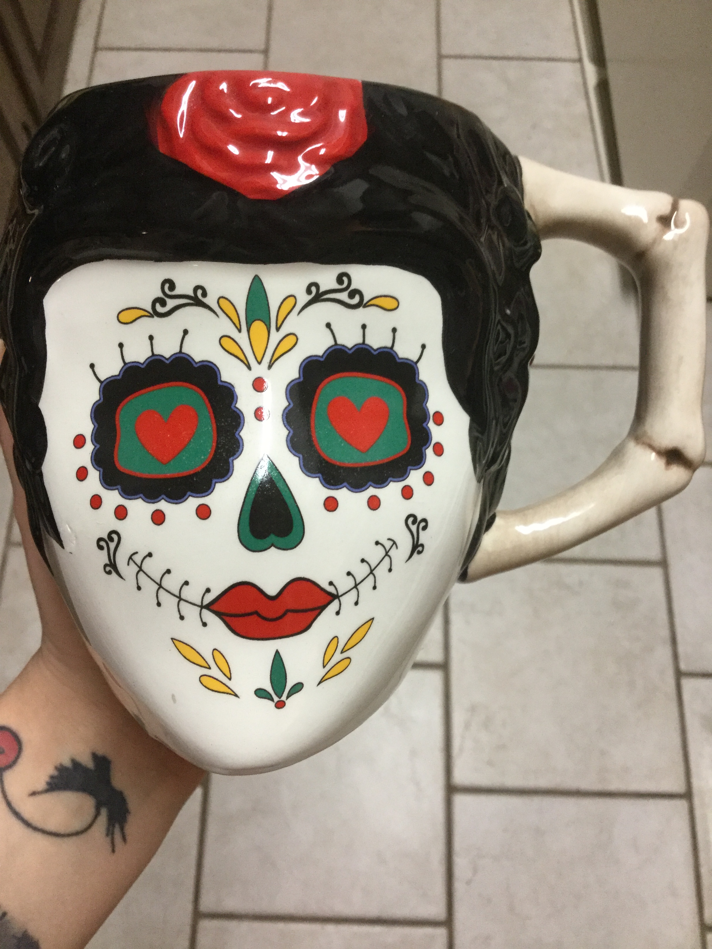 Originally, I thought the ghostie was the surprise but Johnny told me that it was for him to take to work to decorate his space with. This is a ghost that he definitely won’t need a boo buddy or ghost camera for! Then, he handed me this adorable sugar skull coffee mug:
