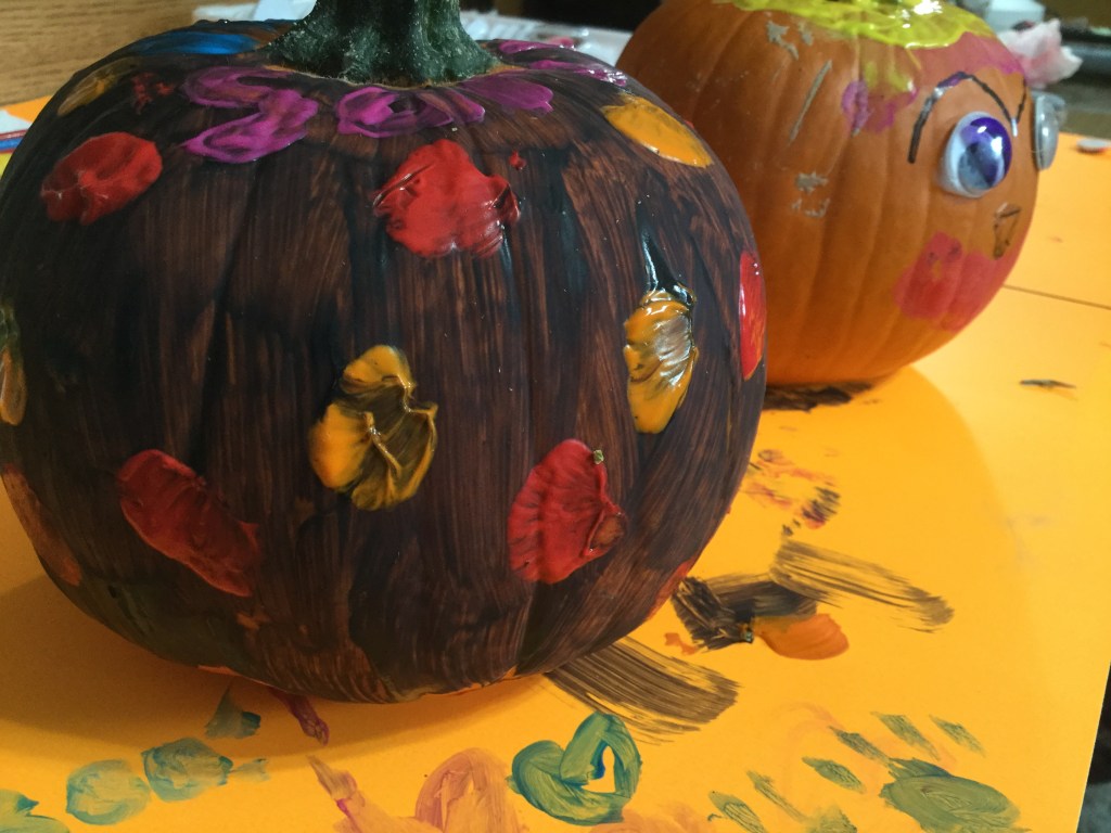 During the “pumpkin party”, we had Casper The Friendly Ghost playing on the TV while we worked on our masterpieces. We painted away until we were satisfied with our creations and then gave each other a grand reveal of the end results. They looked a little something like this: