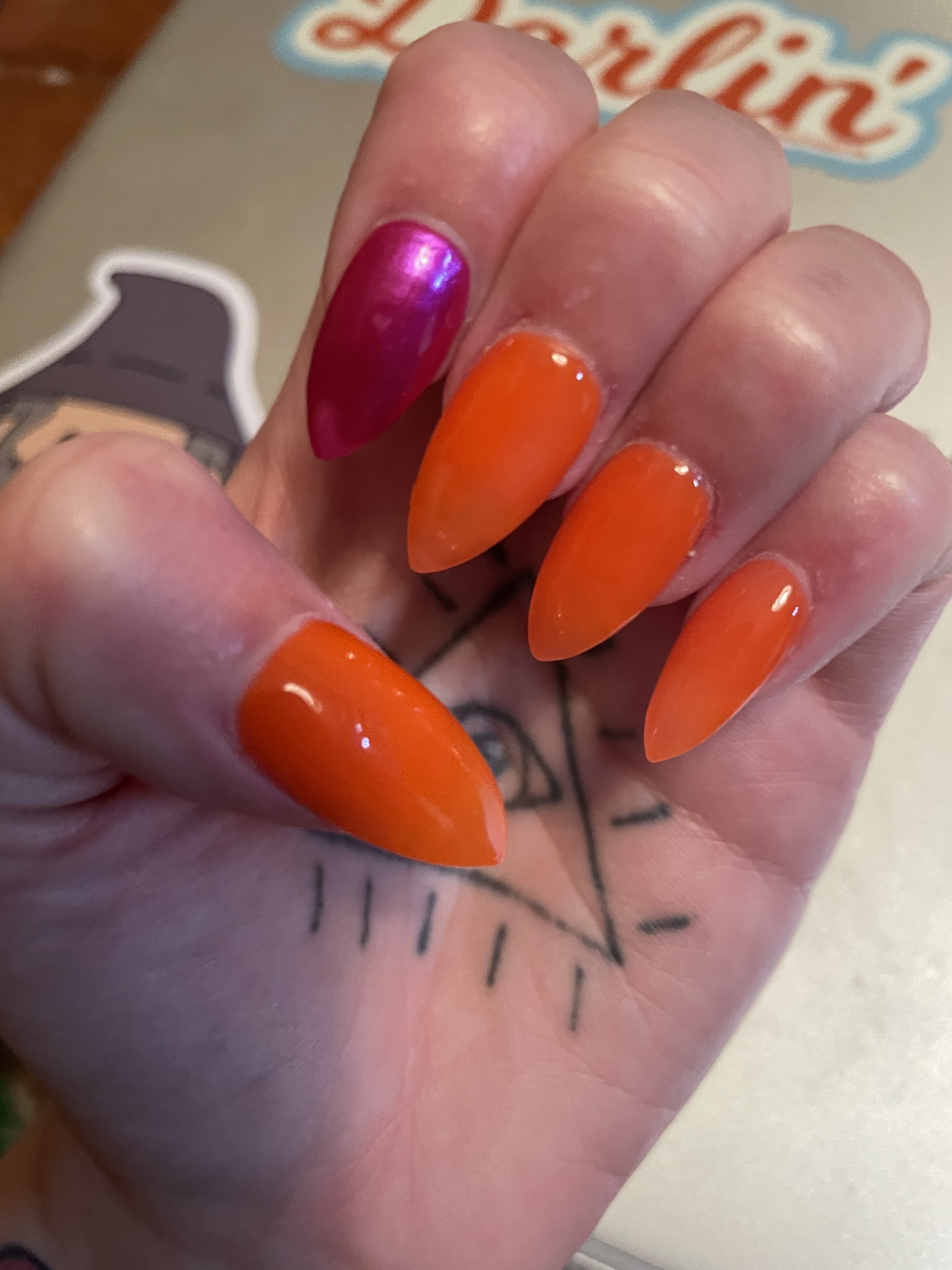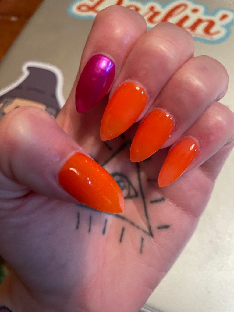 Howdy! It is spooky season alright, which means that Halloween nails were in order when I got my fill at Elysian Nails. All day long, I was debating which color combination to go with because I didn’t want to do something as obvious as red and black. Then, I began going through a mental list of Halloween movies to draw inspiration from and settled on Hocus Pocus for a unique orange and red violet combo. Check it out: