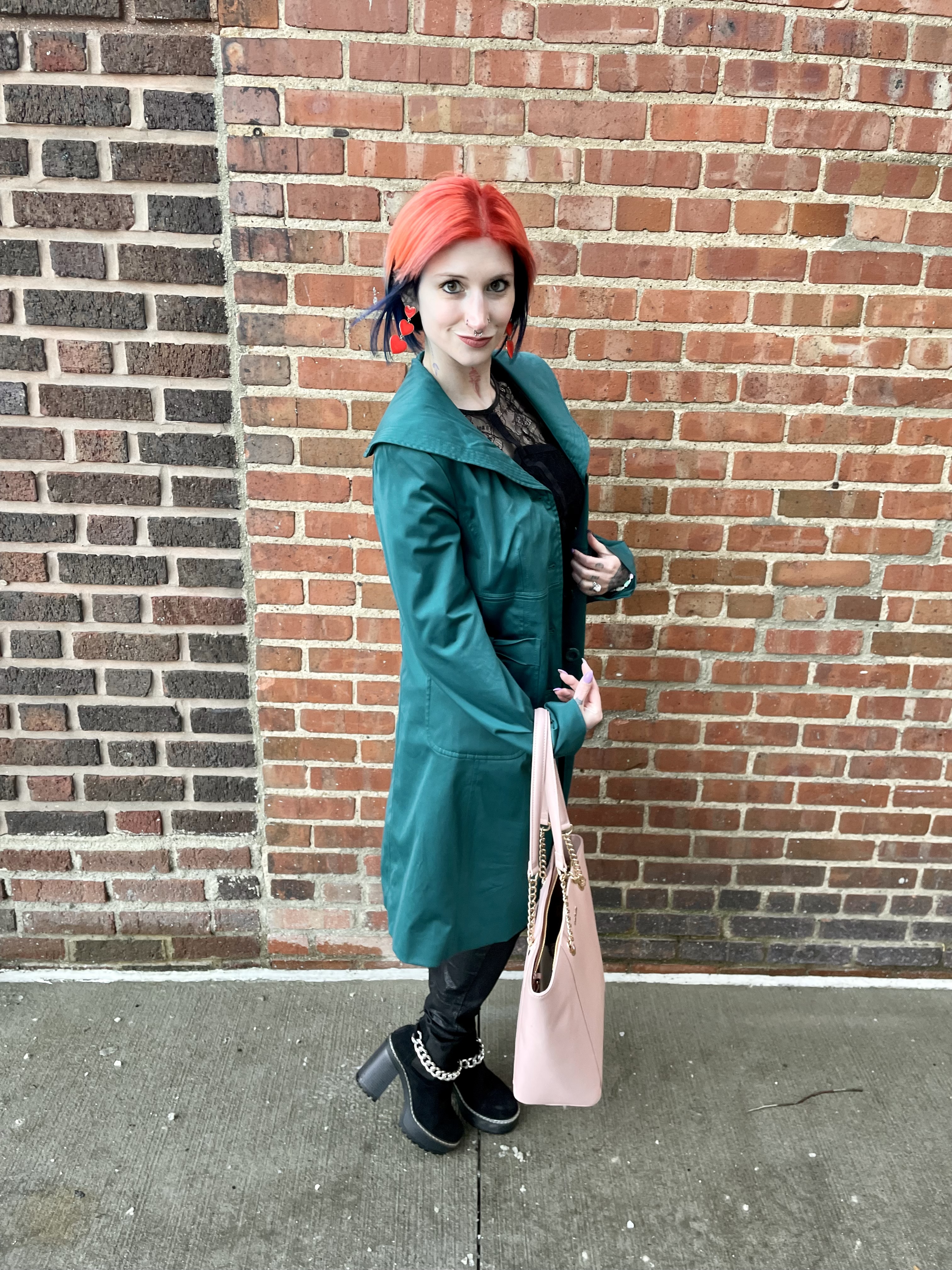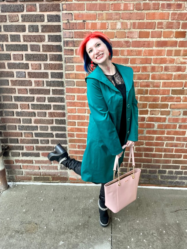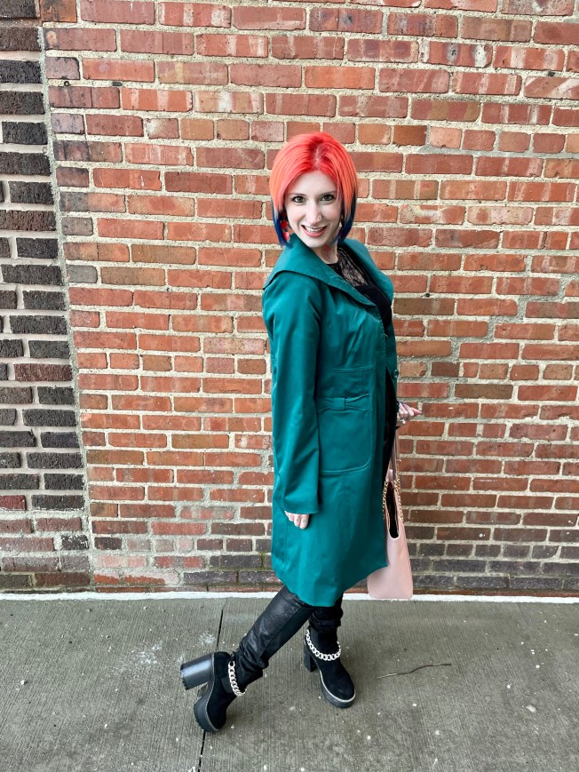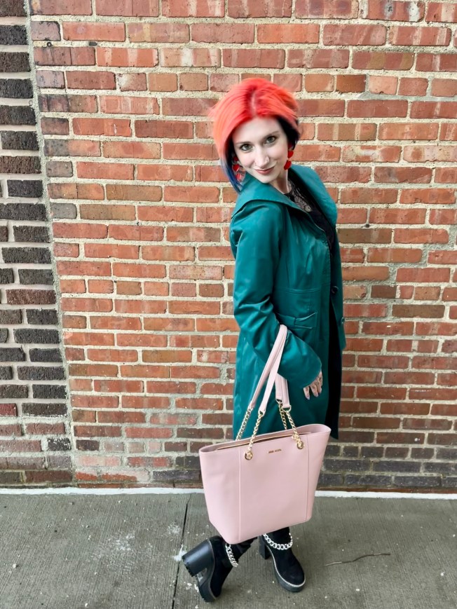 With the base of the outfit sorted, it was time for all of the extras. For shoes, I chose one of my go to pairs of platform boots by Olivia Miller. And as I was pulling from the same palette, the suede texture only enhanced the OOTD rather than looking out of place. The outfit was not yet complete, though, because it was cold AF! Since I added some extra height with the boots, I slipped on one of my favorite, mid calf length trench coats by Nine West. The beauty of an all one color outfit is that your pop of colors are REALLY going to pop. The bold emerald green looked so luxe against the base of the outfit and the sheen of the coat closely mimicked the jeans, creating even more cohesion.