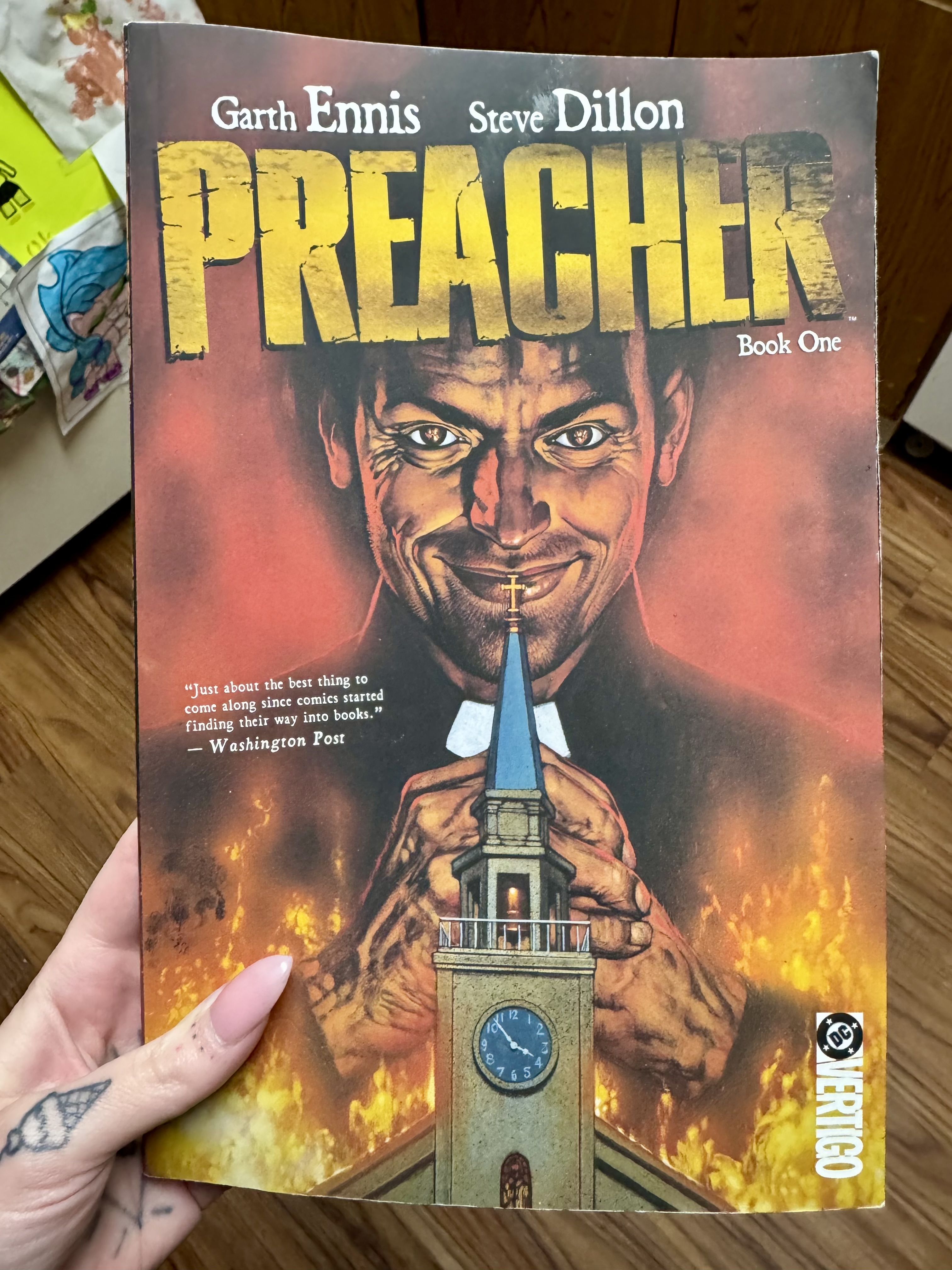 Hello everyone and welcome to a brand new edition of Lil Red’s Book Club! For my Christmas gift this year, I treated myself to the entire collection of one of my favorite graphic novel series called Preacher by Garth Ennis and Steve Dillon. After a stint of reading The Housemaid series, I finally was able to crack open Book One of Preacher and devoured it. I didn’t think it was possible, but it was even better than I remembered! Before we discuss Book One in a spoiler free setting, as always, I will be placing a big fat trigger warning on this graphic novel. It features graphic language, graphic violence, and highly disturbing content. It is not a read for the faint of heart! Now, let’s get to it: