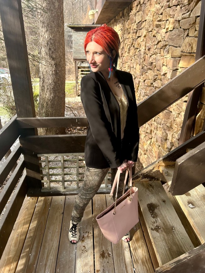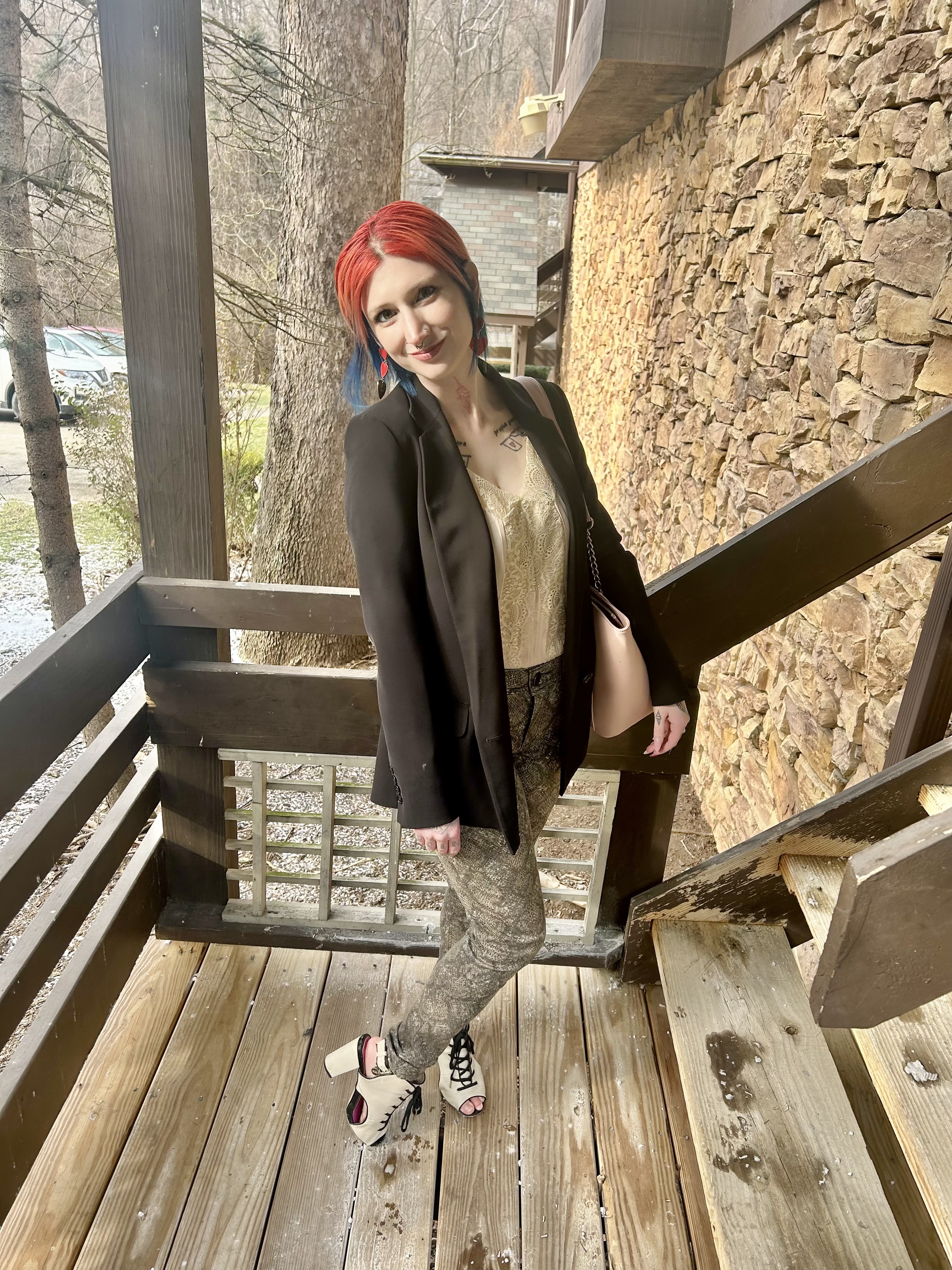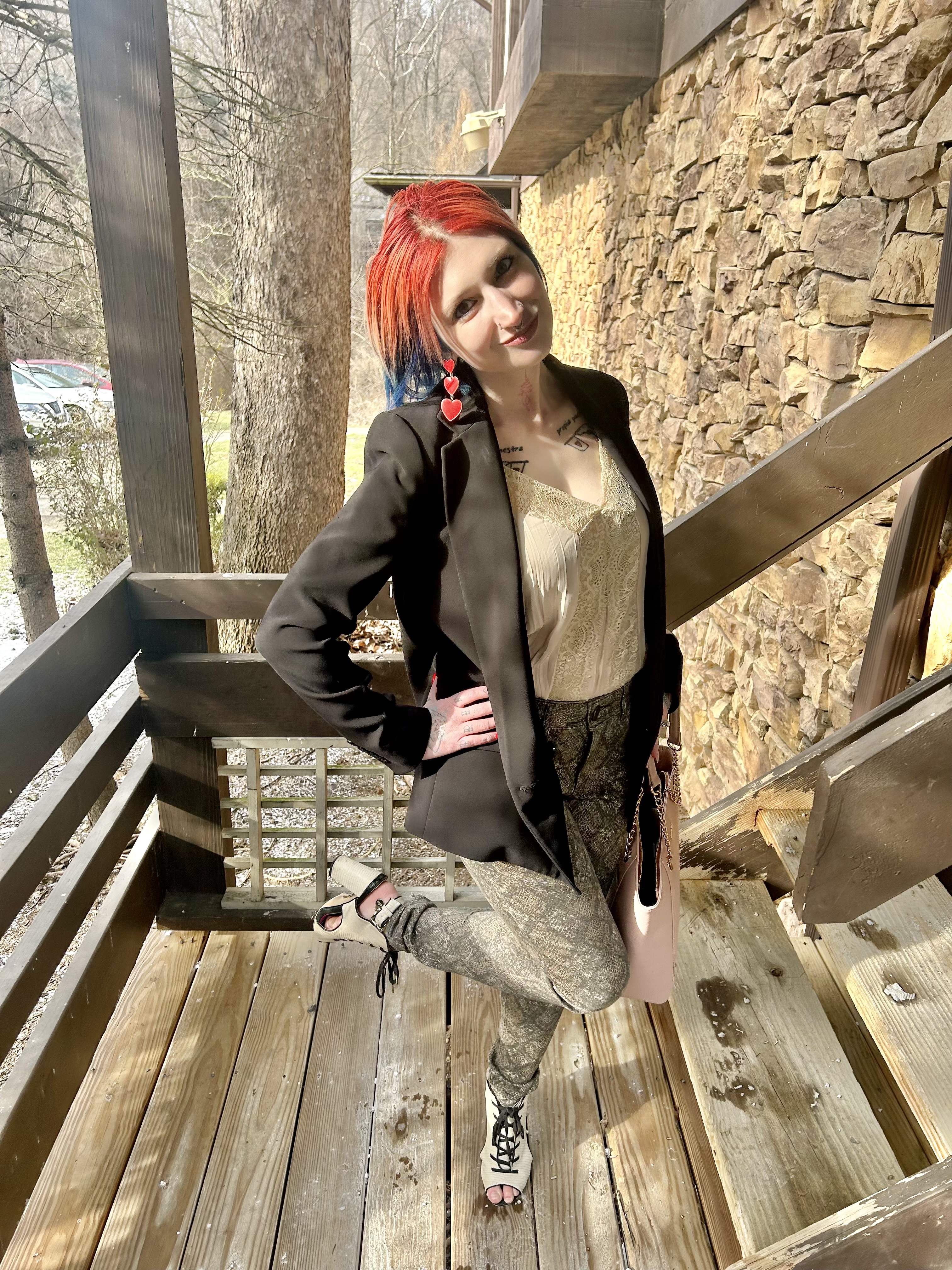 The Wit & Wisdom jeans featured hues of cream, taupe, and grey in the pattern and I chose to focus in on the cream shade. By pulling from that, it was easy to select the pretty, oyster shell lace cami to pair it with. Was it a perfect match? No. However, you are never going to find a perfect color match in two pieces of clothing so close enough is good enough! Of course, the weather on V-Day was cold AF and wearing just a cami was begging for hypothermia lol. So, I slipped on my four dolla holla Express blazer from the Goodwill. The beauty of the skinny jeans is that, despite the pattern, the colors are all neutral so adding another neutral piece like the black blazer was no harm no foul.