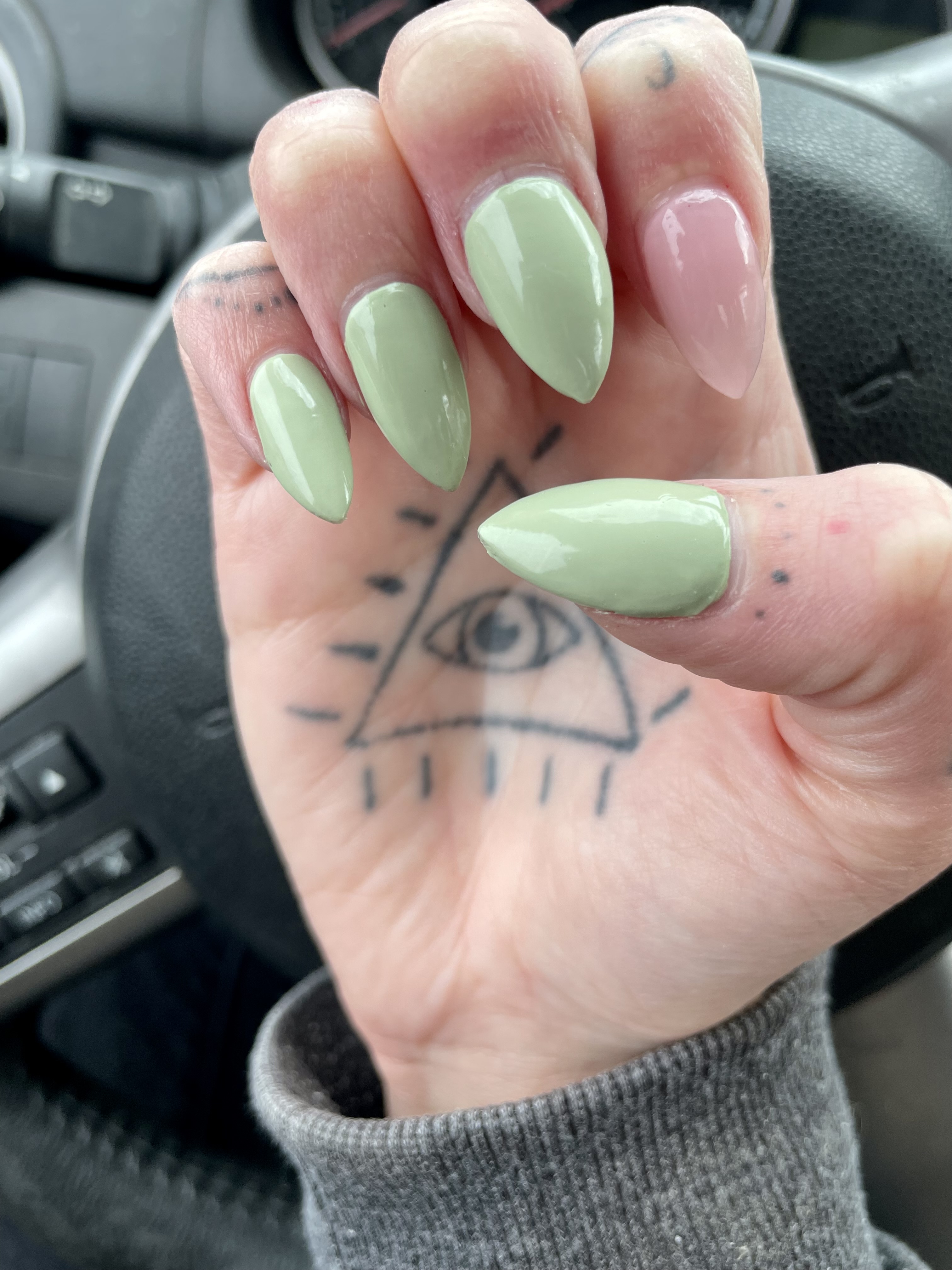 As I approached the nail polish wall at Elysian Nails, I was saddened that I had totally forgot which light pink I even used last time so I spent a few minutes on the prowl. Is the color I ended up with the exact same? I am genuinely unsure but, hey, close enough is good enough! After finding a pink that pleased me, I was keeping my fingers crossed to find a light green to pair it with. I had a backup option in mind because green nail polish can be so hit or miss. Deep greens are lovely but light green can look pukey lol. Then, the bottle of sage green polish caught my eye and I went for it. I actually think it might be new because I would have definitely used it before! I wish it was a bit more translucent but beggars can’t be choosers and I still love how they turned out. ❤