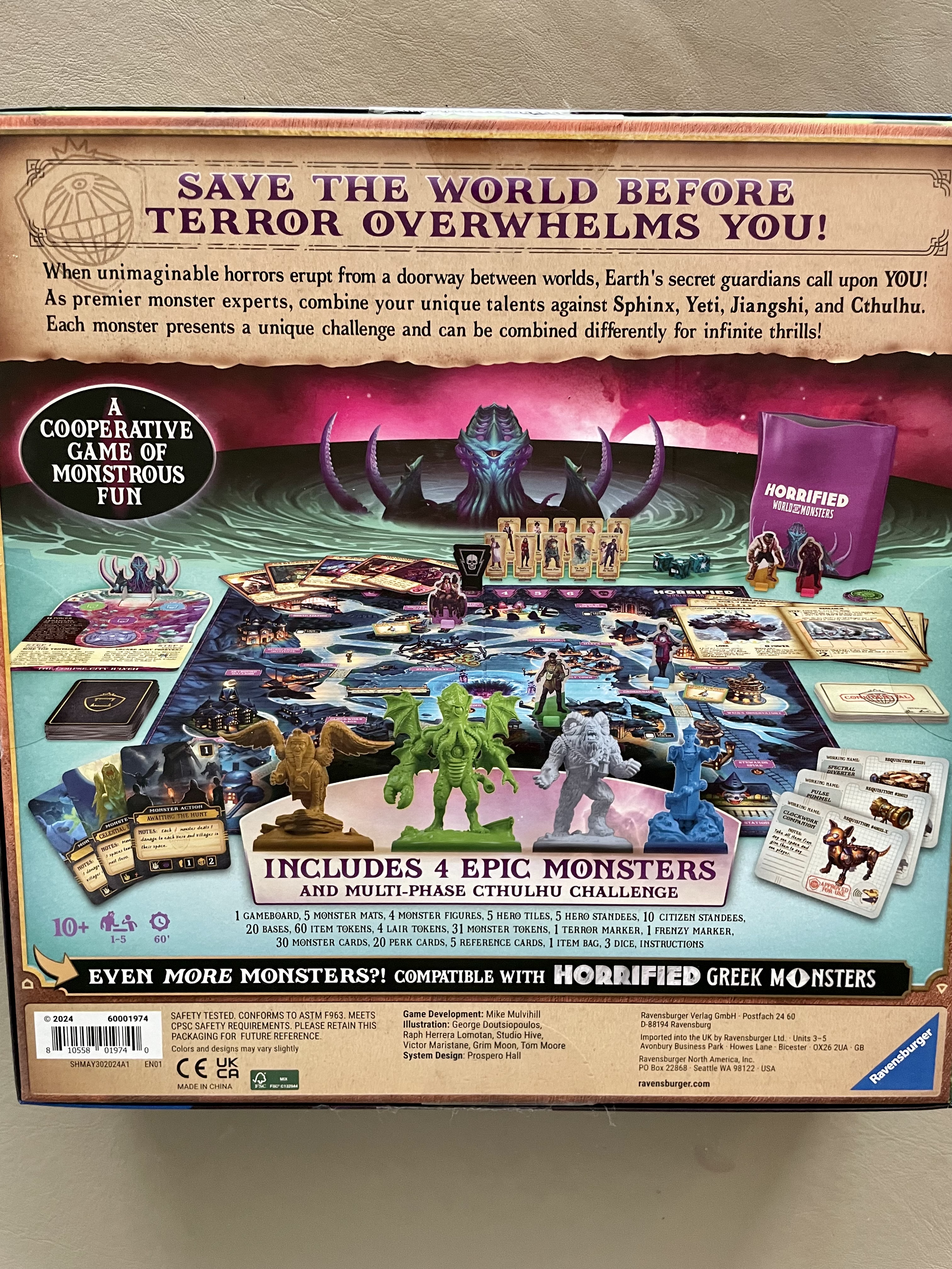 We have gotten great use out of Horrified and Johnny and I always hoped they would make a new board with new monsters. You could imagine our surprise when we found out there was three! In addition to the original, there is a board for American Monsters, Greek Monsters, and World of Monsters. This past weekend, we made a Target Run to see if they had any of these new boards available. They had World of Monsters and we played it as soon as we got home. We had an absolute blast!
