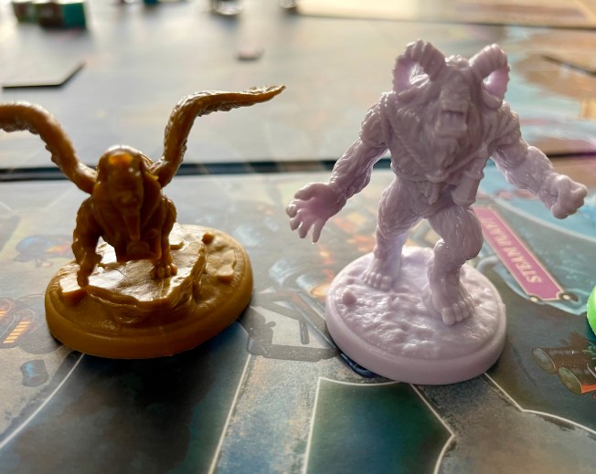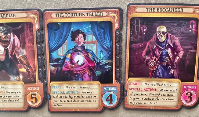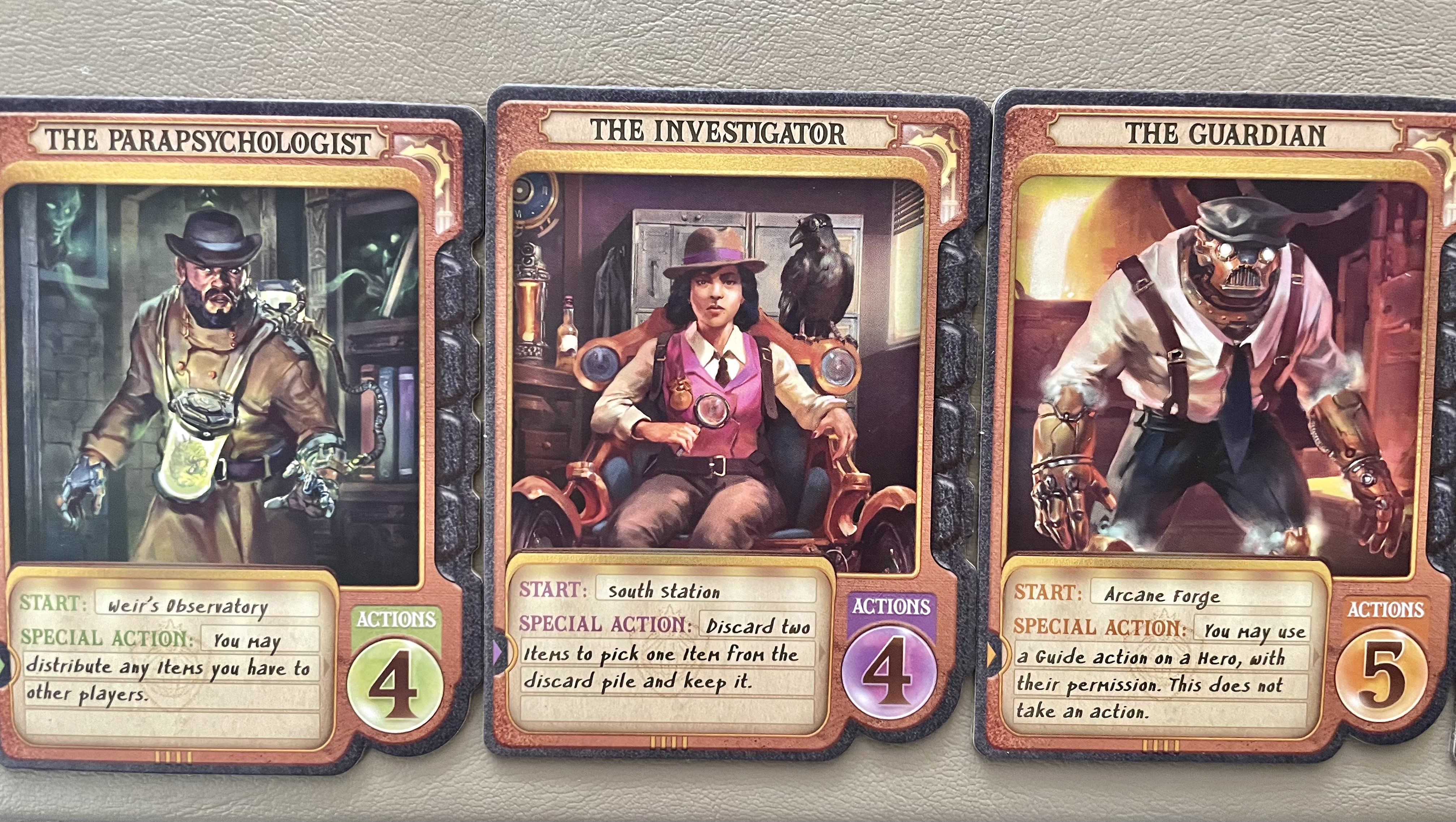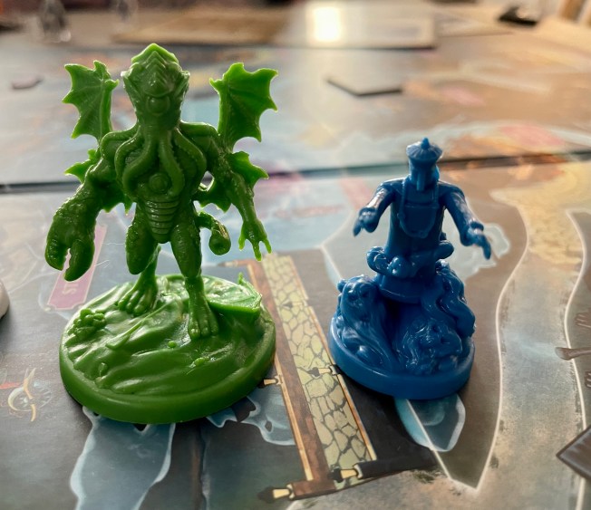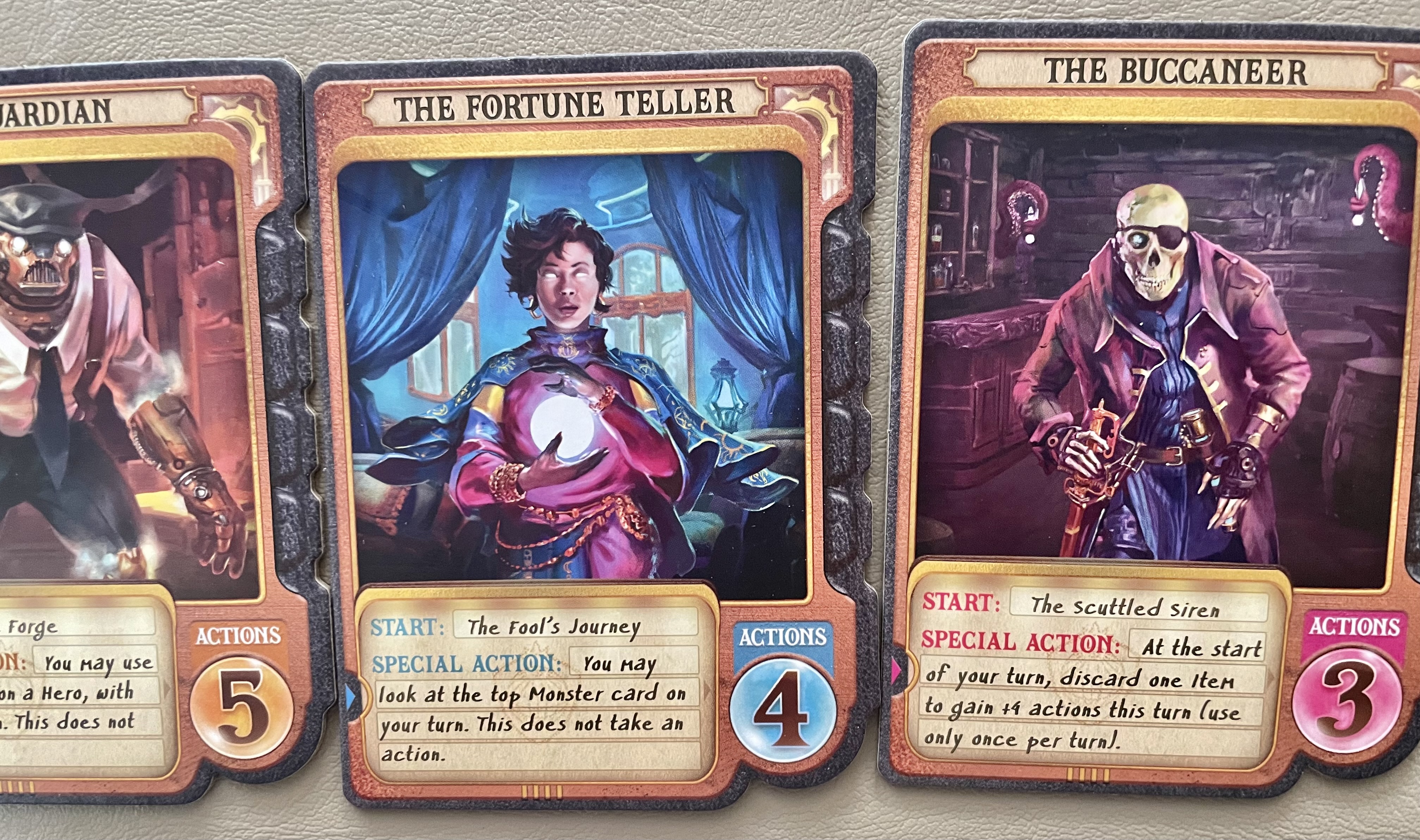 The premise of World of Monsters is the exact same as the original Horrified but with brand new heroes, monsters, villagers, items, action cards, and objectives. In World of Monsters, you can go toe to toe with the Sphinx, Yeti, Jiangshi, and Cthulhu. As per the game’s recommendation, we battled the Sphinx and Yeti first to get a feel for the board. Johnny played as the Buccaneer and I chose the Parapsychologist. Both of these heroes worked really well together and we were able to utilize their strengths for optimal results because we reigned victorious. Granted, our Life Counter was getting down to the wire but we still won so who cares lol.