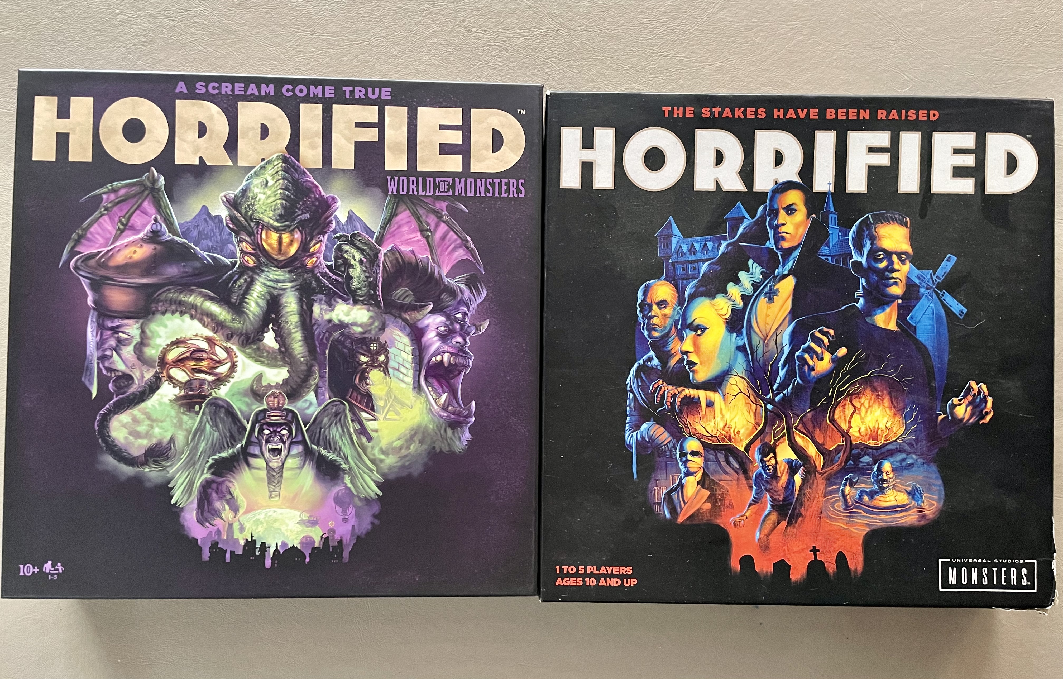 Hello! Johnny and I love playing board games together and one of our favorites is, hands down, Horrified. In this co-op game, your mission is to work as a team and save a village from classic horror movie monsters like Dracula, Frankenstein and his Bride, The Mummy, The Wolf Man, The Invisible Man, and The Creature from the Black Lagoon. Each monster has its own unique way of being defeated with tasks you must complete and all the while, you have to protect yourself, teammates, and villagers on the board. It is so much fun!!