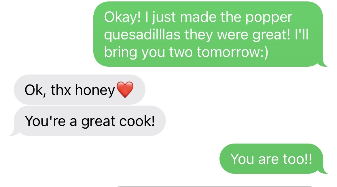 The combined act of not only preparing the food but sharing it is so satisfying to me and I take pride in being the neighbor and daughter that surprises someone with a home cooked meal. I expect nothing in return for this because it’s truly my pleasure. It’s always nice to be complimented, though, and this text exchange with my mom made my day: