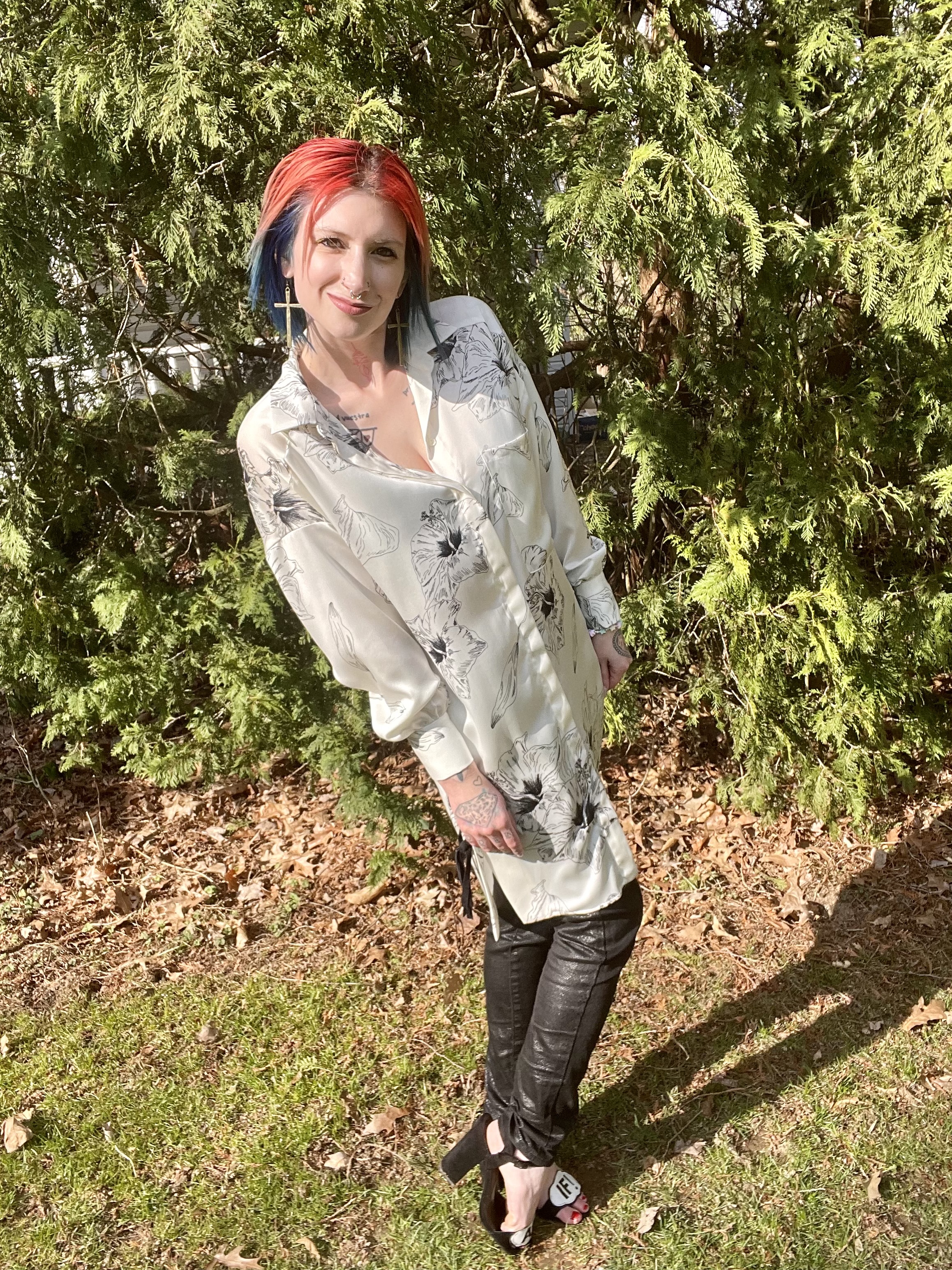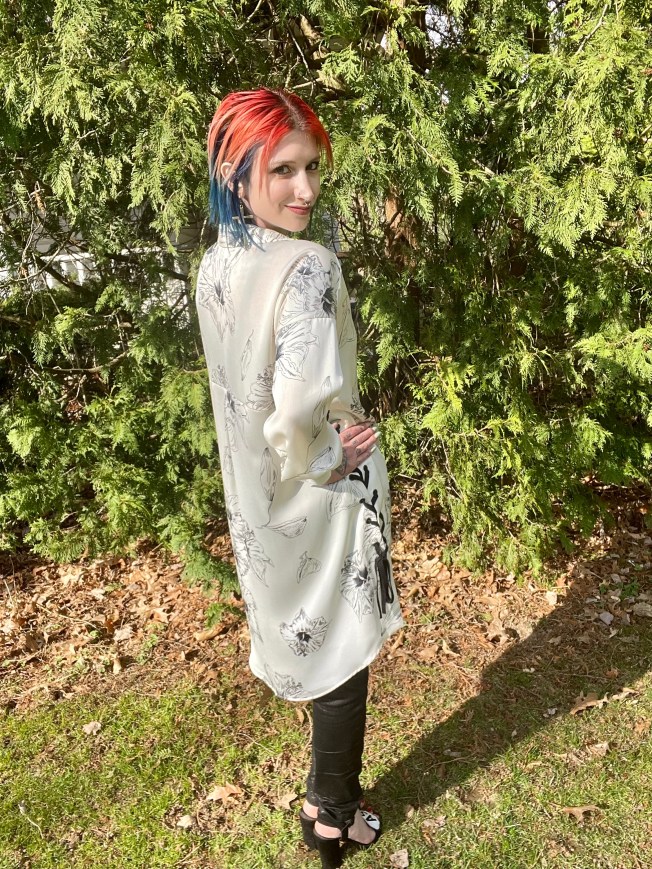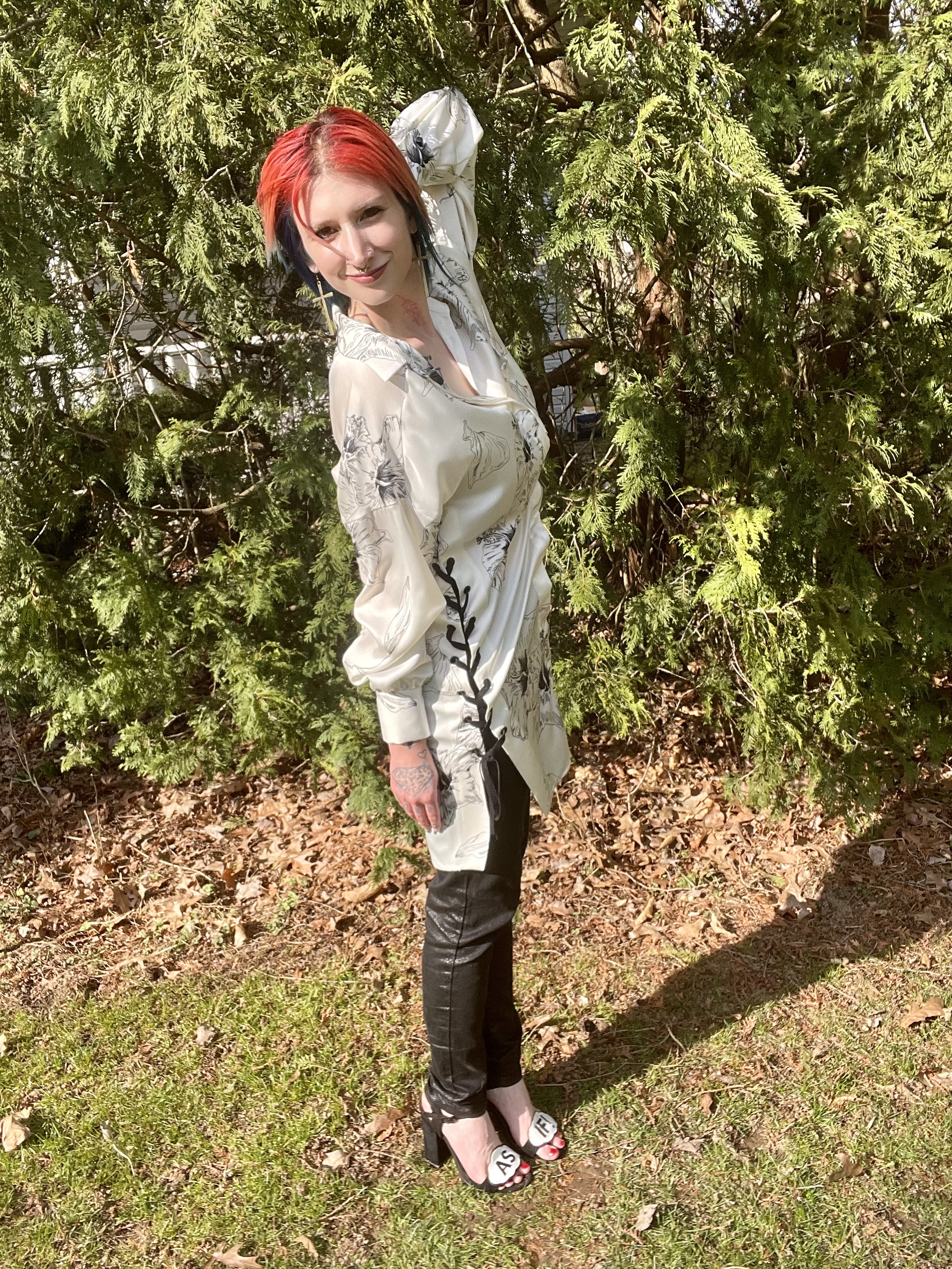 Before we talk about the build of this OOTD, can we please talk about this dress? I find it to be so striking and it felt SO good to finally be able to wear it! The silky material, the stark white with the black flower sketches, and those corset sides? Forget about it! I also just love the flowy sleeves that taper into a tight cuff at the wrists. This dress is full of surprises everywhere you look and is an ideal option to welcome springtime.