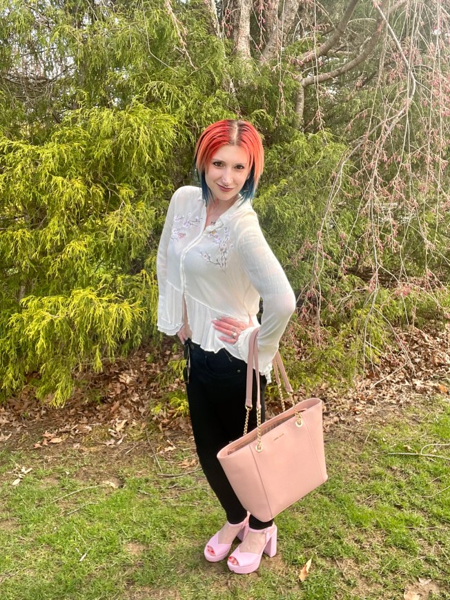 Brand new black skinny jeans by 1822 Denim were definitely the move for this look so it was onto shoes and accessories. As per my pop of color selection, I paired this fit with a darling pair of Barbie pink platforms by Mark Fisher. These heels are sweet as can be and I am always so excited to bust out the platforms again as they are my favorite style of shoe for spring and summer. In terms of jewelry, I didn’t want to crowd the look so I simply put on a pair of dangly crosses. I completed this fit by slinging my beautiful Anne Klein purse (A Christmas gift from my in laws!) over my arm. Even though all of the pinks in this look aren’t a perfect match, that’s okay. They were close enough and that was good enough for me for this fit that is just right for a spring day!