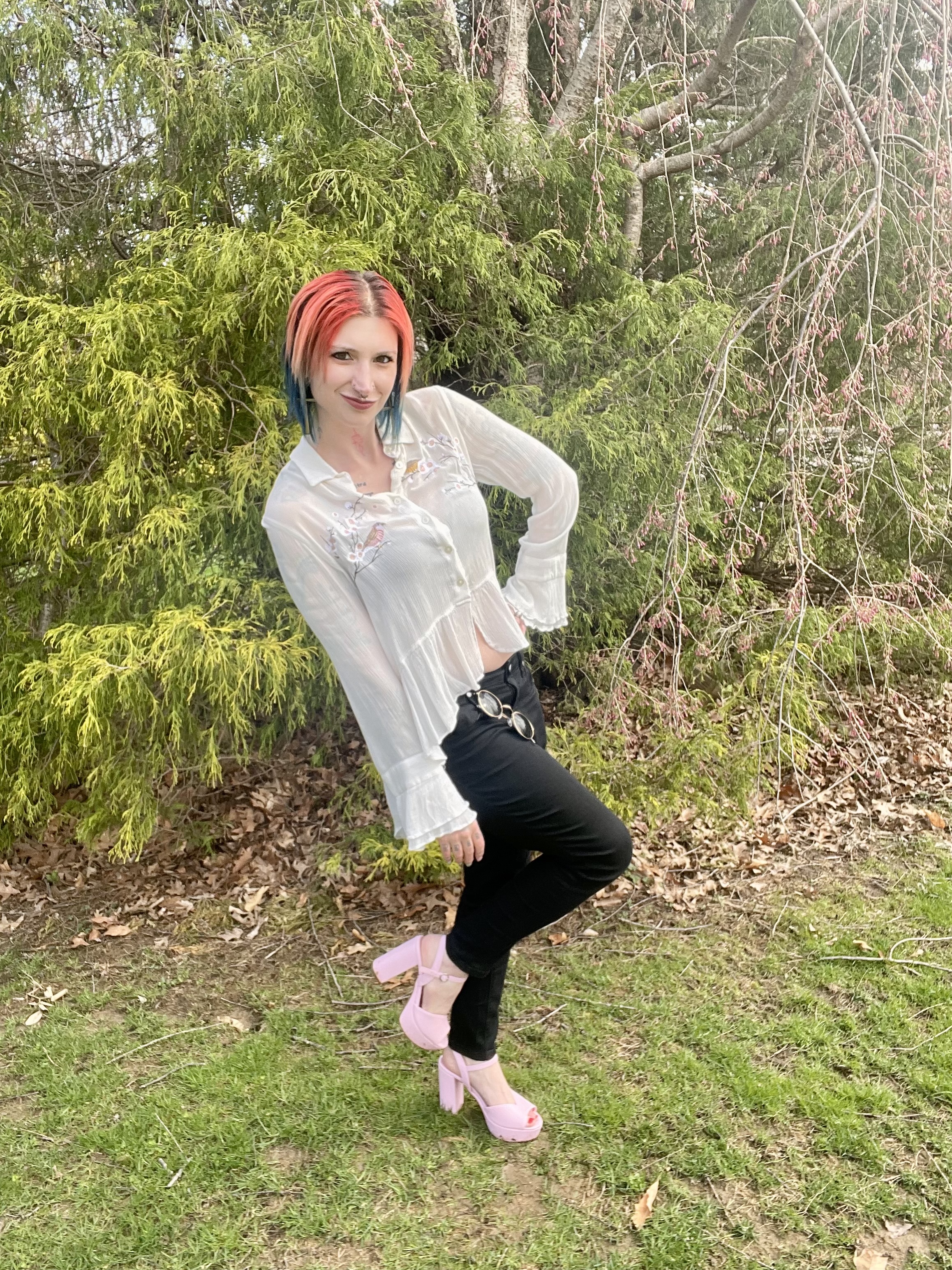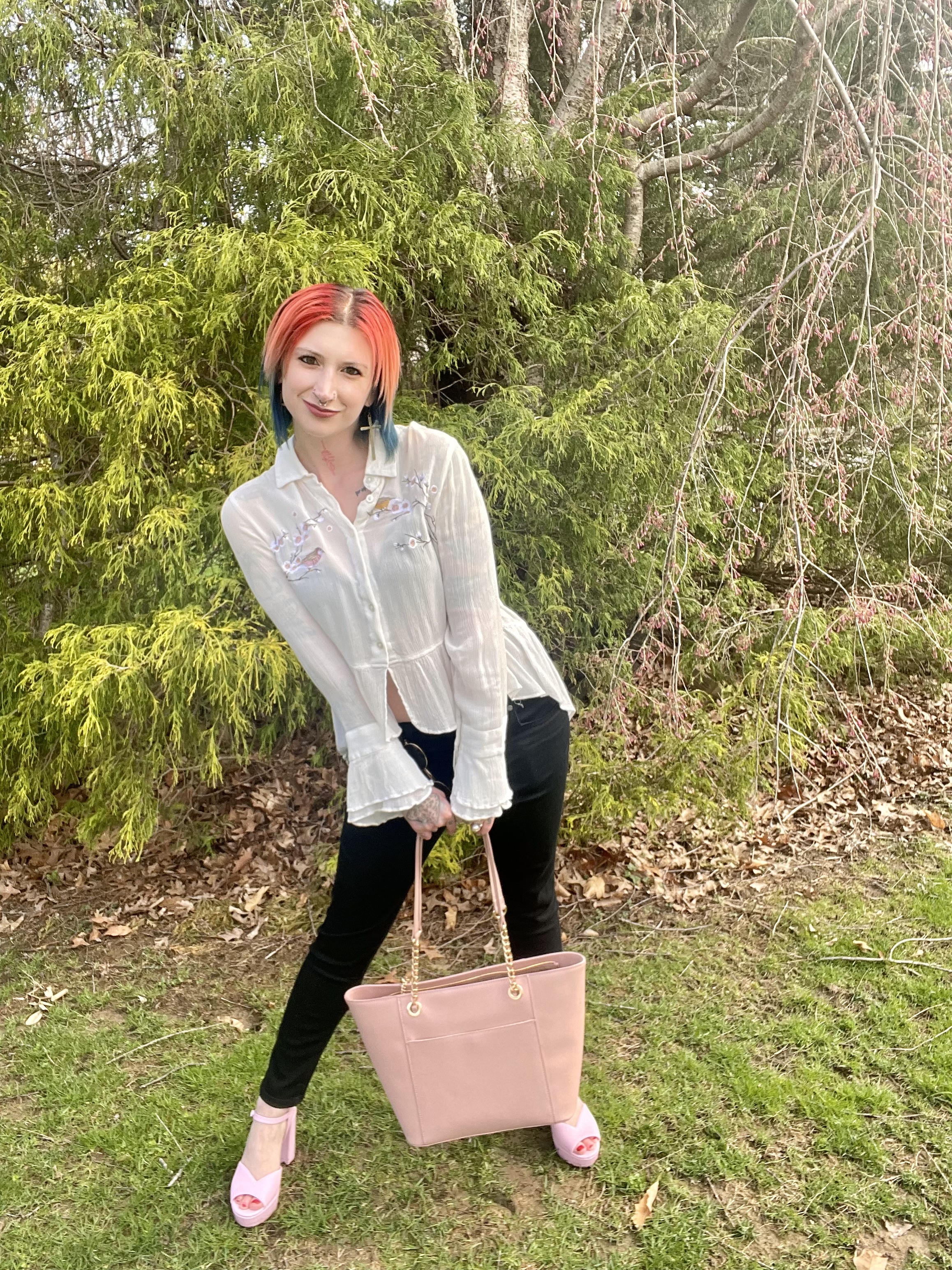 As I was going through my mental Rolodex of spring clothing, I locked in on the adorable embroidered button down by Lauren Conrad. This shirt is old AF but I still remember the high of that purchase from Kohl’s fondly because it was on clearance for five dollars. You can’t beat that!! This top is spring to the T. I love the gauzy material that provides so much pretty movement and the embroidered birds and flowers are the perfect spring pattern. The pink in the flowers also provided me with the ideal pastel hue to pull from as I accessorized the look.
