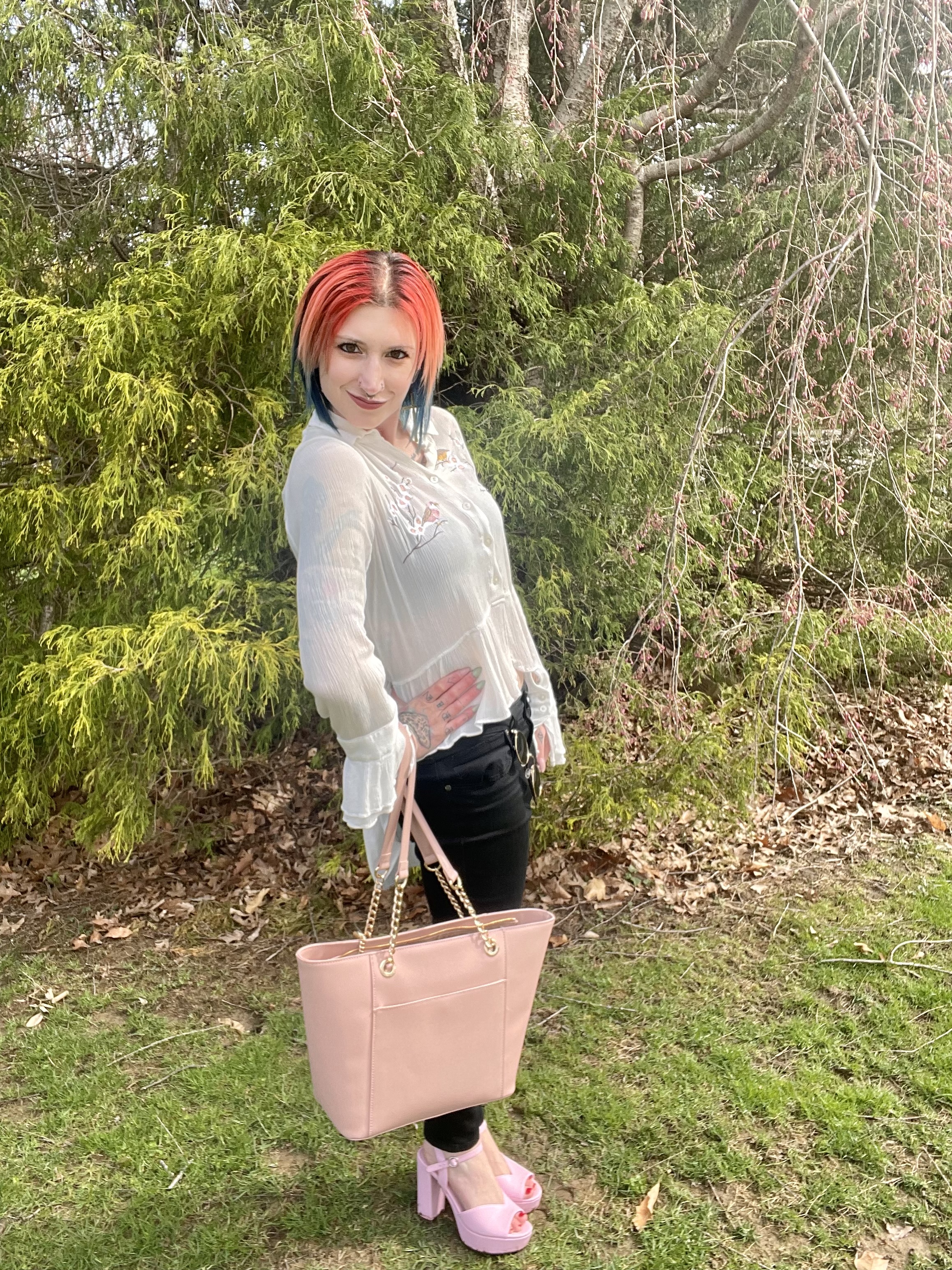 Brand new black skinny jeans by 1822 Denim were definitely the move for this look so it was onto shoes and accessories. As per my pop of color selection, I paired this fit with a darling pair of Barbie pink platforms by Mark Fisher. These heels are sweet as can be and I am always so excited to bust out the platforms again as they are my favorite style of shoe for spring and summer. In terms of jewelry, I didn’t want to crowd the look so I simply put on a pair of dangly crosses. I completed this fit by slinging my beautiful Anne Klein purse (A Christmas gift from my in laws!) over my arm. Even though all of the pinks in this look aren’t a perfect match, that’s okay. They were close enough and that was good enough for me for this fit that is just right for a spring day!