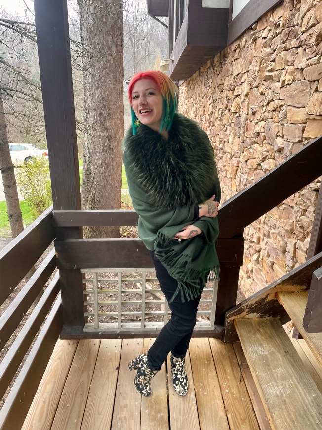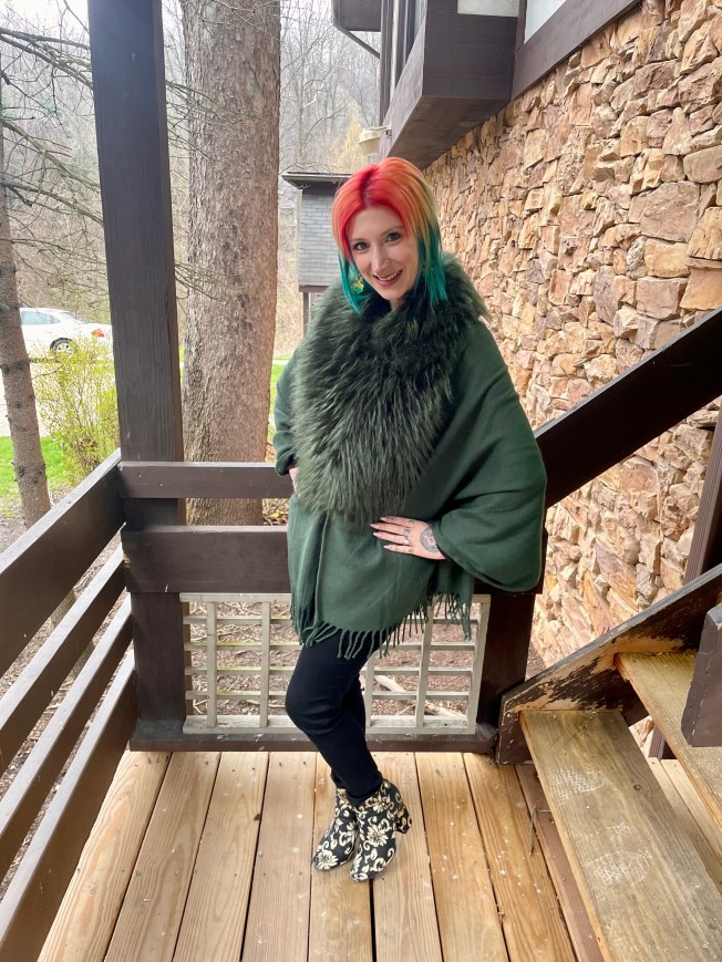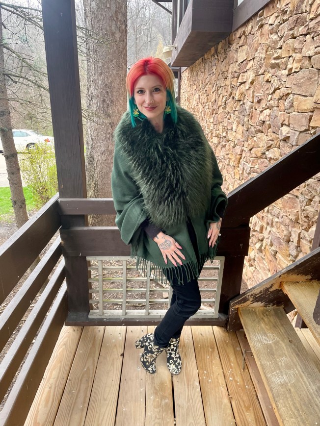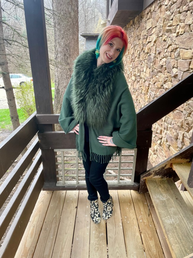 Green is one of my favorite colors but, surprisingly, my options for this look were very limited. I have a lot of spring and summer clothes in green but the weather on the day of the show was anything but warm! And, when I said my options were limited, I meant that there was literally only one thing that I could wear to brave the cold in: My green shawl with a faux fur collar. It really is the perfect shade of forest green, the faux fur added some drama for the theater, and hey – it made styling this outfit a breeze!
