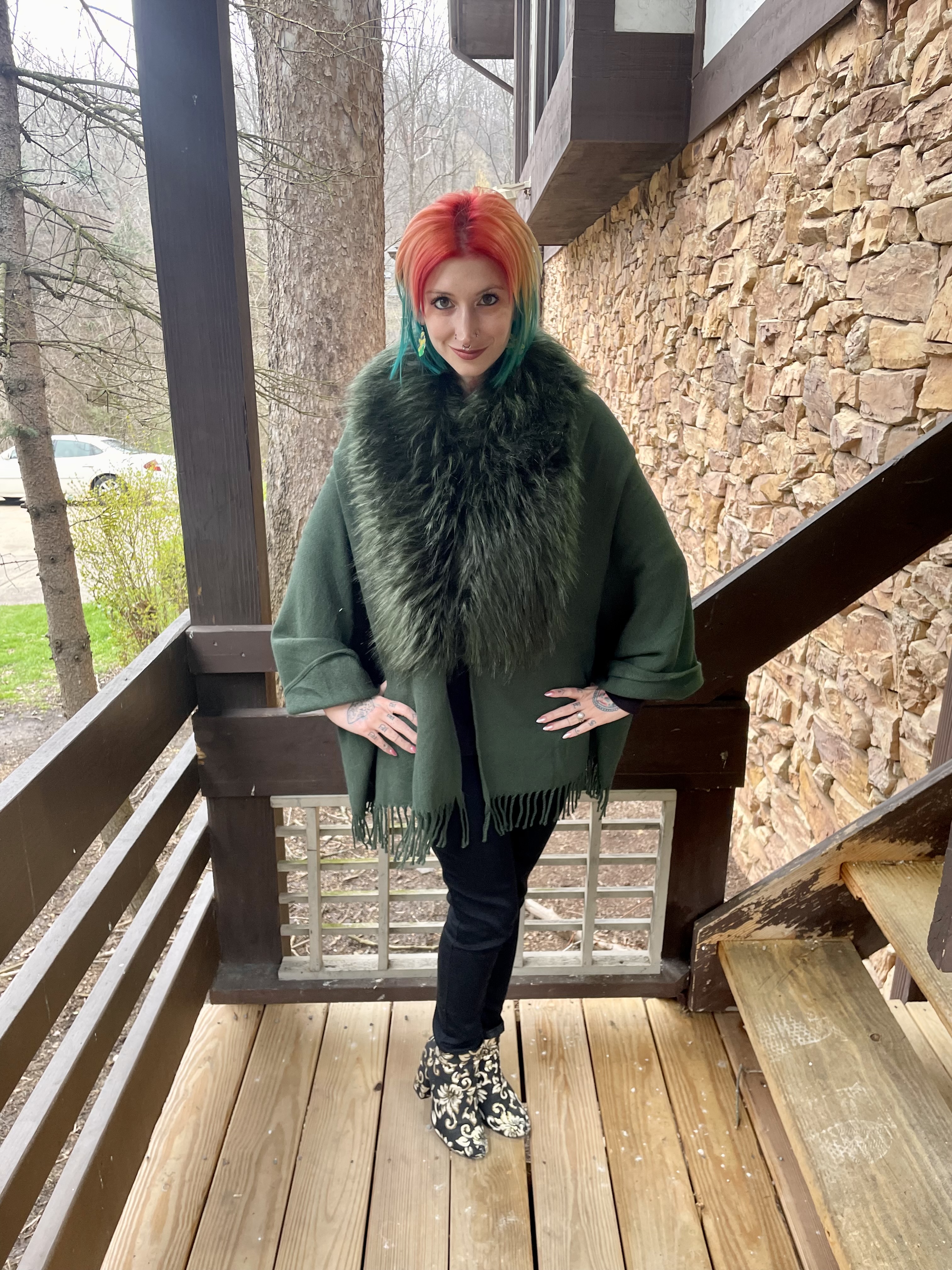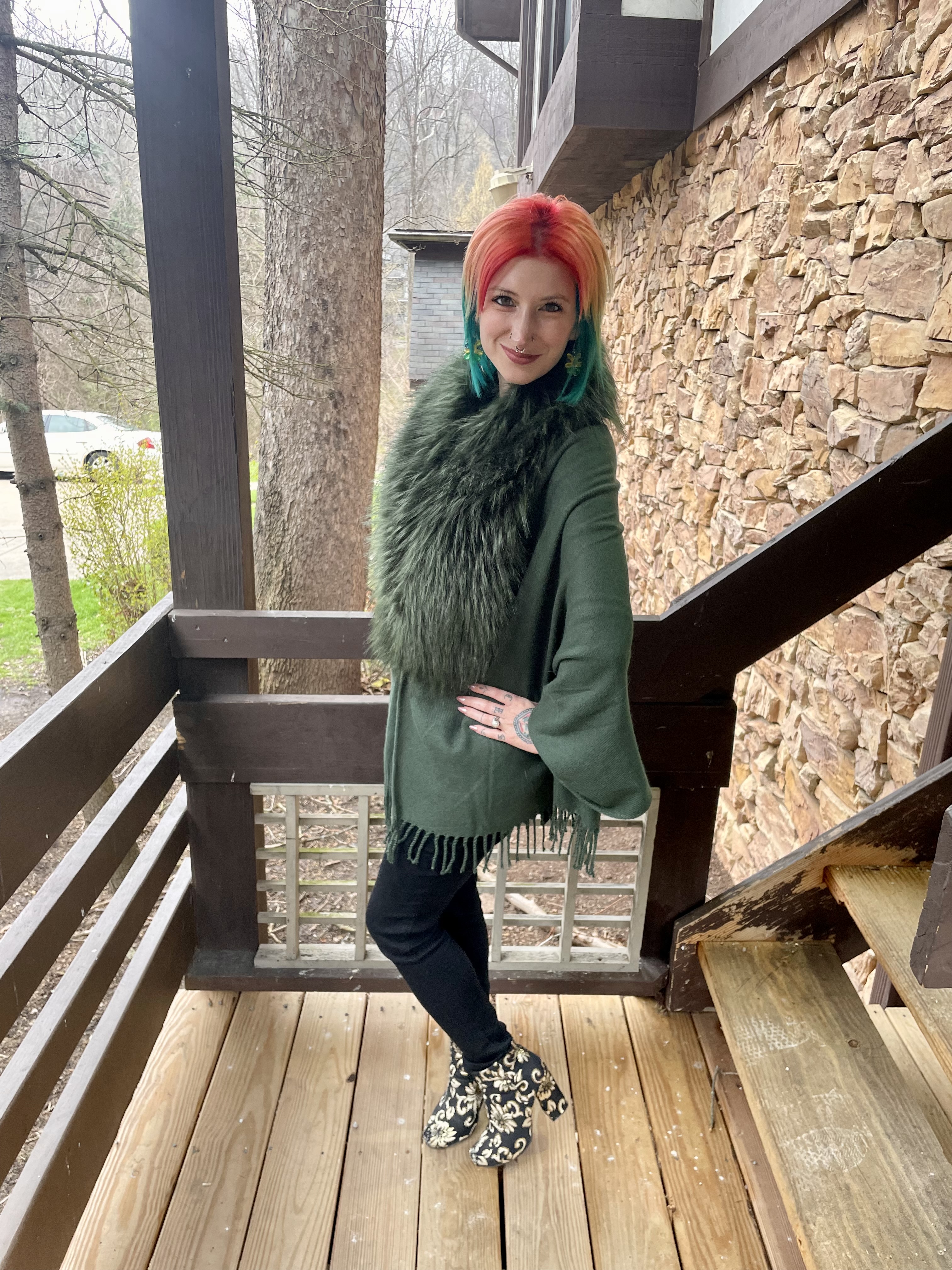 Green is one of my favorite colors but, surprisingly, my options for this look were very limited. I have a lot of spring and summer clothes in green but the weather on the day of the show was anything but warm! And, when I said my options were limited, I meant that there was literally only one thing that I could wear to brave the cold in: My green shawl with a faux fur collar. It really is the perfect shade of forest green, the faux fur added some drama for the theater, and hey – it made styling this outfit a breeze!