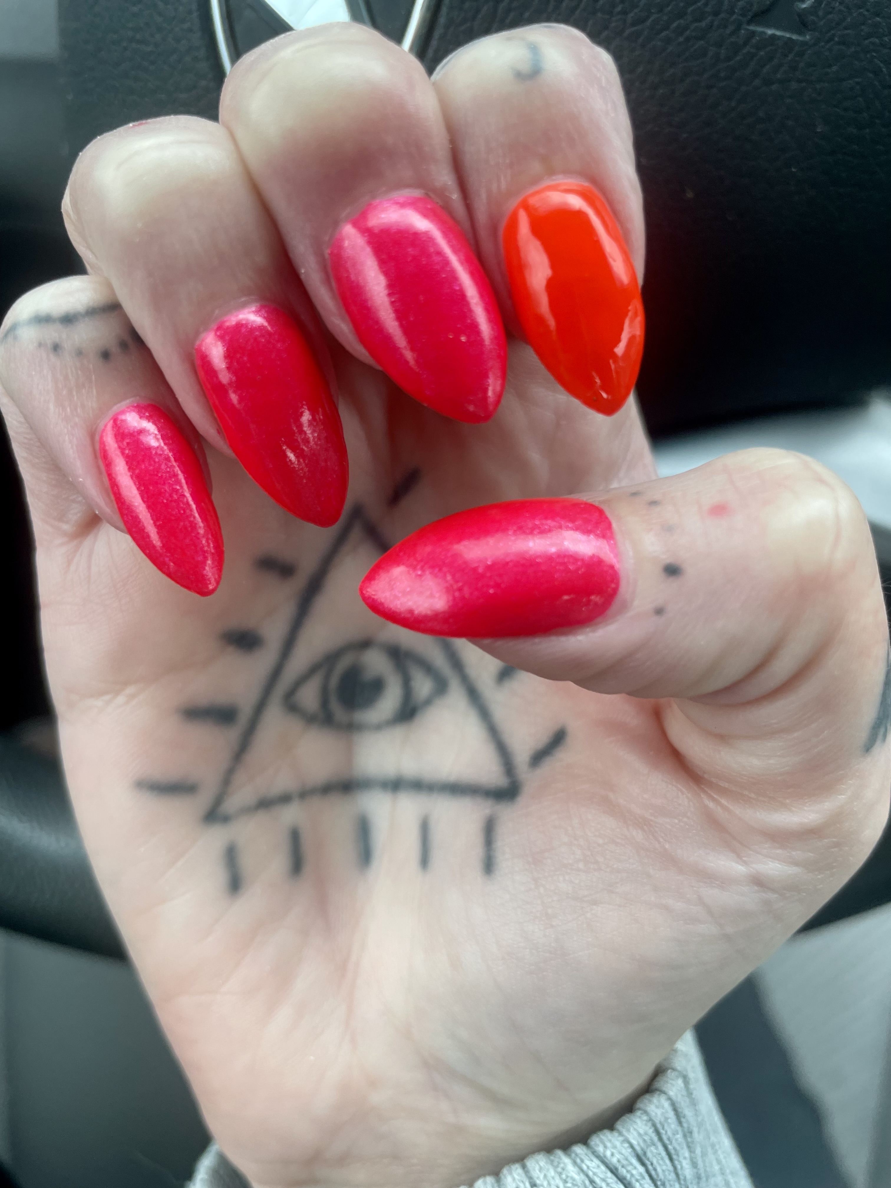 During my last fill, I was feeling an orange and pink combo. However, my tech showed me some brand new colors and I fell in love with the prettiest light pink and purple glitter polishes. I vowed to do the original colors I had in mind at my next appointment and it definitely made the daunting task of selecting nail polish a breeze! Granted, I couldn’t even remember the colors I was going to use but, hey, I knew it was orange and pink so anything in that realm would be close enough. I ended up with a shade called Cherry and another simply called Orange and we were in business! This is the perfect fruity and bright pairing to welcome warm weather with. Or, at least dream about because the weather has been crap lousy here. -_-