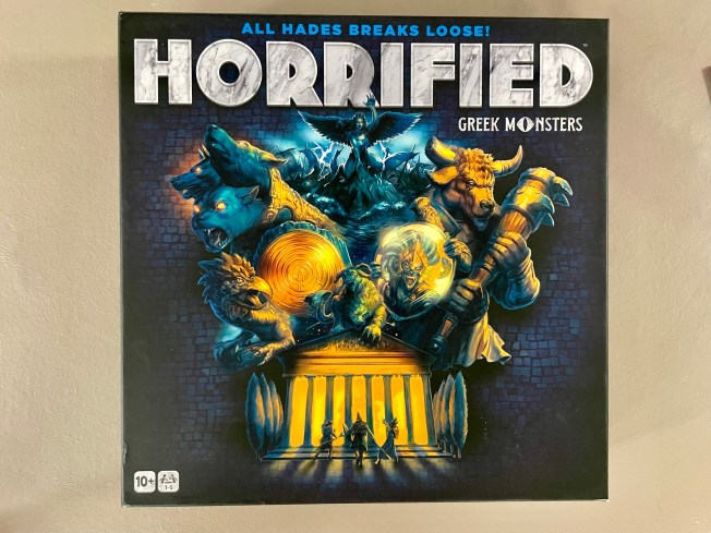 Hello!! One of mine and Johnny’s all time favorite board games is called Horrified. It is a co-op game where you have to save a village from classic horror movie monsters like Dracula, the Mummy, and the Wolfman. Each monster has specific challenges that you must complete to defeat them while still protecting yourself and the villagers on the board. It is a complete and total blast!! Johnny and I have played the original Horrified countless times and would often lament on our desire for new boards. You couldn’t imagine our surprise when we learned that there were three other expansions: American Monsters, World Of Monsters, and our newest addition – Greek Monsters!