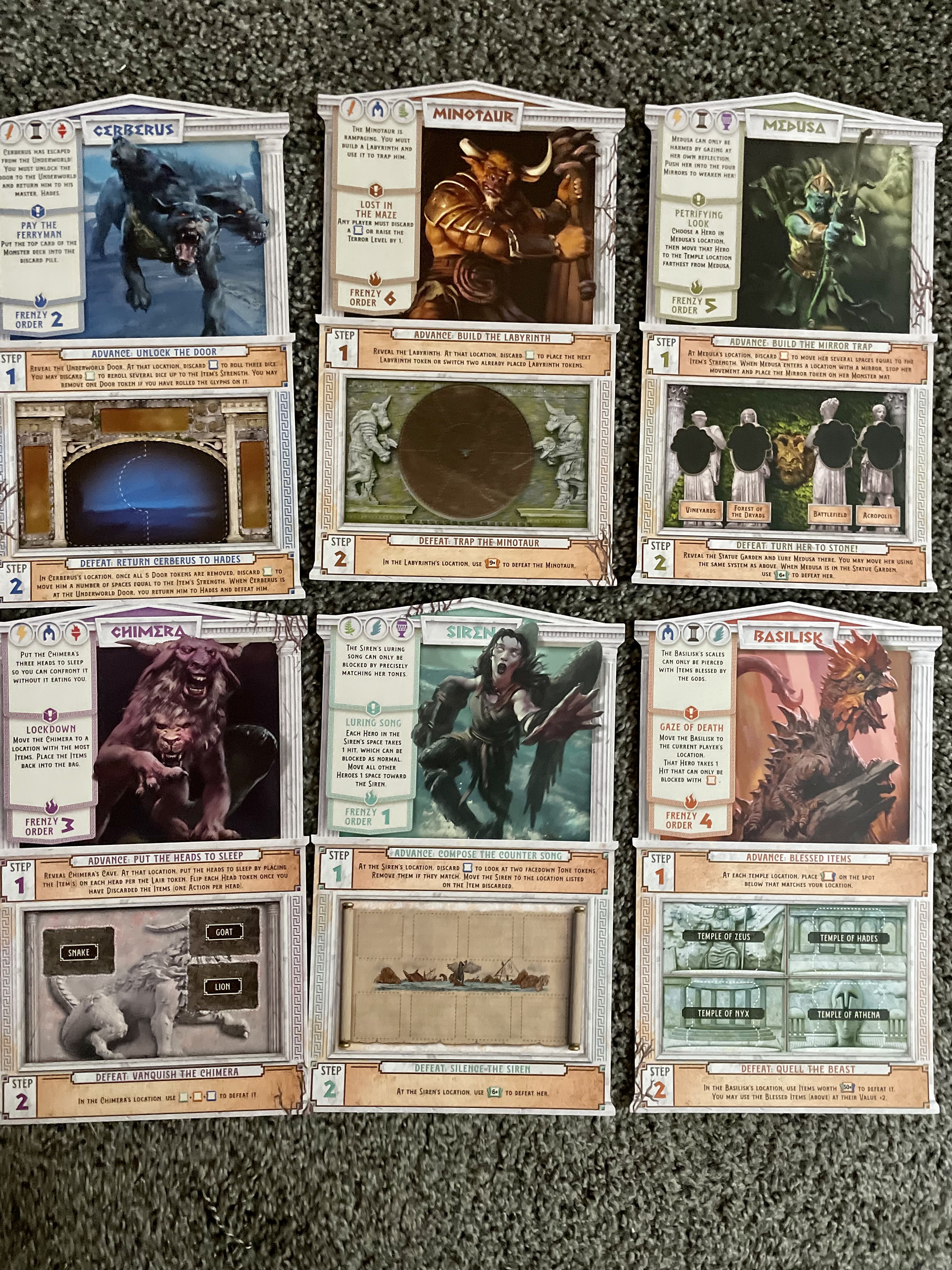 We are simply elated to have the completed set of Horrified and we busted out Greek Monsters for the first time this weekend. Also lol at the headline “All Hades breaks loose!”. The monsters for this board include: Medusa, Cerberus, Minotaur, Chimera, Siren, and Basilisk. As per the game’s recommendation, we started with the Cerberus and Basilisk and I am pleased to report that we dominated! Check it out: