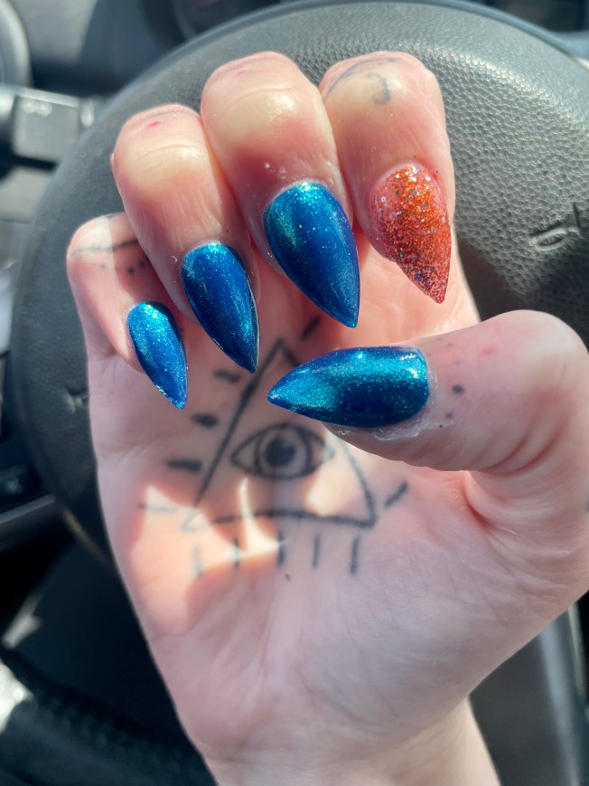 Whenever I get my nails done, I tend to just let the nail polish wall speak to me and choose colors on a whim. This time, though, I actually had a plan in mind. After receiving lots of tropical Bath & Body Works scents for my birthday, I had the beach on the brain hard. I was thinking of going with sand and surf vibes with a pretty blue and gold. The only problem was, I had been there done that and wanted to go with a similar idea with a twist. I fell in love with the most gorgeous mermaid blue hue I have ever seen (I am seriously obsessed!) and considered a few different options before landing on a glittery burnt orange. I am so glad I decided to shake things up because this is, easily, one of my favorite combinations in recent memory.