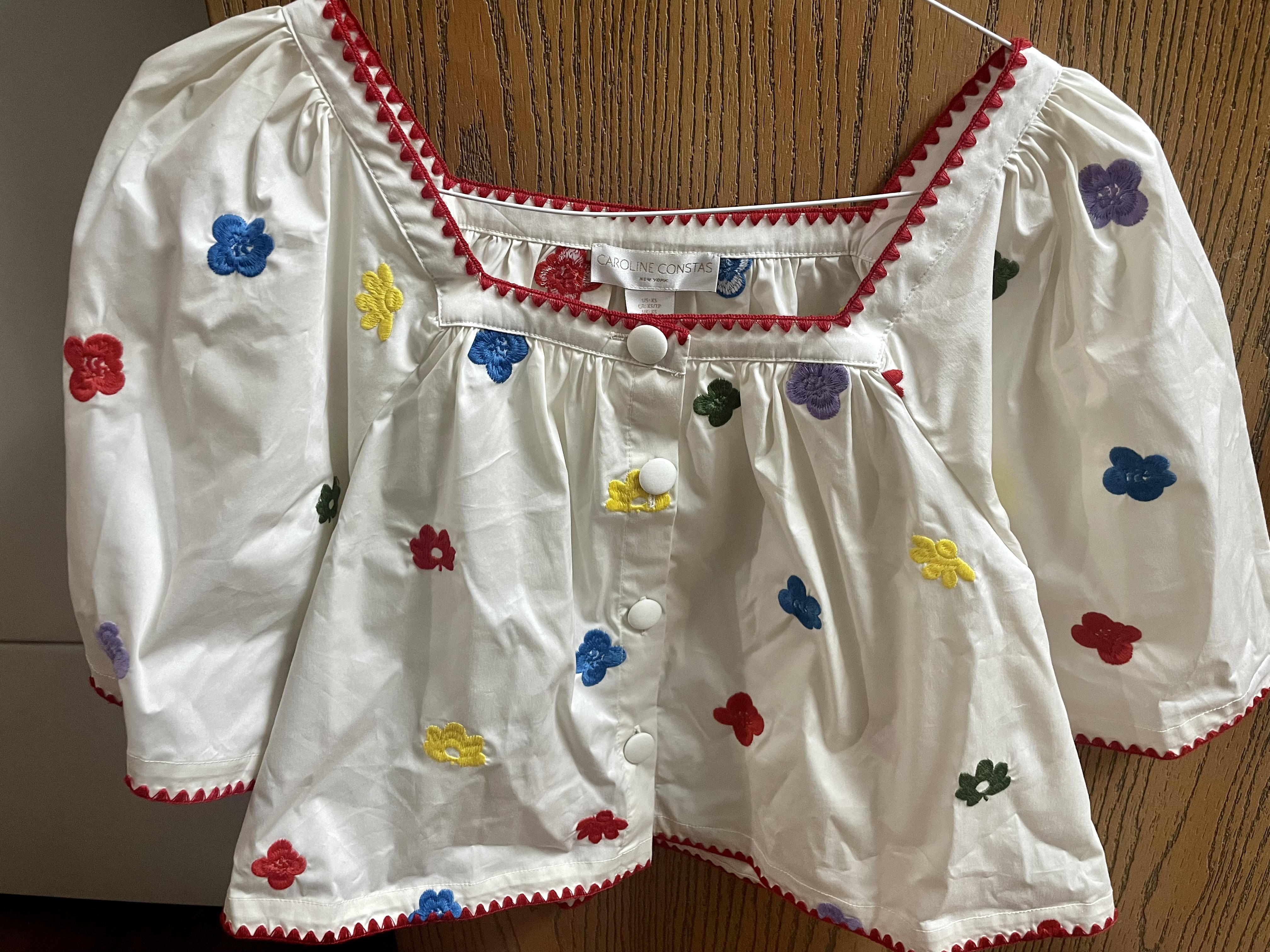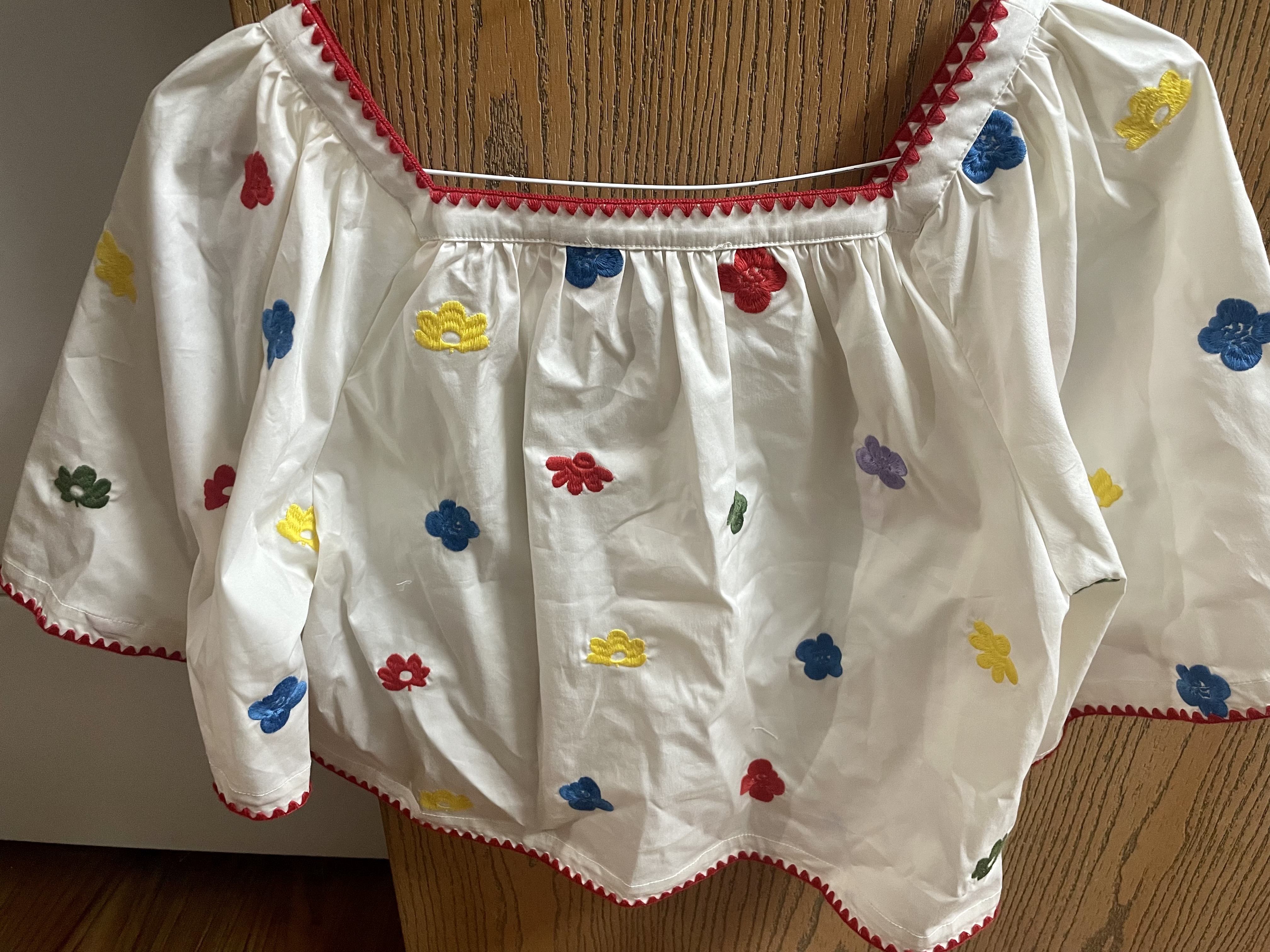 This cropped number is everything and it is so unique and adorable. The poppy embroidered flowers and red border over a stark white base remind me of an artist’s smock in the best way possible. And, of course, I loves me anything with balloon sleeves! This top screams fun in the sun and I cannot wait to pair it with sweet denim shorts and wedge sandals. It was a bit more expensive than I usually will spend for a top at thirty-five dollars, but it was worth every penny. There was no original price tag to compare to so I looked it up online and saw it for sale on Poshmark for one hundred and twenty-five smackers. Whatever it originally costed, I got it for a fraction of the price and you can’t beat that!