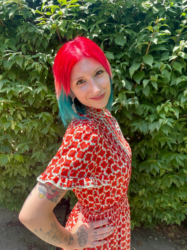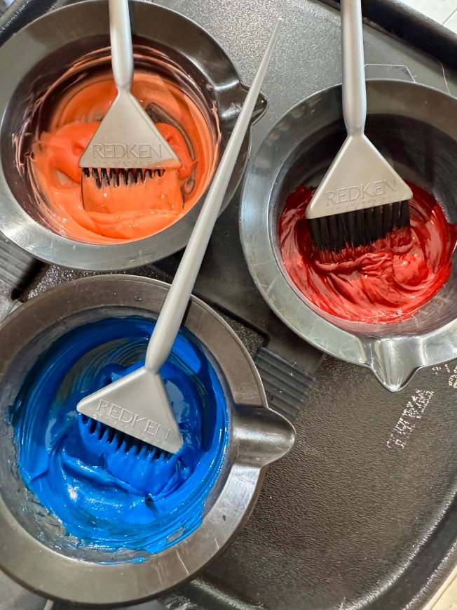The next step in picking colors was orange. In the OG version of this do, we only used Desert Sky and it was a lovely shade but quite muted. To kick things up a notch, Anna still used a base of Desert Sky but mixed it with a healthy dose of the neon orange Lava. This was much more like it and the orange against the turquoise is *chef’s kiss*. The final color to figure out was the blue. We were beyond obsessed with the beautiful Blue Muse from the OG but it faded out into green territory. To combat this, Anna added one drop of navy blue Nightfall into the Blue Muse dye to form a true blue hue. She also added the tiniest bit of Aquatic as we were fresh out of the Blue Muse and Nightfall combo before all of my hair was painted.