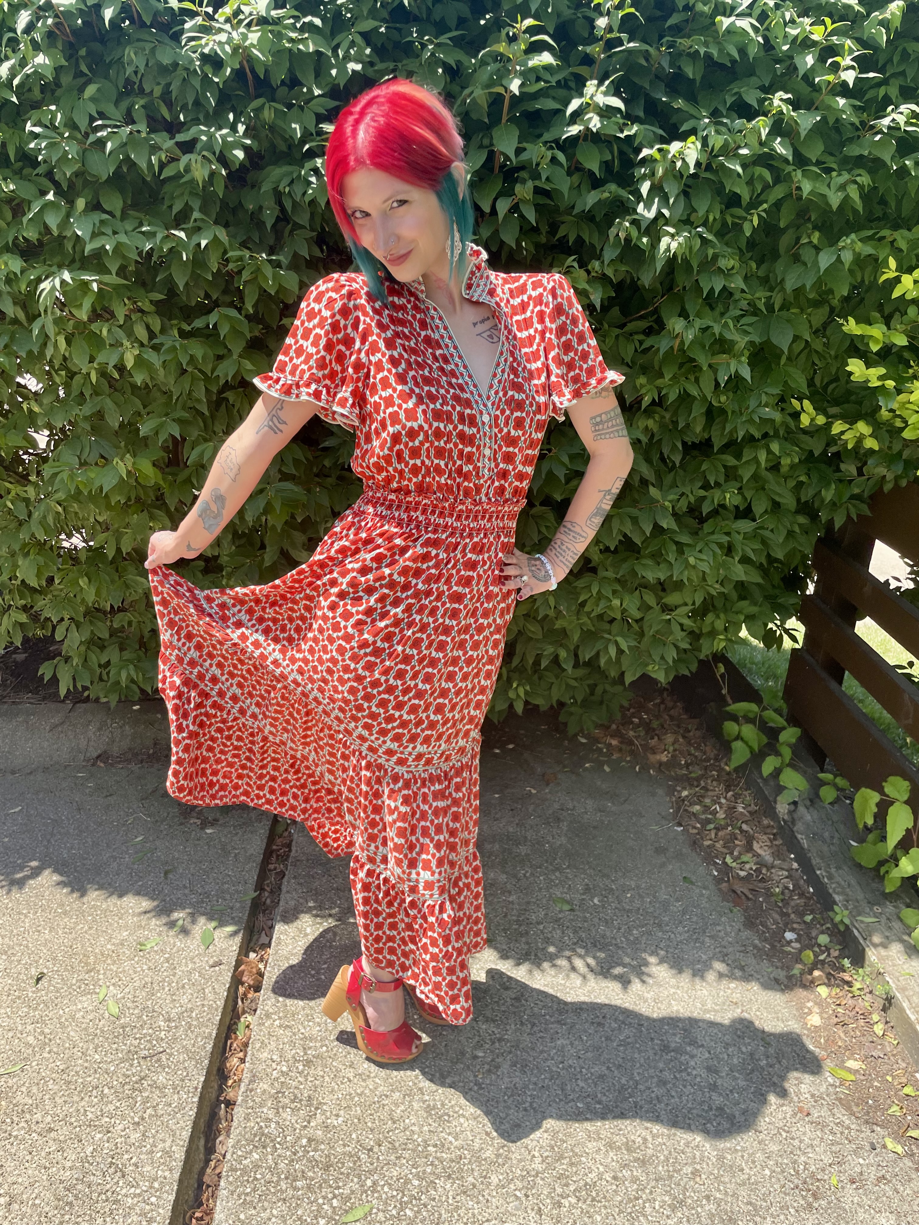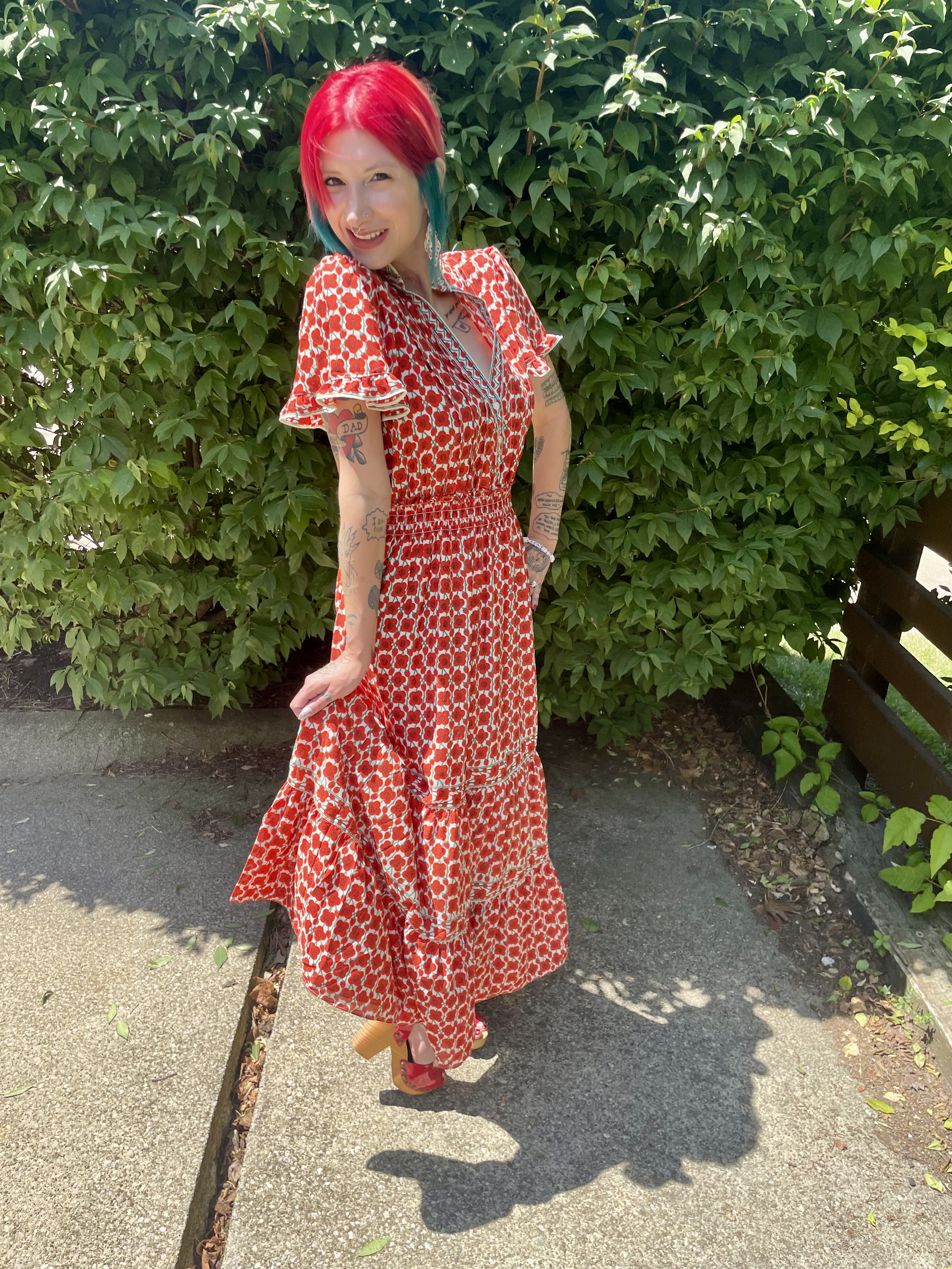 Maxi dresses are such a magical summer staple. They provide the most wonderful movement, are lightweight, and incorporate fash-ion into a season when basic essentials reign supreme. This Max Studio dress is, easily, the best maxi dress I have ever owned. The pattern is bold and bright, the ruffle sleeves and tiered ruffle skirt make me want to dance, and that rouched waistline provides an hourglass silhouette to keep me from drowning in fabric. From top to bottom, this dress is IT. The only thing it requires are accessories that enhance because this dress does all of the talking.