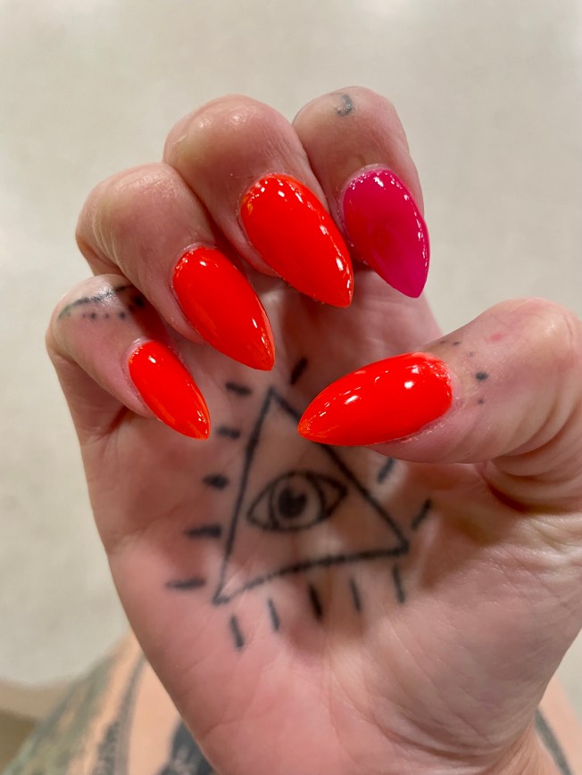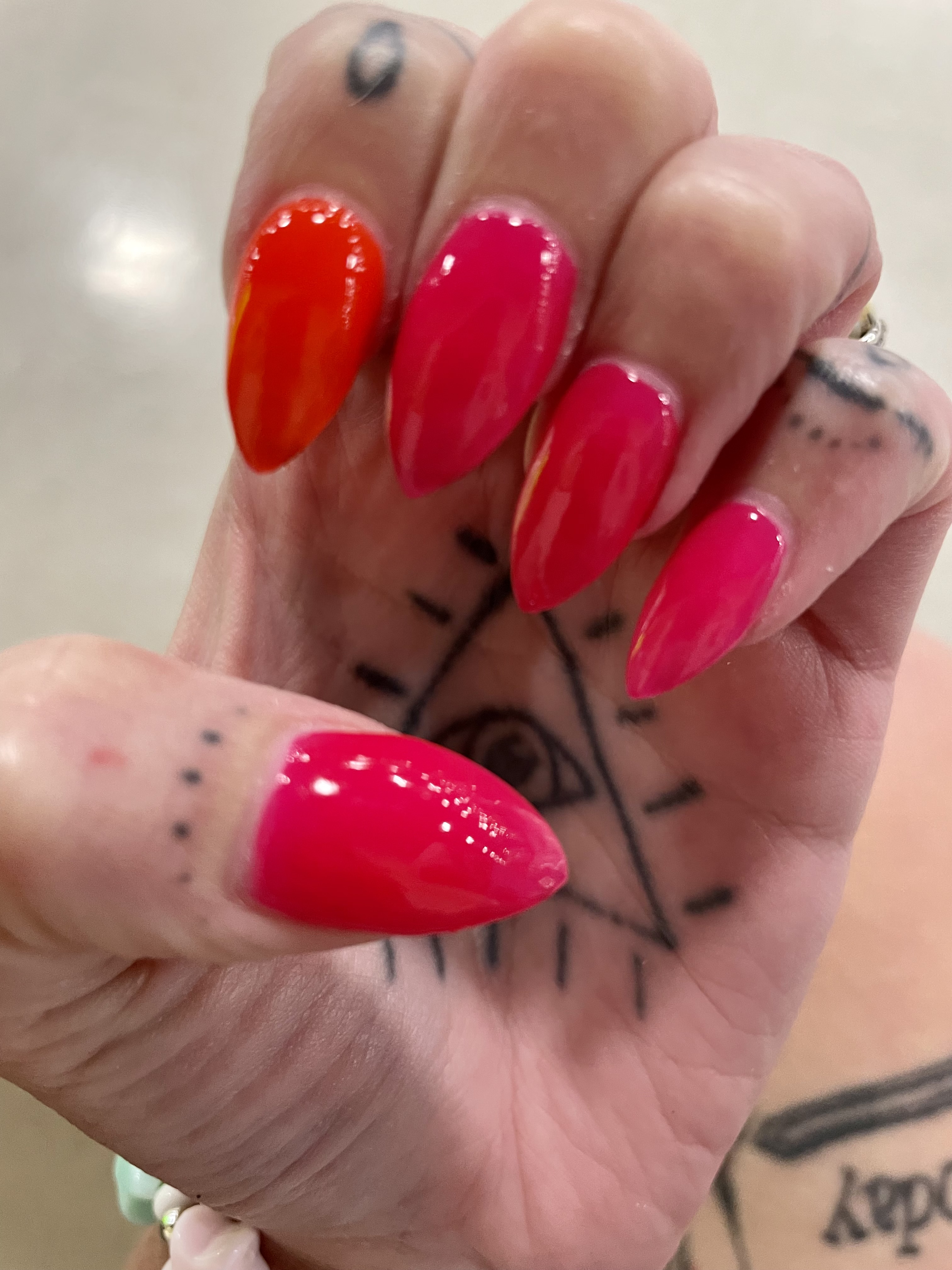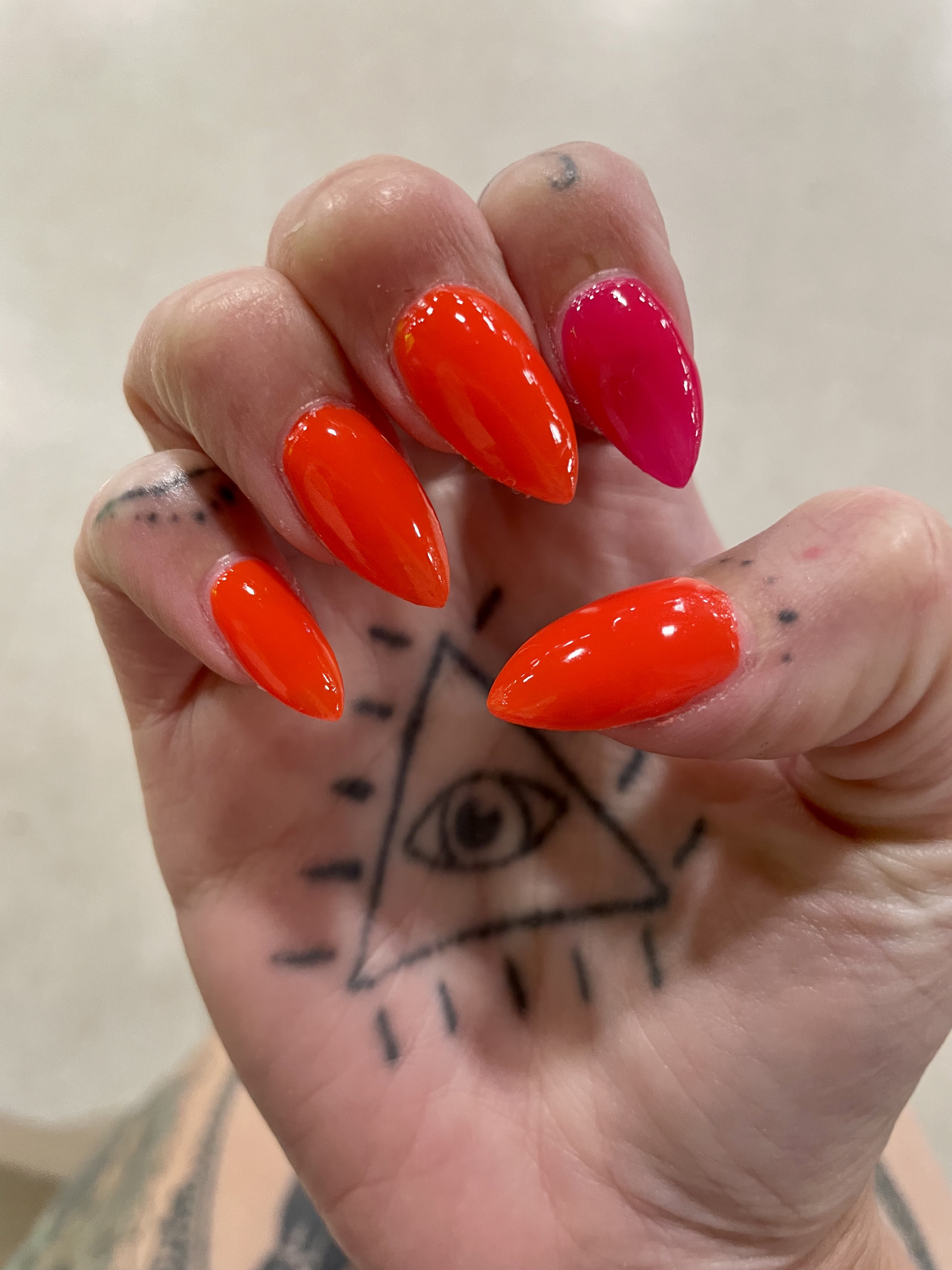 Elysian Nails has a nail polish wall and several books that are exclusive to gel and dip colors. Before, I would browse the polish wall for my selection. My past two fills, however, I have been able to consult the books! Elysian recently got a collection of gel polishes with matching nail polish and I have loved exploring brand new colors. It was incredibly easy to make a decision on what colors I wanted to use because they were actually side by side in the book of beauty: A neon orange and pink. They looked so good paired together that I didn’t even bother thinking about other options!