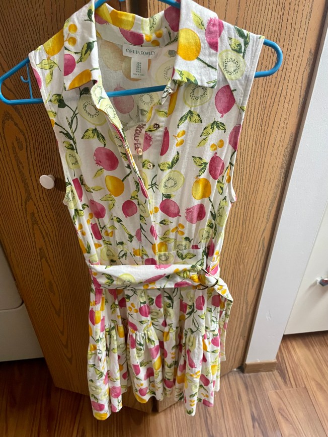 Hello! Johnny and I are attending an outdoor summer wedding of our dear friends and we couldn’t be more excited to celebrate such a wonderful couple! The wedding will take place on an almost ninety degree day and as you all know, Lil Red does not do well in extreme heat. For this reason, every dress I had in mind to wear went straight out the window because they were thicker in material or a maxi style. While I would have made do, I thought I would try my luck at TJMaxx to see if I could find something that would keep me more comfortable. During my last trip to TJs, everything summer was getting marked down and I was hoping to find a dress on the cheap. The fashion gods truly smiled upon me because the dress I ended up with was the very last one I tried on! Check it out: