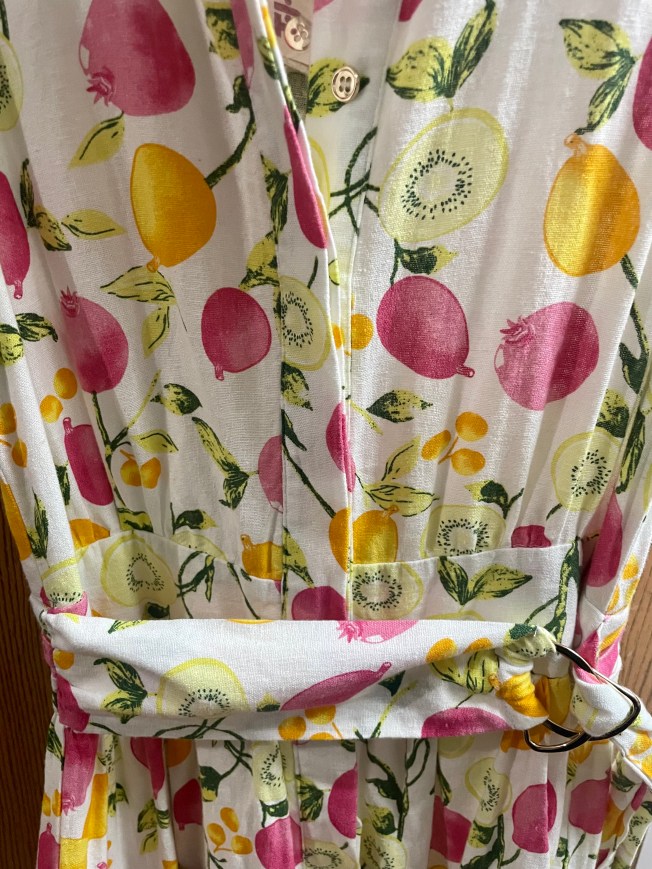 I was SO dead wrong and this is exactly why you never bypass Step 3! Sure enough, as soon as I returned to the dresses, it was like the pretty little Cynthia Rowley number magically appeared. I took a few other dresses to the fitting room and I shouldn’t have even bothered. This dress was last but certainly not least and it was perfect. The price was perfect too – it was only ten dollars!! My new dress is a linen material and it is nice and light and the pattern just screams summer. It is laden with kiwis, pomegranates, and oranges and is basically a fruit salad in a dress. Have I used the word perfect already? Yes, but I don’t care because it also perfectly compliments by orange and pink nails! It was like my trip to Elysian Nails was leading up to this fateful fitting room moment.