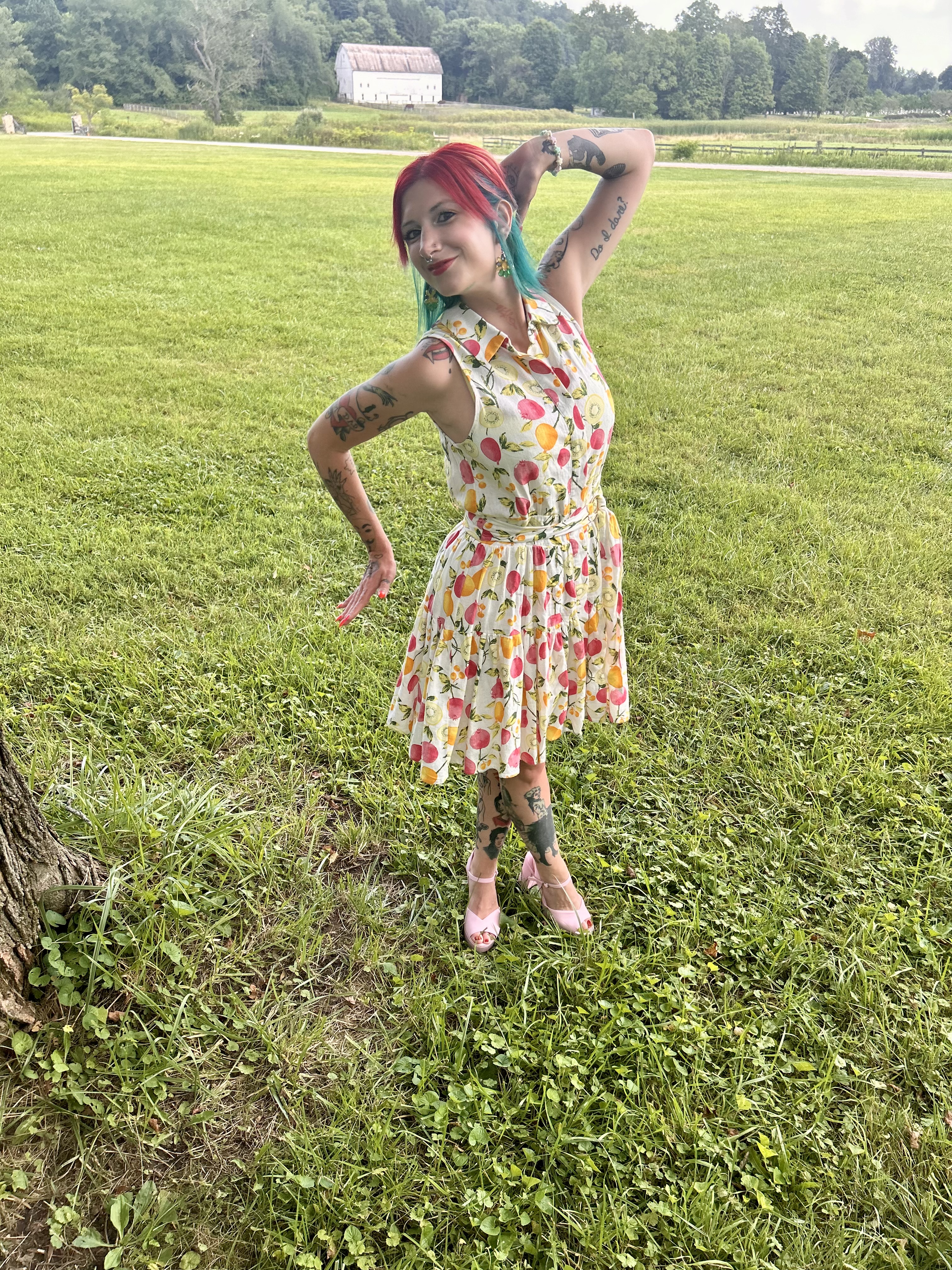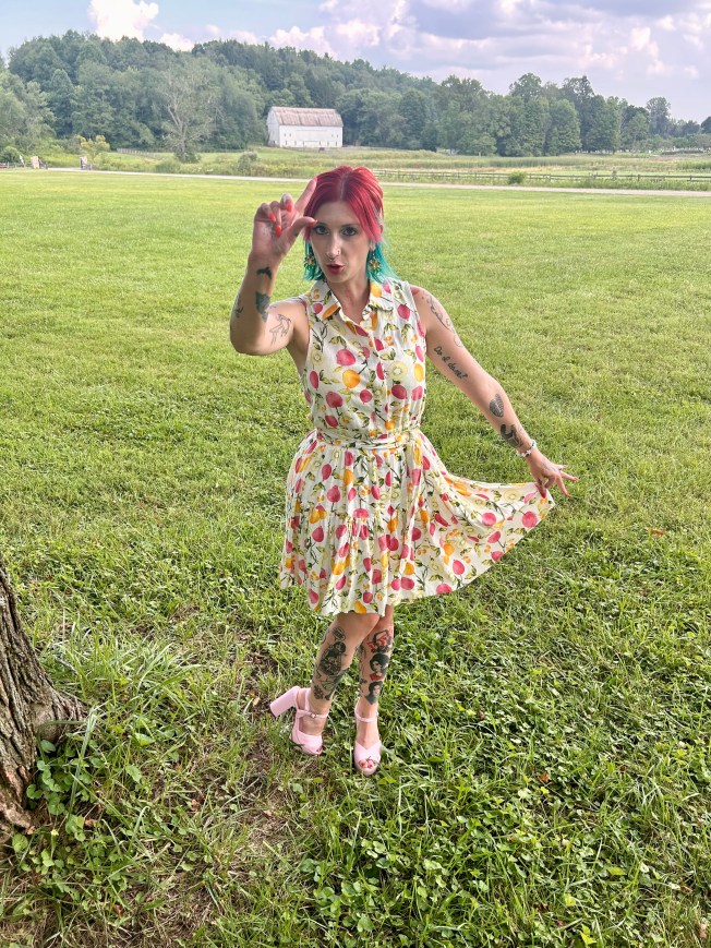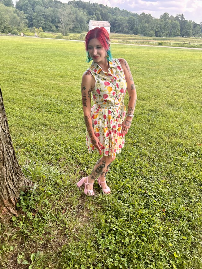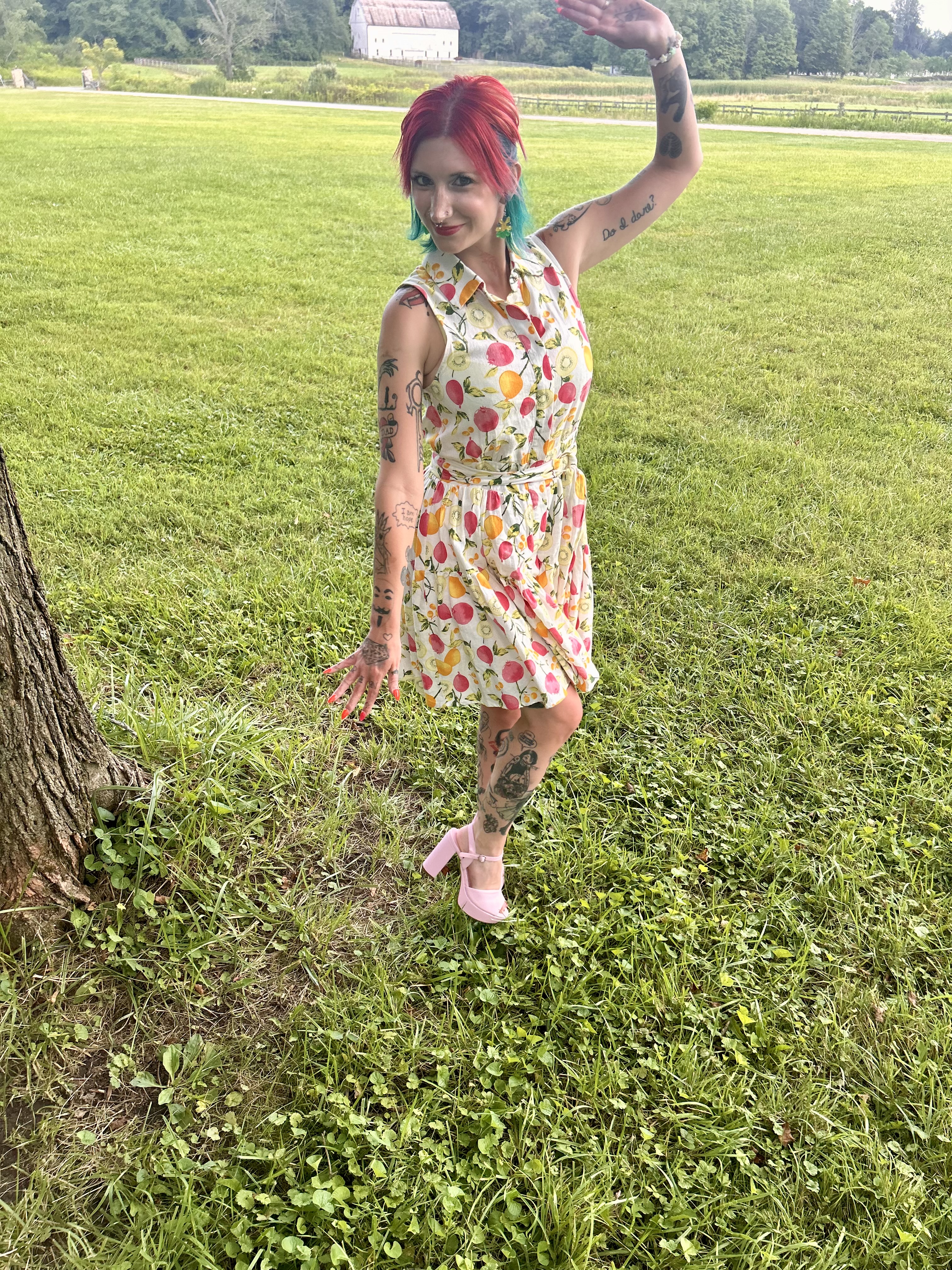 Hello everyone and welcome to the Blooper Reel from my Fruit Salad OOTD! This little look was worn to a beautiful summer wedding and it was the absolute best time. This is only the second wedding Johnny and I have attended in the six years that we have been together and all I can say is that I hope all of our other friends get married soon. If they want to, of course! Johnny and I truly come alive at a function and this wedding was so top tier. It was such a joy to be surrounded by all of our friends and so much love! I don’t have much love for these yikes shots, though! Check it out:
