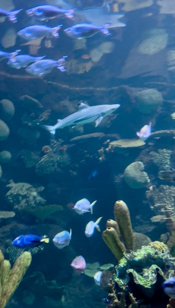 When you enter into the aquarium, you will find a touch tank for the kiddos and a few exhibits leading up to the piece de resistance. As you venture further, you are greeted by the huge tank that runs the length of the sizeable space from floor to ceiling. It was spectacular! We found several species of sharks, fish, and coral in the exhibit and myself and crew were amazed. To see the sharks gliding about, schools of fish traveling together, and a few cheeky fish playing hide and go seek in the coral was like having a view straight into the ocean. The tank was so big that we were seeing brand new things each time we stepped a few feet. Had this been our local zoo and not one two hours plus away, I think we would have sat on the movie theater style seats to kick back and enjoy the splendor. We had a lot of zoo to get through, though!