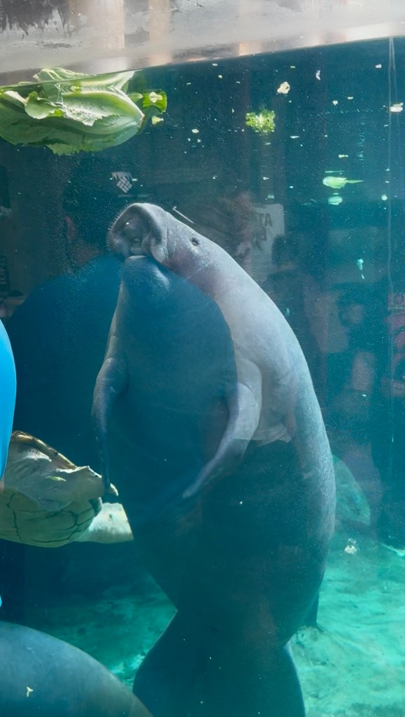 After we managed to peel ourselves away from the undersea show, we stepped into the next section for manatees, stingrays, and sea turtles. Once again, it was ginourmous and complete with mangrove trees! We arrived at the perfect time because it was snack time and all of us had to laugh. The sea creatures were snacking on hearts of romaine just like our bunnies! It was so funny to see the manatees swimming while munching away at the leafy greens that they held in their flippers. In fact, countless animals at the zoo were having a romaine treat and we would love to know what the zoo’s leafy green budget is. WAY more than the seven bucks Johnny and I spend every week and a half. 😀