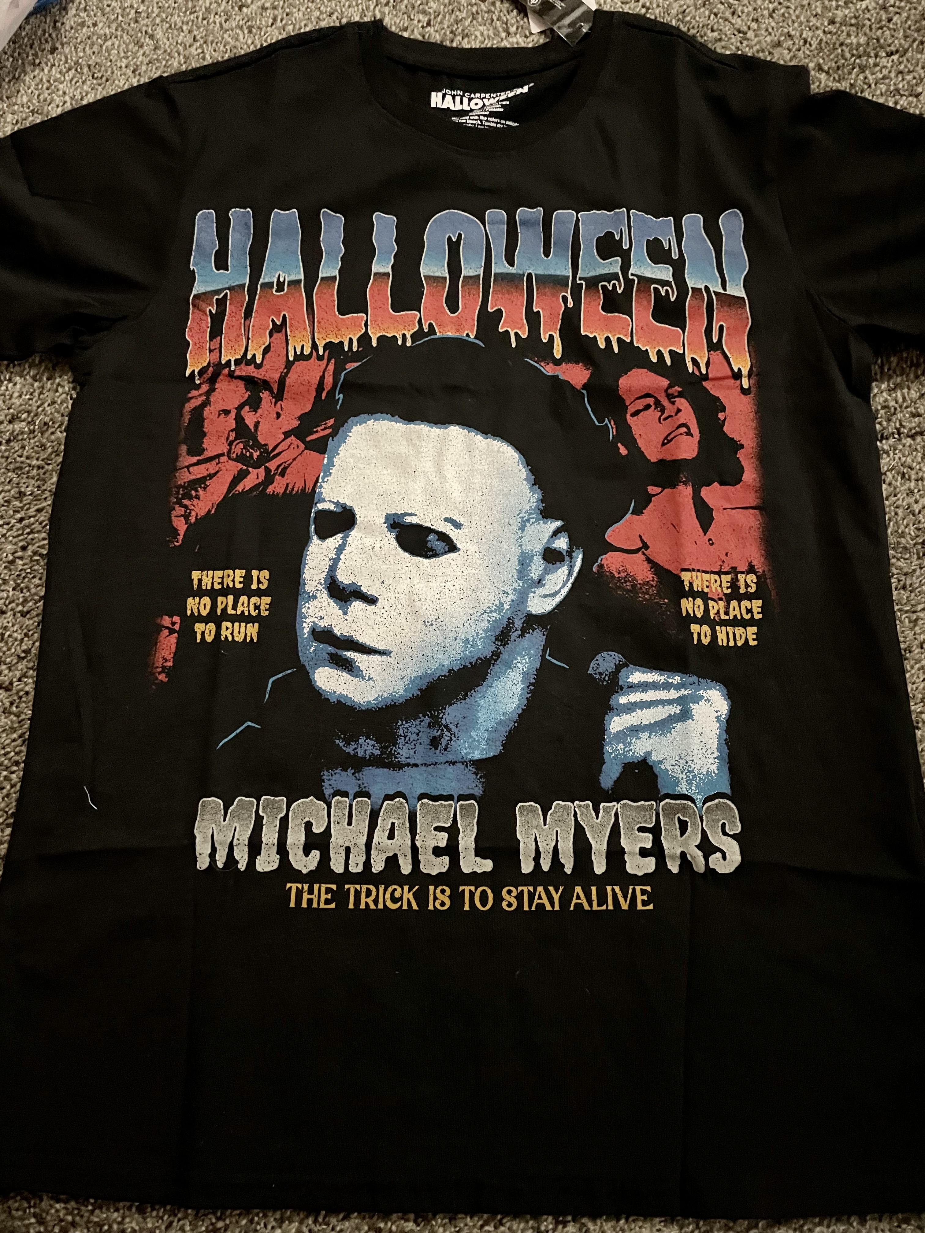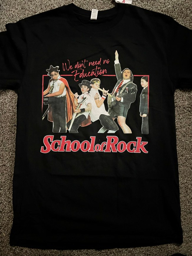 For Johnny’s treats, I was so excited to find a wicked cool Halloween shirt. I am a Texas Chainsaw Massacre girl, myself, but Johnny is a Michael Myers fan through and through and the original Halloween is his all time favorite. Also, peep that young Jamie Lee Curtis! Such a doll then and now. ❤ Another one of our favorite movies that has nothing to do with Halloween is School Of Rock and how amazing is that band tee?! Unfortunately, they didn’t have it in Johnny’s size so I got the next size up because I knew he would like it. He loved them both and wore his Halloween shirt to work the next day!