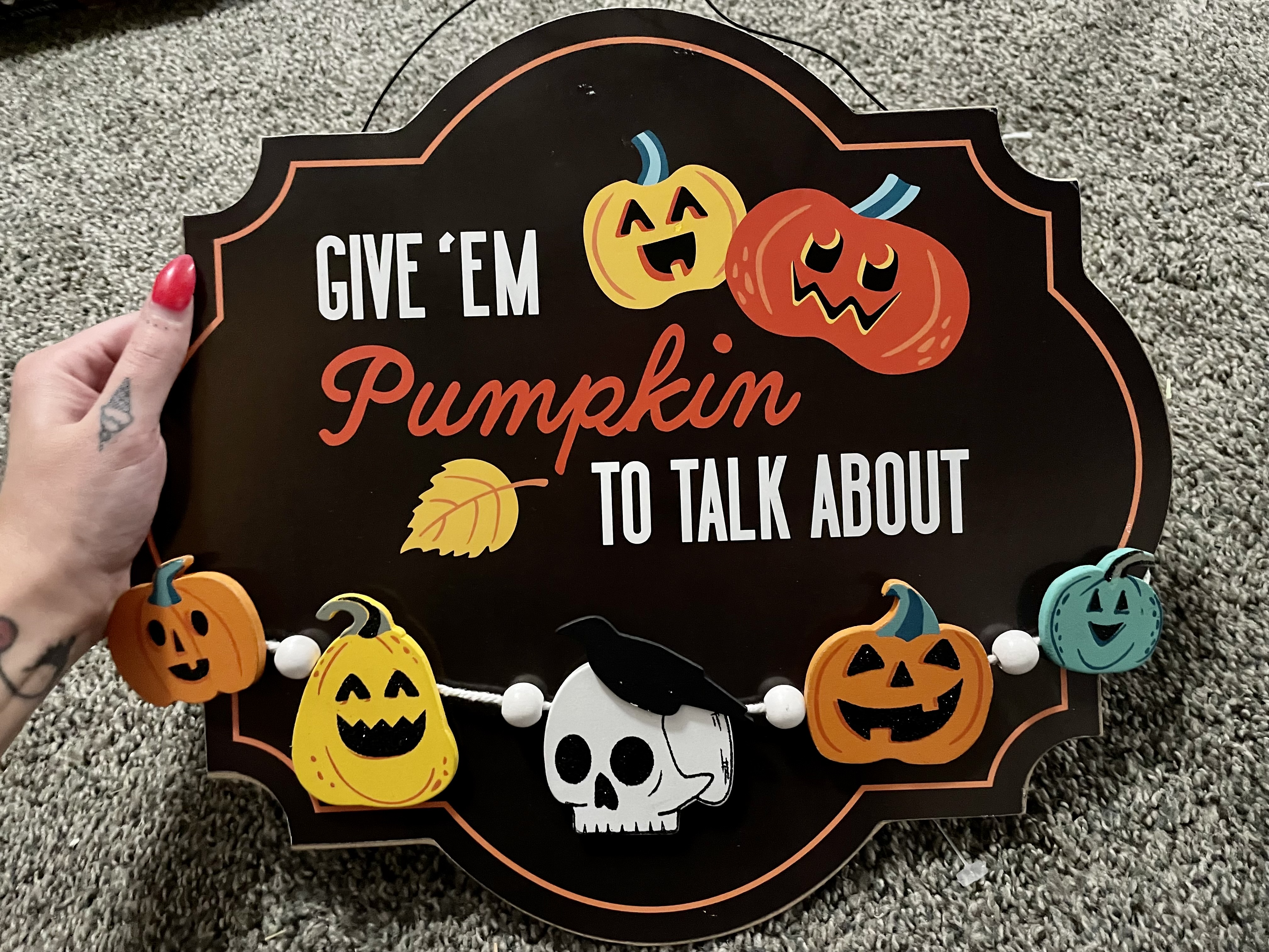 The last of my purchases is easily my favorite and gave me and Johnny a fit of laughter – a five dollar sign proclaiming “give ’em pumpkin to talk about” LOLOL. It’s a freaking HOOT and too cute to boot. I just love that spooky garland at the bottom! This is one of those sayings that I wish I came up with because I think it’s so damn clever and I live for a good play on words. In the past week, I have visited several different stores for Halloween decor and there is no way I would have found something so well made, sizeable, and cheap at any of them. Long live discount stores!!