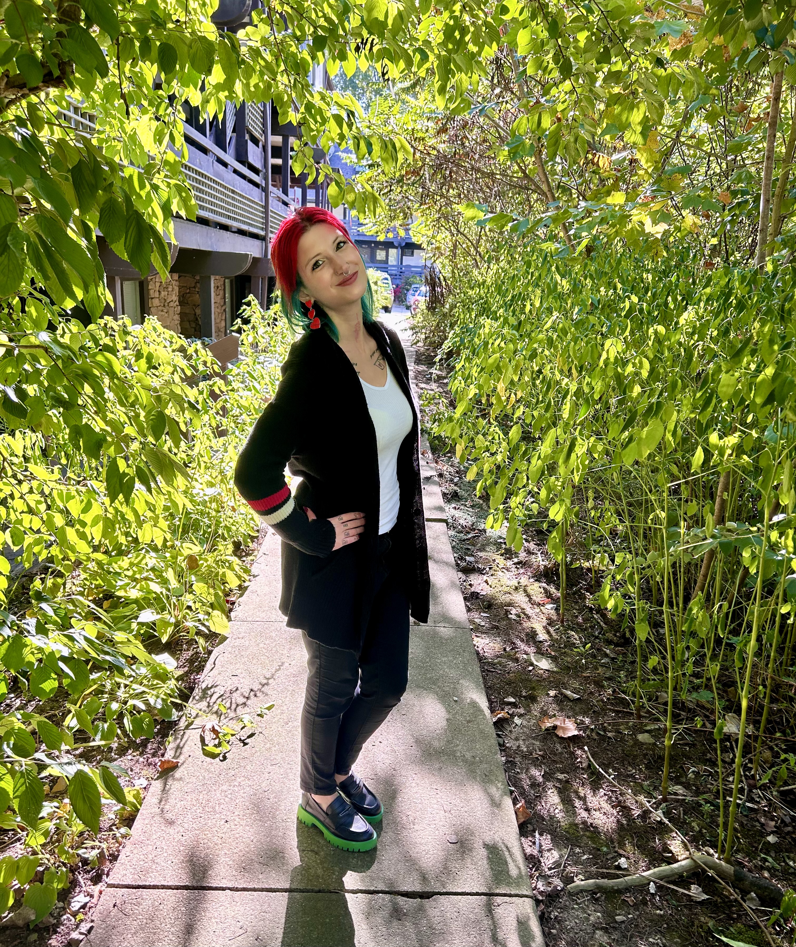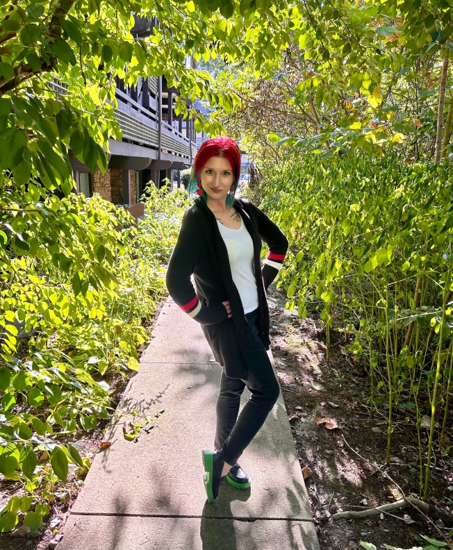 To wrap up this look, it was time for shoes and accessories. For shoes, I went for a super rad pair of wedge loafers by Steve Madden. I got these from Walmart and they were only twenty bucks which I thought was a total steal. They fit the color palette I was working with while providing a pop of color and the loafer style further enhanced the college cool aesthetic. These loafers are comfy AF and are probably the lowest heel of shoes that I own – it took me a minute to get used to the minuscule rise in elevation! To complete my fit, I put on a pair of dangly heart earrings to add some length to my neck as it was the only open real estate available. With that, I was ready for a shopping trip to The Bomb Shelter!