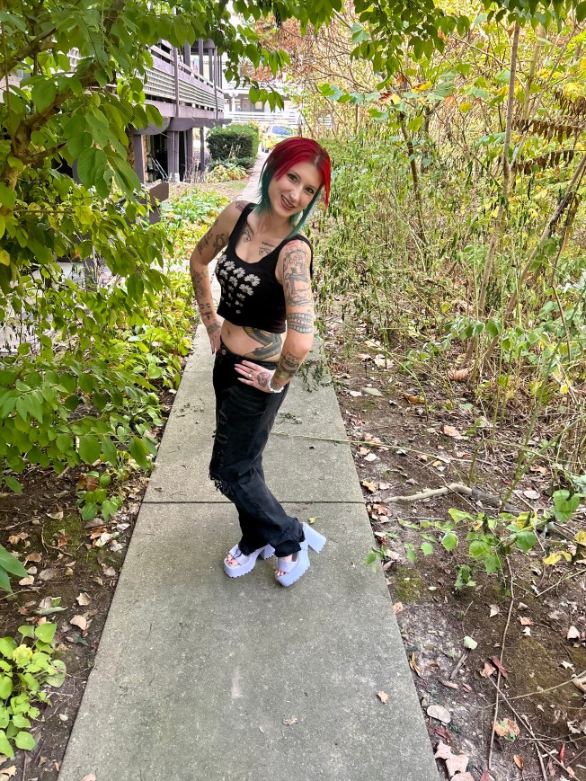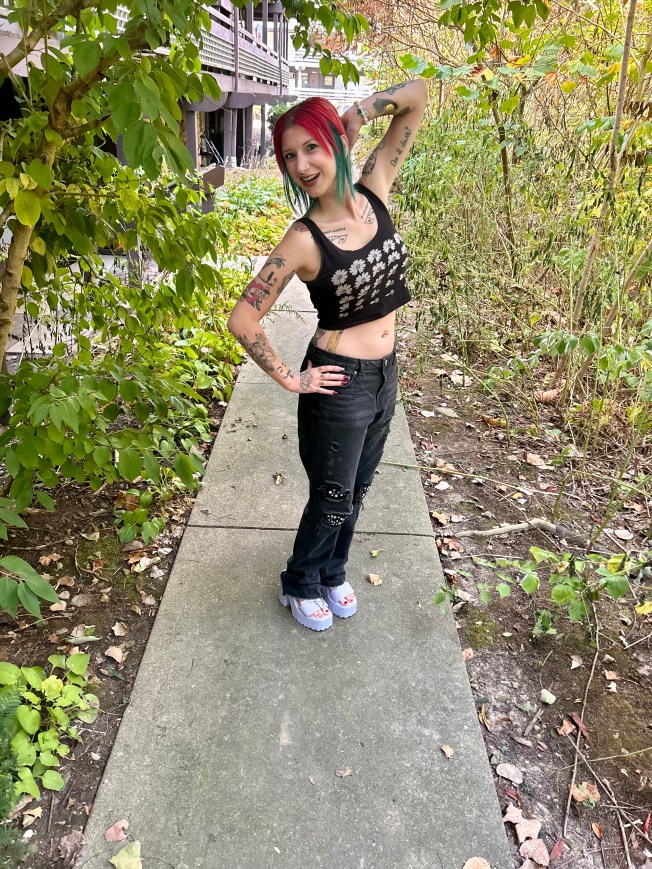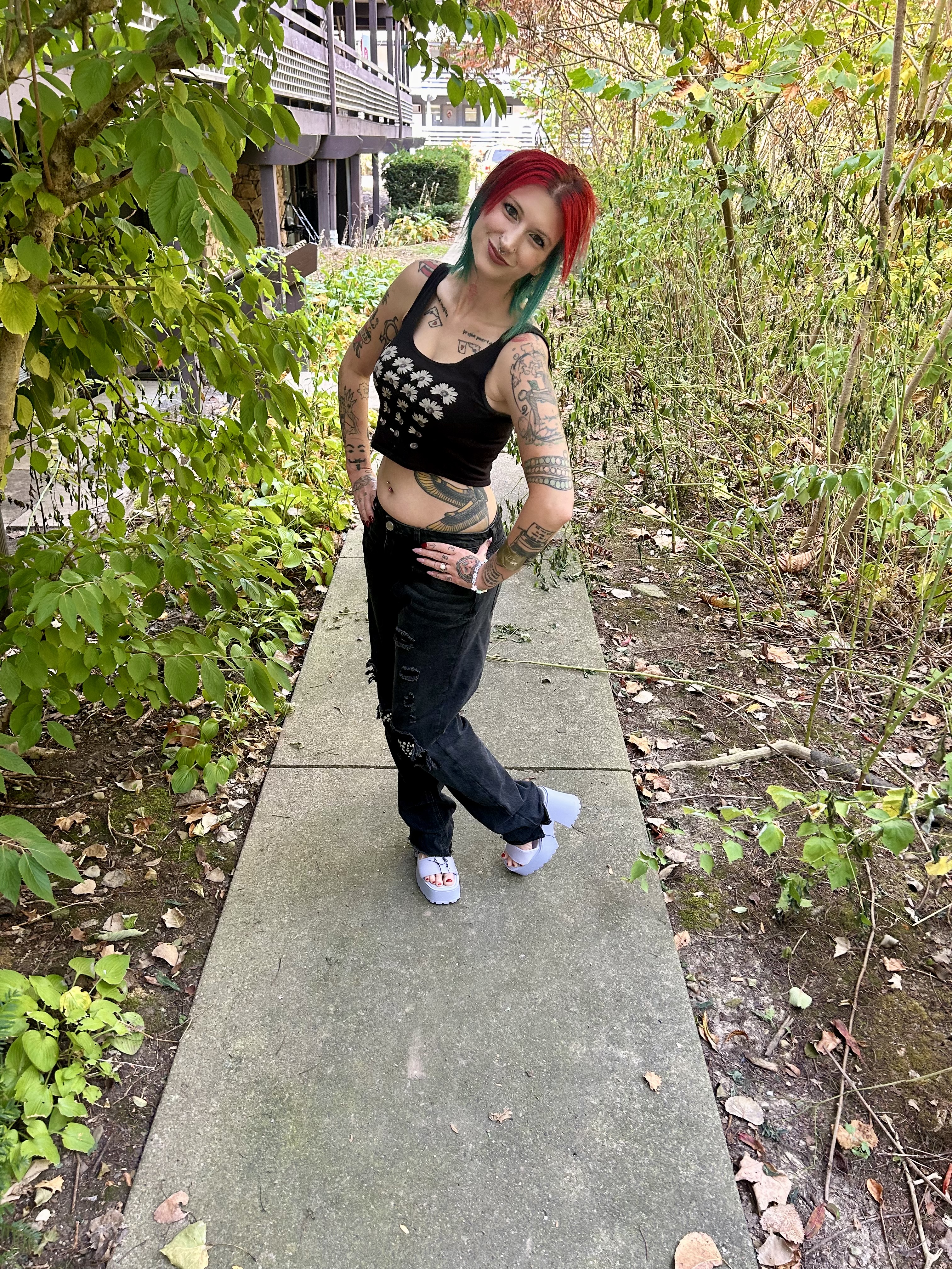 Finally, it was onto shoes and accessories. For shoes, I went with a pair of lavender Olivia Miller platforms from Walmart. These babies were only FIVE DOLLARS – talk about a total steal! As my jeans were pretty long in length, I needed that extra height to keep them from dragging and it provided a pastel pop of color to the All Black Everything look. Since a lot of my tattoos were on display, I kept jewelry minimal with a pair of dangly turquoise cross earrings and was ready to step out in whatever climate Ohio found itself in!