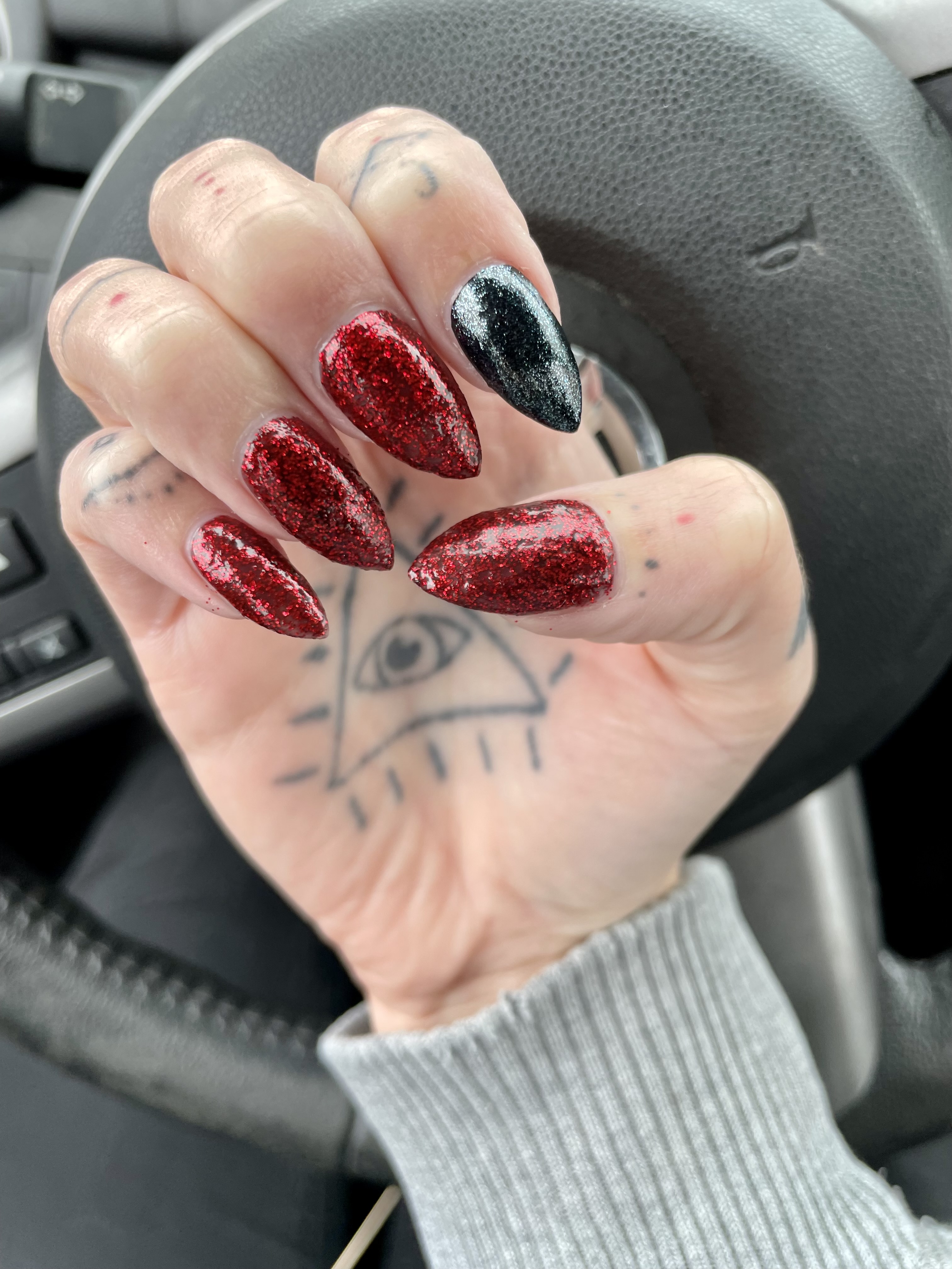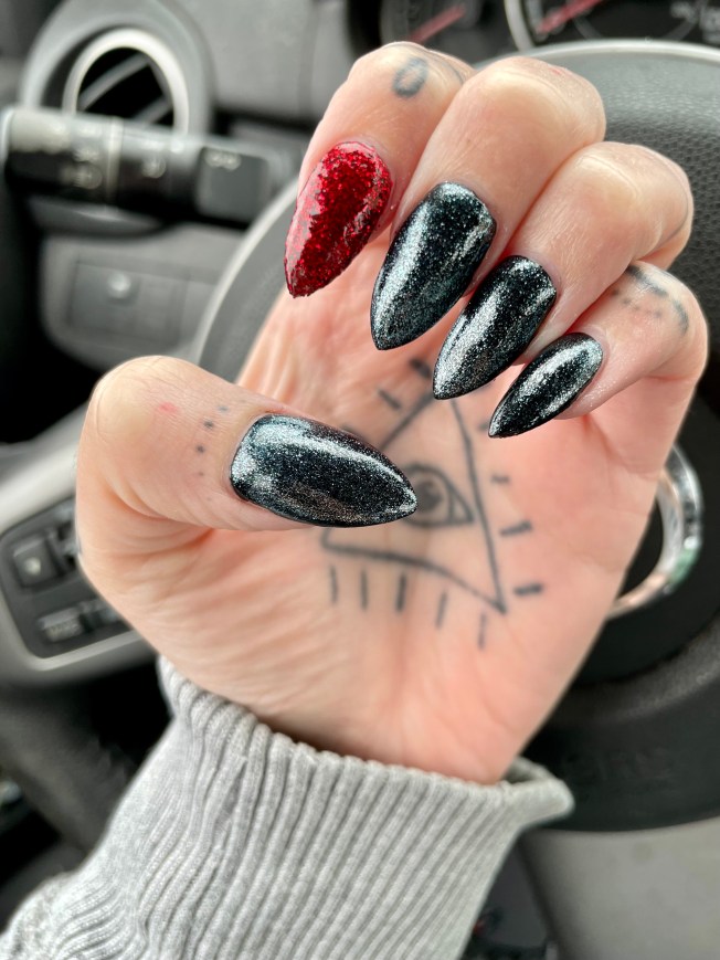 As red and black are my two favorite colors, it’s no surprise that that was the color combo I gravitated towards! The garnet glitter polish for my red selection was everything and reminds me of Dorothy’s ruby slippers from The Wizard of Oz. They shimmer and shine like nobody’s business and I seriously can’t stop looking at them! I wanted to compliment the red with some black glitter polish but there was none to be had. So, my nail tech created her own with a gorgeous sparkle top coat. The shine provided was so intense it made me think of crushed diamonds and this combination is going to be absolutely perfect for my pirate costume!