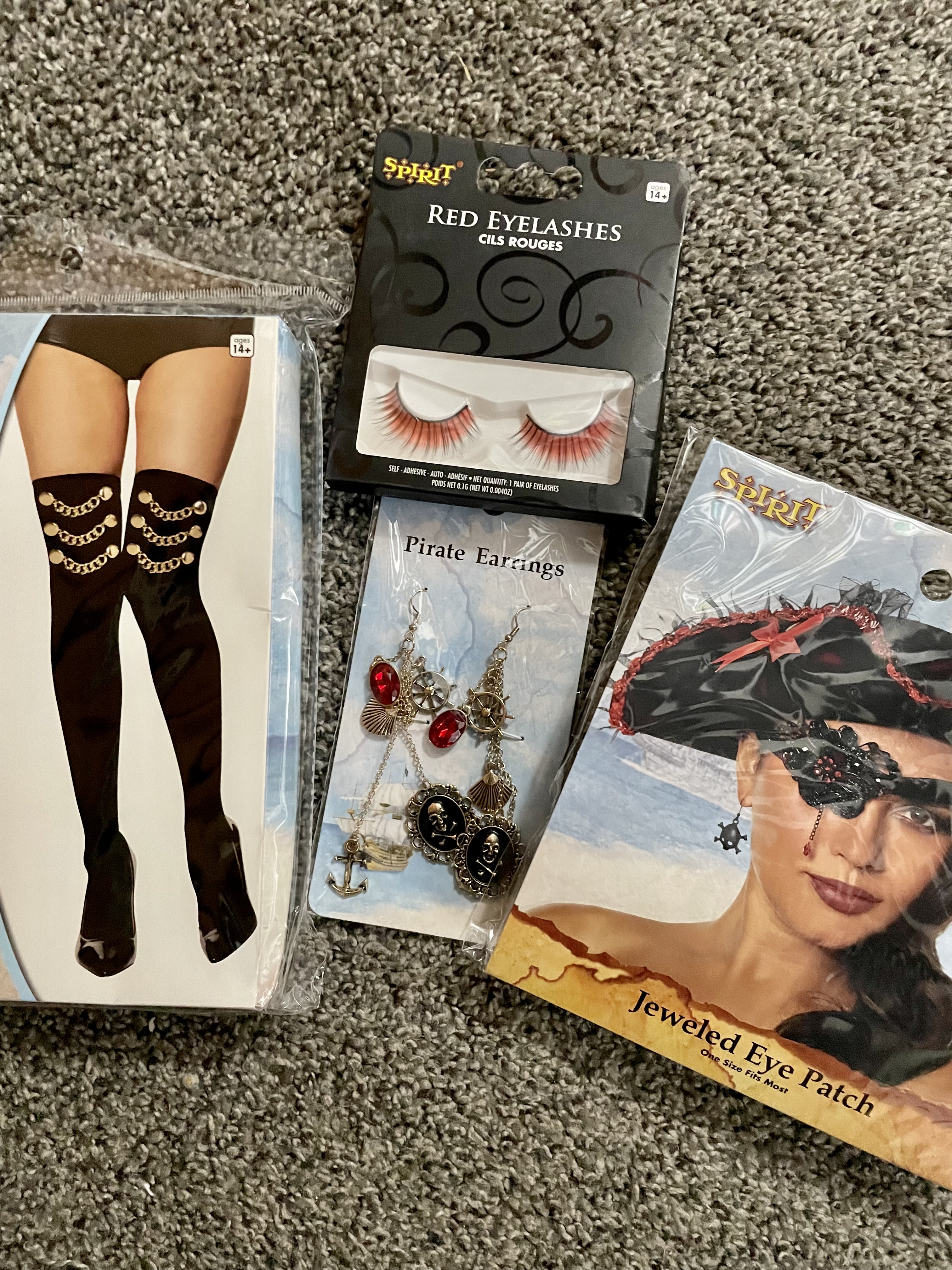 For accessories, I wasn’t feeling the headscarf my costume came with at all so I opted for a hat instead. There were a few different options to pick from that looked like a floppy hat but had buttons to make it a trifold. I was delighted to find one that had red accents when folded up and I think it will look stellar on top of the wig! I also had my heart set on an eye patch and surprisingly there were literally none except for the jeweled one. That was fine because I would have chosen it anyways – it is so freaking cool and provides a fun pop of bling. Speaking of bling, how great are those dangly earrings? I was a bit worried that I was over accessorizing but they will be tangled amidst the curls in the wig and won’t be a focal point.