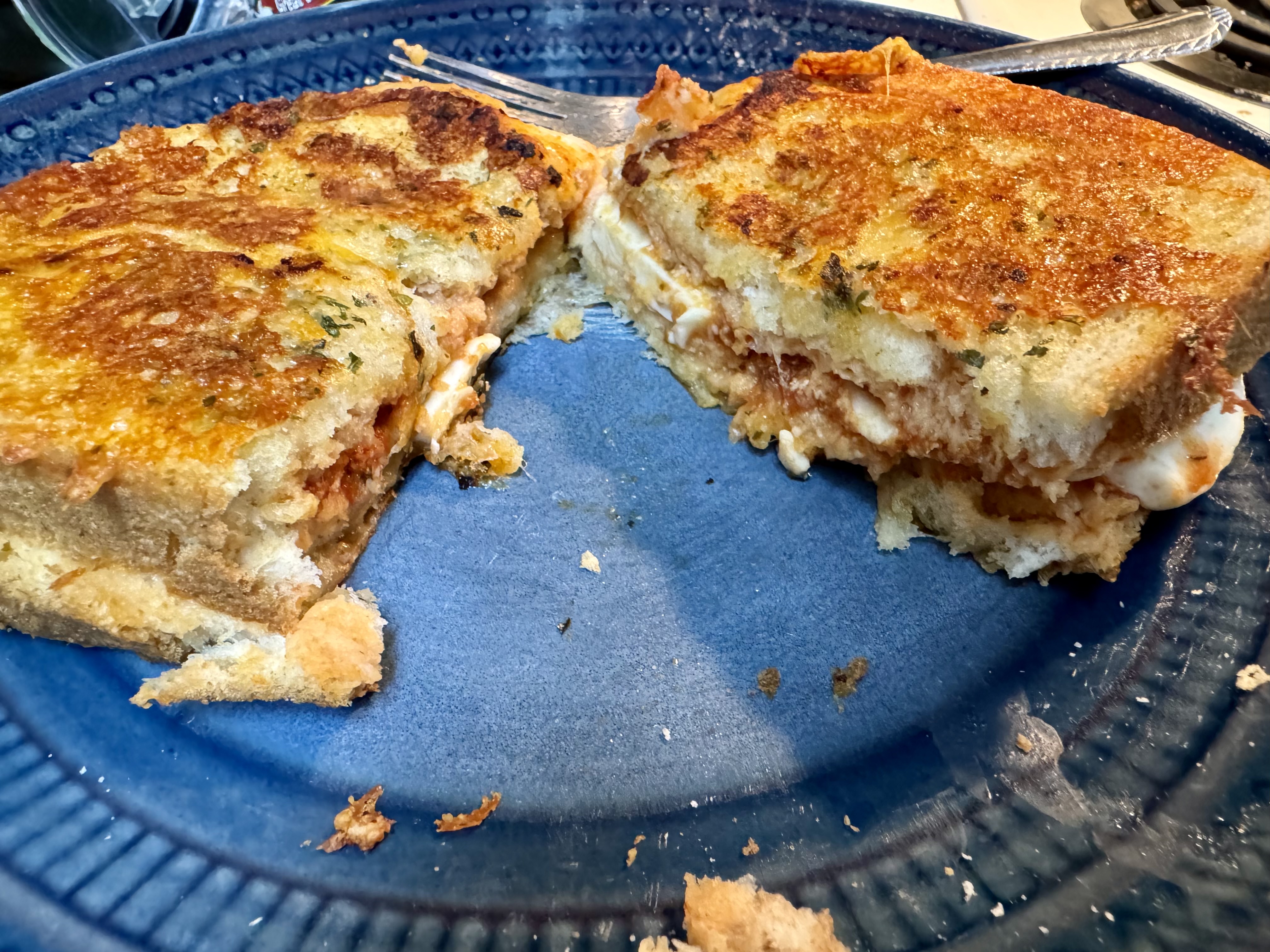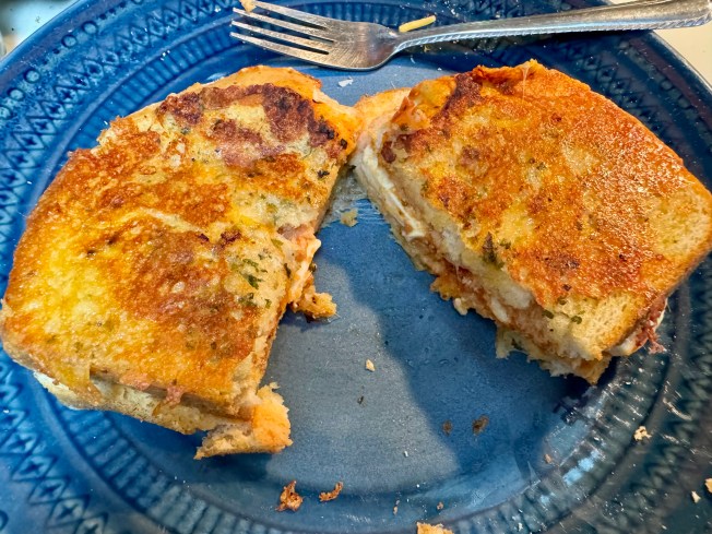 Yoohoo! My dad did not plant his usual vegetable garden this summer and opted for beautiful flowers instead. However, he did end up with a cherry tomato plant from seed and it went crazy during the last warm days in the past few weeks. I absolutely love me a cherry tomato and happily took some so I could create one of my favorite meals: Angel hair pasta with pesto, pine nuts, fresh mozzarella, and cherry tomatoes on top. It is heavenly! There is nothing better than huge pieces of fresh mozzarell *chef’s kiss* and I dreamed up a little dish to use the rest of it: Pizza Grilled Cheese. It has become one of mine and Johnny’s favorites and I actually made it a few days ago. π