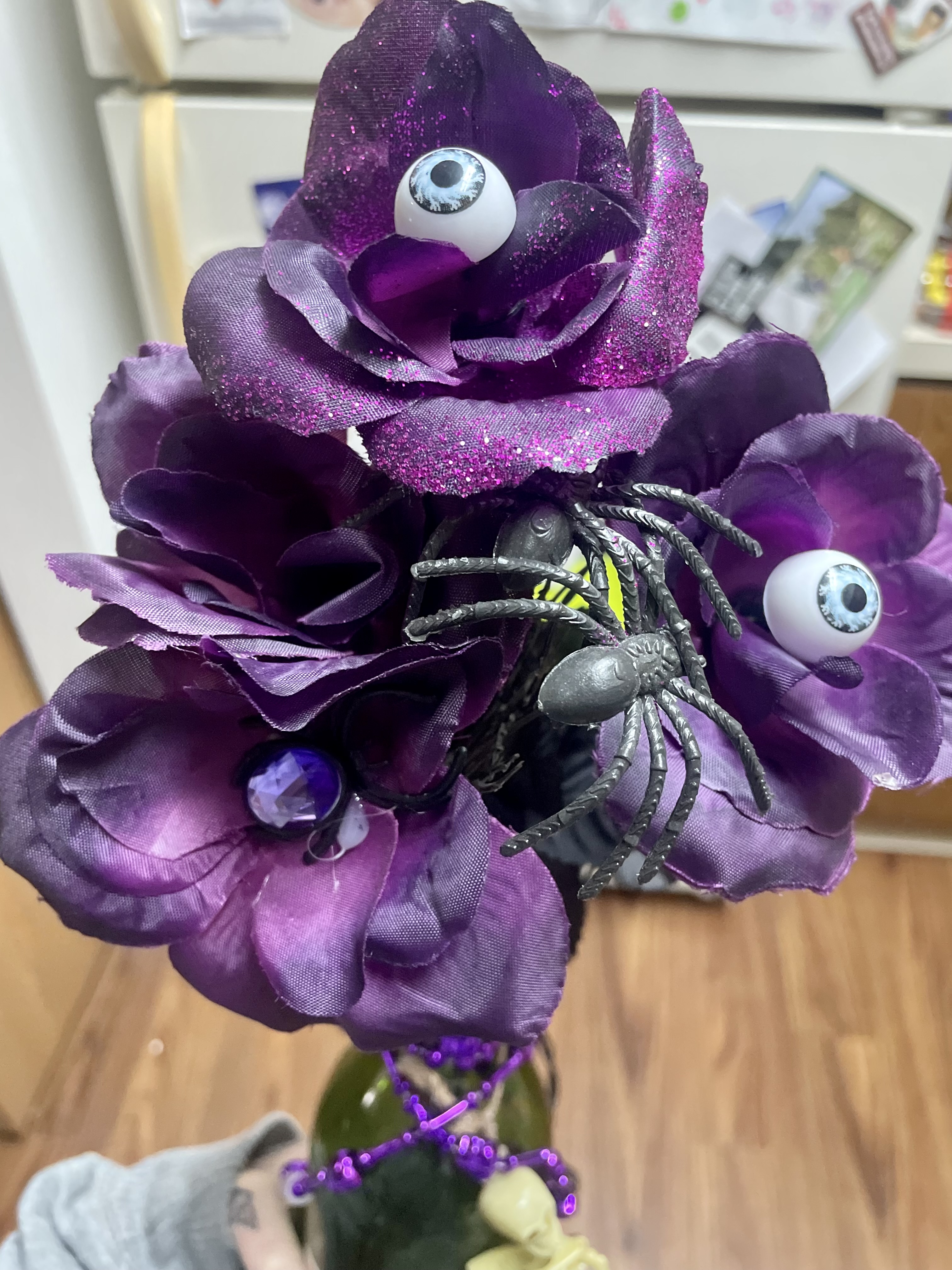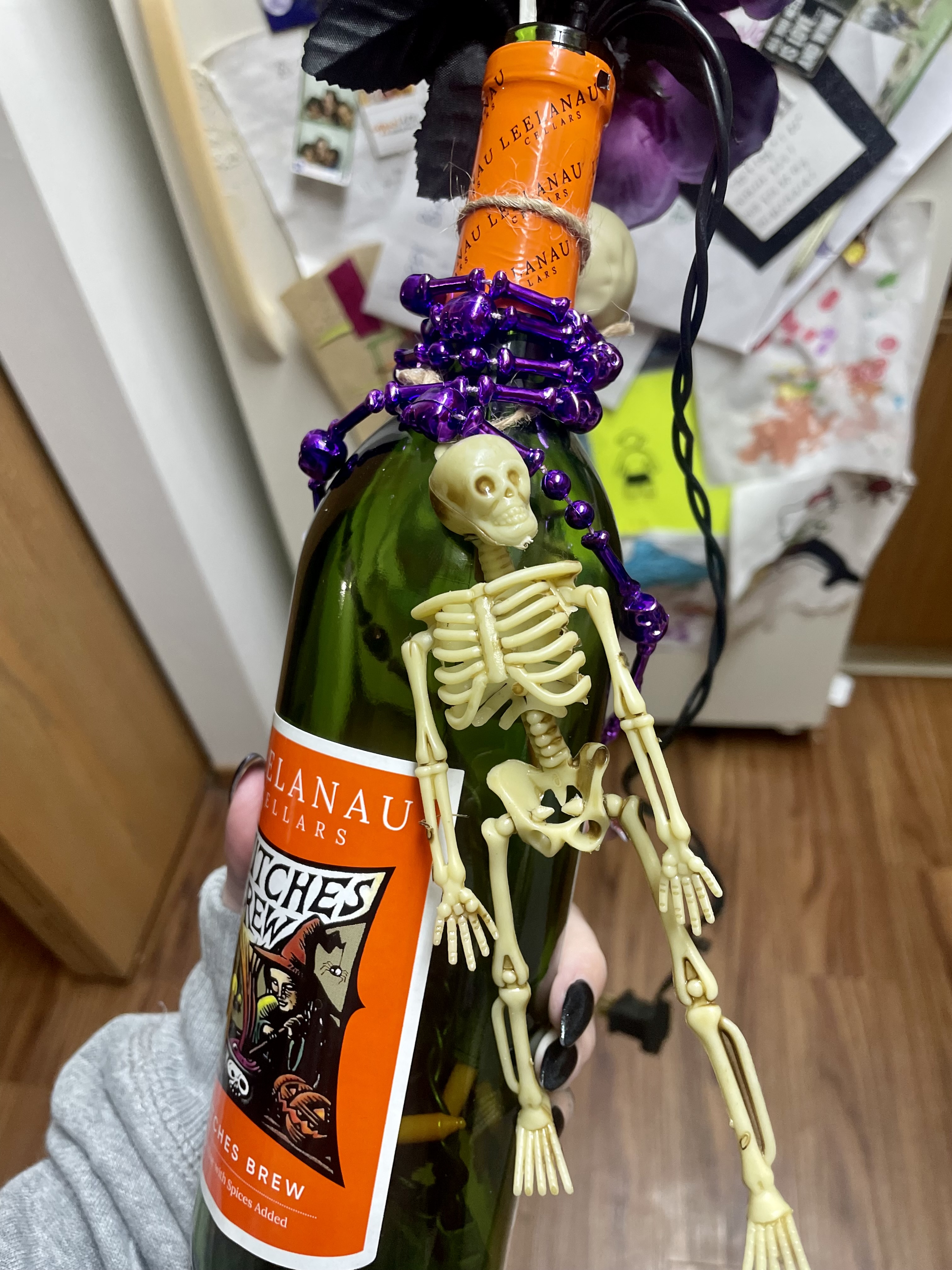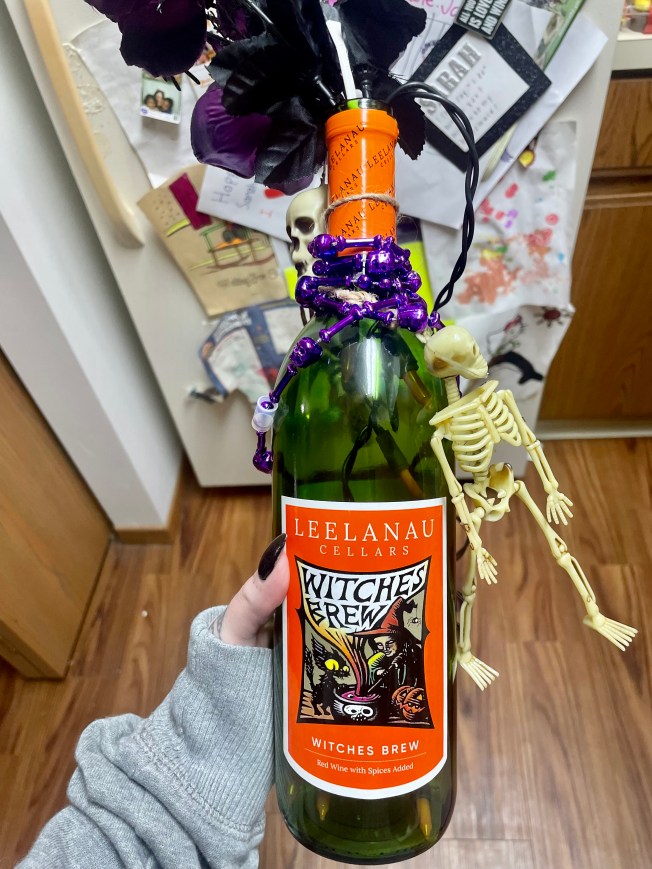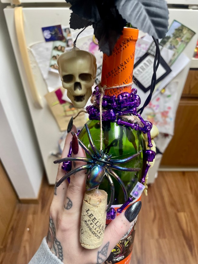 Johnny and I were aware that his coworker makes crafts like this bottle nightlight and never expected to have her make one for us. It honestly came as a shock and we are just so appreciative for it because it’s so totally us! His coworker claims to not be crafty but we most certainly say otherwise. There are countless fun little details to this display. The spider, skeleton beads, and eyeball flowers took a simple craft into something really special. The bottle of Witches Brew set the tone and it bloomed from there!