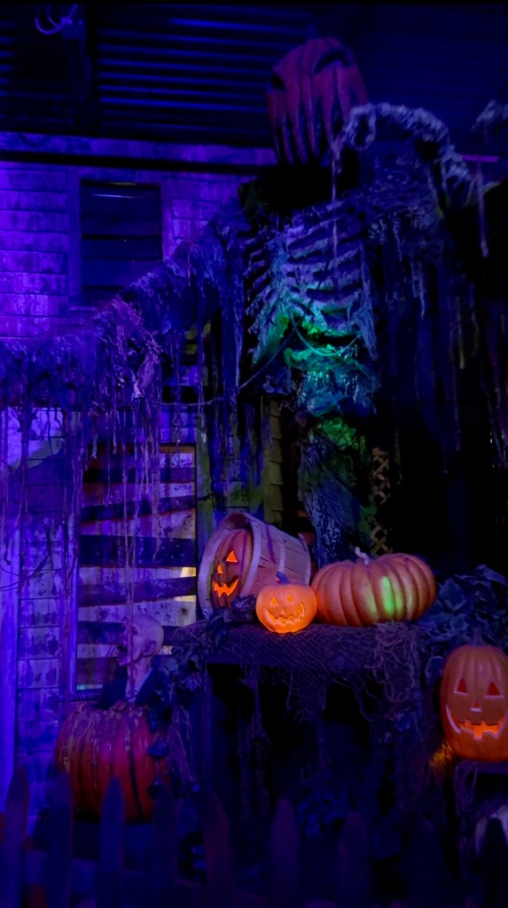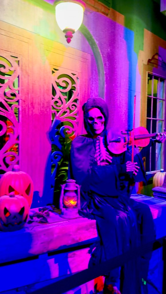 As we made our way through the floors of the lab, we saw a bunch of scenes of aliens causing mayhem. All the while we were walking through the most terrific lighting. It legit looked like we were making our journey in a swirling waist high sea of green. That was a really nice touch! At the final floor of the lab, we were greeted by a mad scientist who asked us if we were ready for the big show. Then, he turned on a huge orb that crackled with purple light and electricity. It was quite the send off because afterwards we were back outside into the Halloween night and delighting over our time together. ❤