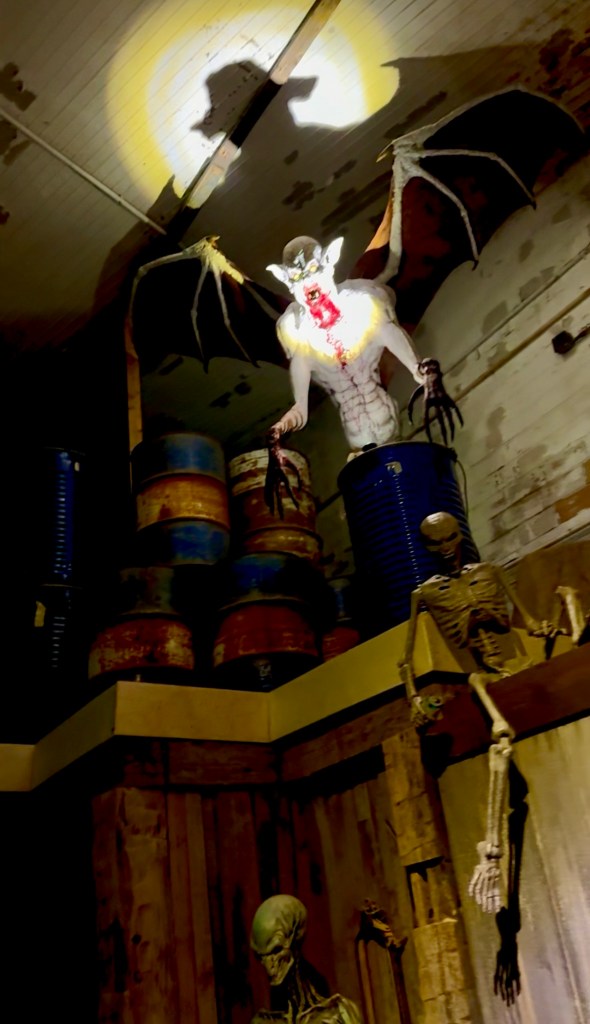 Once we emerged from hell, we went outside to the next addition of the haunt which is the Laboratory. This was set up like an alien takeover and holy WOW did it have some dynamite features. My only regret was that it wasn’t longer! For me, the best part of this haunted house was close to the beginning. Like the Schoolhouse, we began from the top down and were walking across sturdy theater catwalks. We were up fairly high and when Johnny told me to look down it was like staring into the mouth of a cave. It could have gone on for forever!