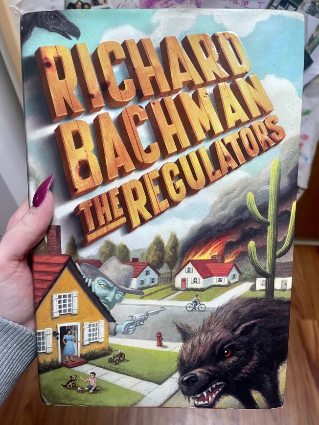 Hello everyone and welcome to a brand new edition of Lil Red’s Book Club! After accidentally borrowing a book from the library I had read before, I was in a literature limbo. So, I decided to consult mine and Johnny’s own library for a new book. We have been really enjoying watching Welcome To Derry and I had Stephen King on the mind. From Johnny’s collection of his works, I chose The Regulators which was written as Richard Bachman. The kooky cover screamed out at me and I devoured the almost five hundred page book in three sittings. This will be a spoiler free setting, as always. Before we begin, however, a big fat trigger warning will be placed on The Regulators for highly disturbing content, suicide, and violence in all possible forms. Now, let’s get to it: