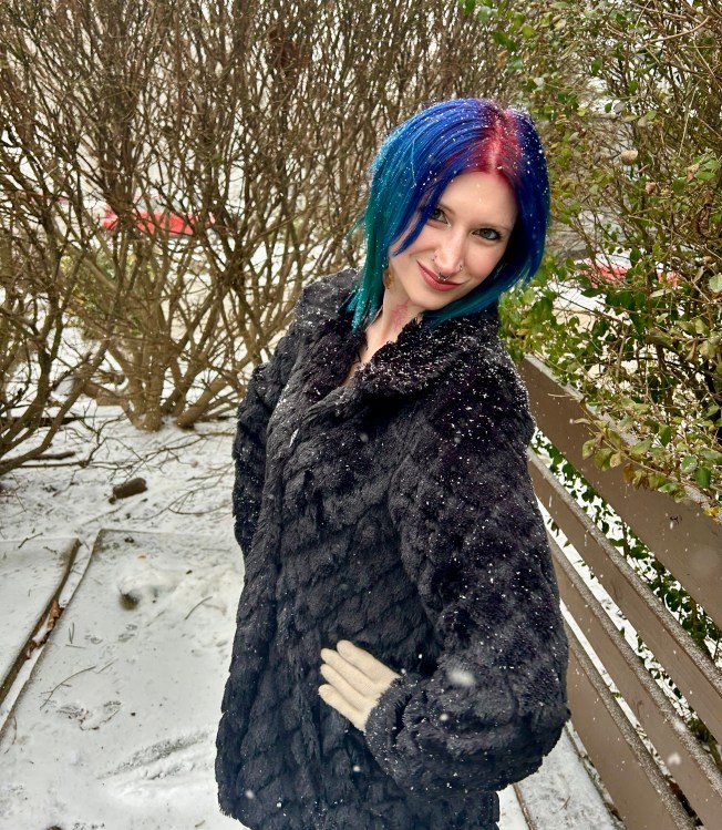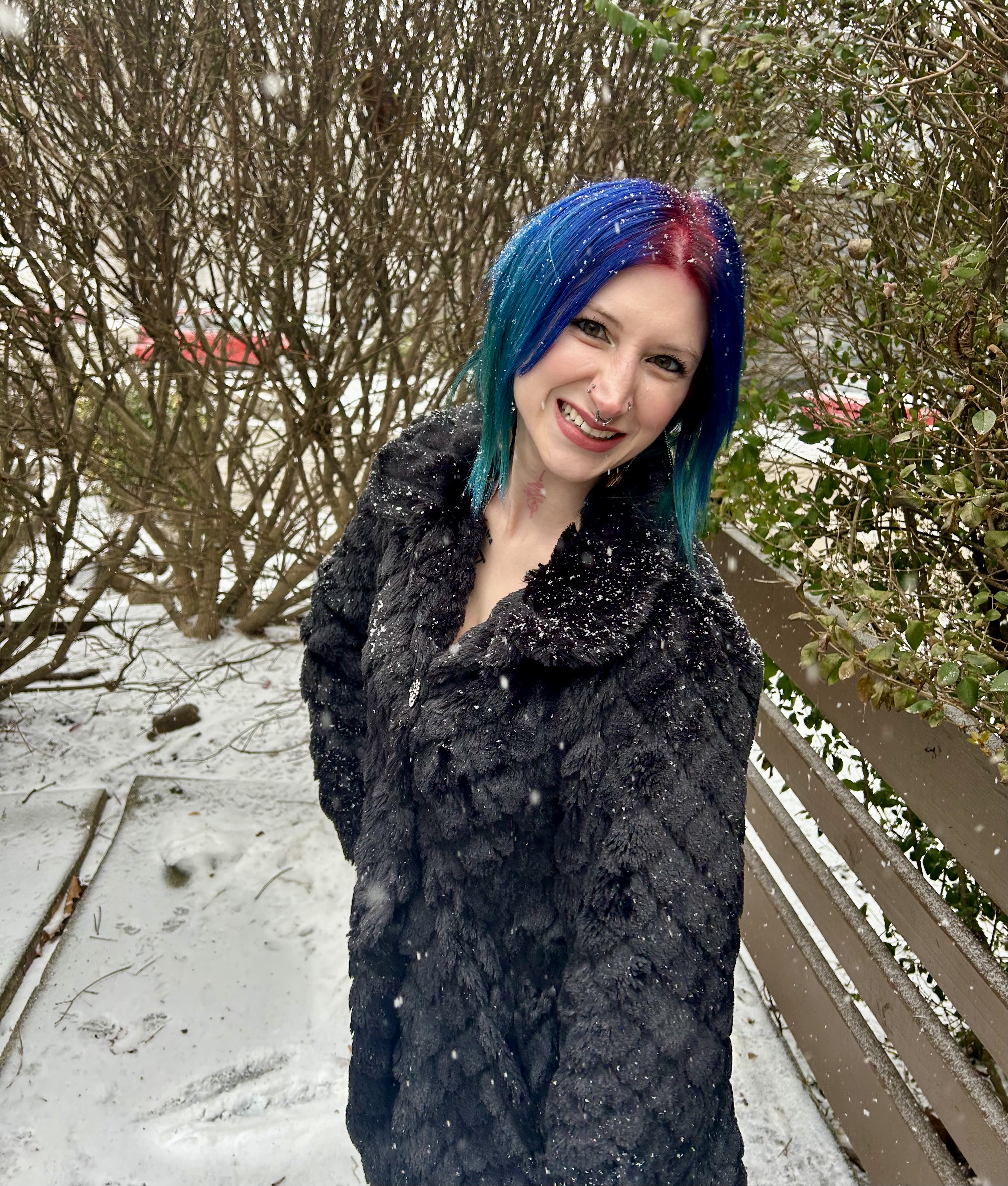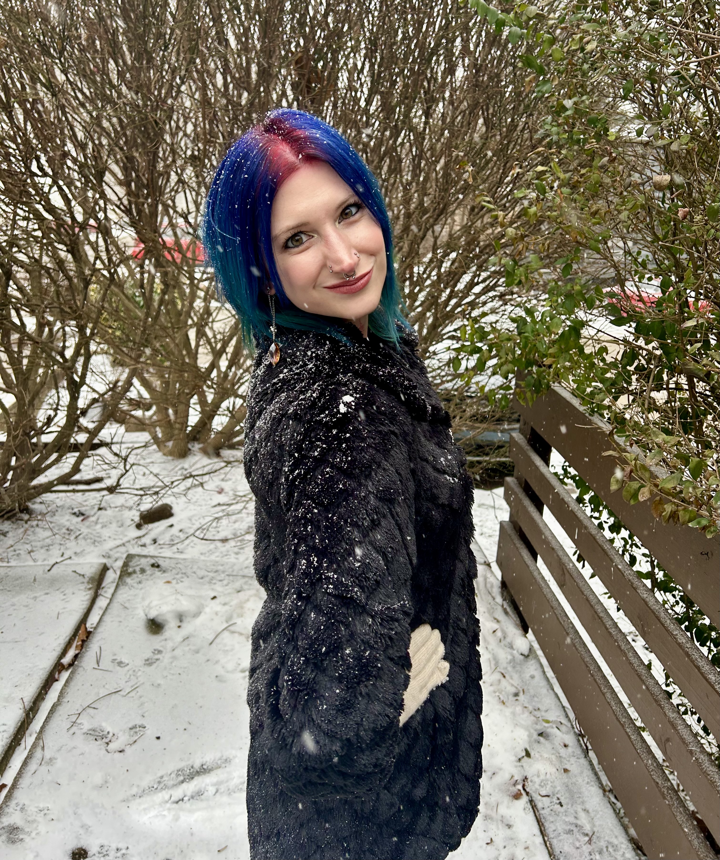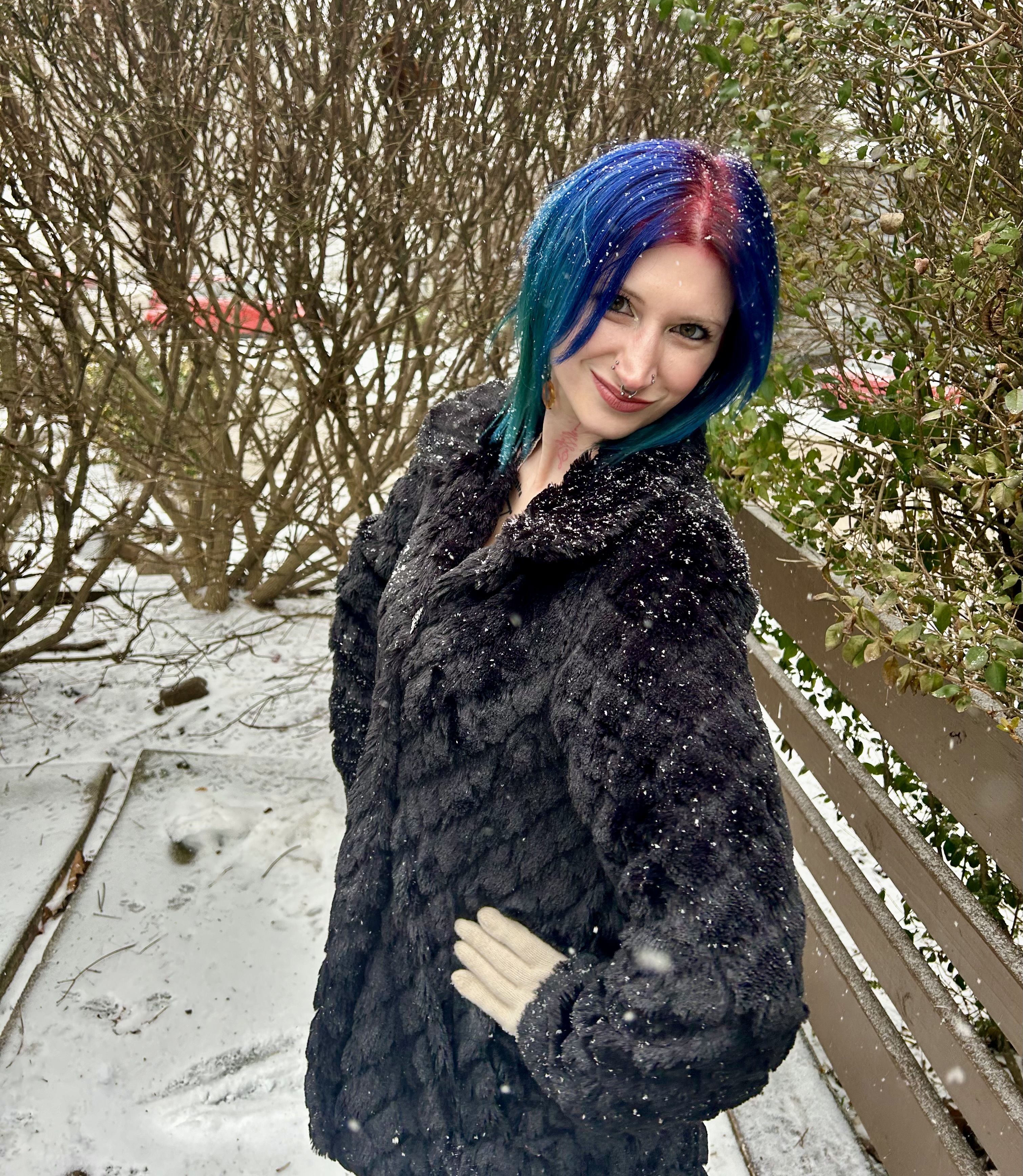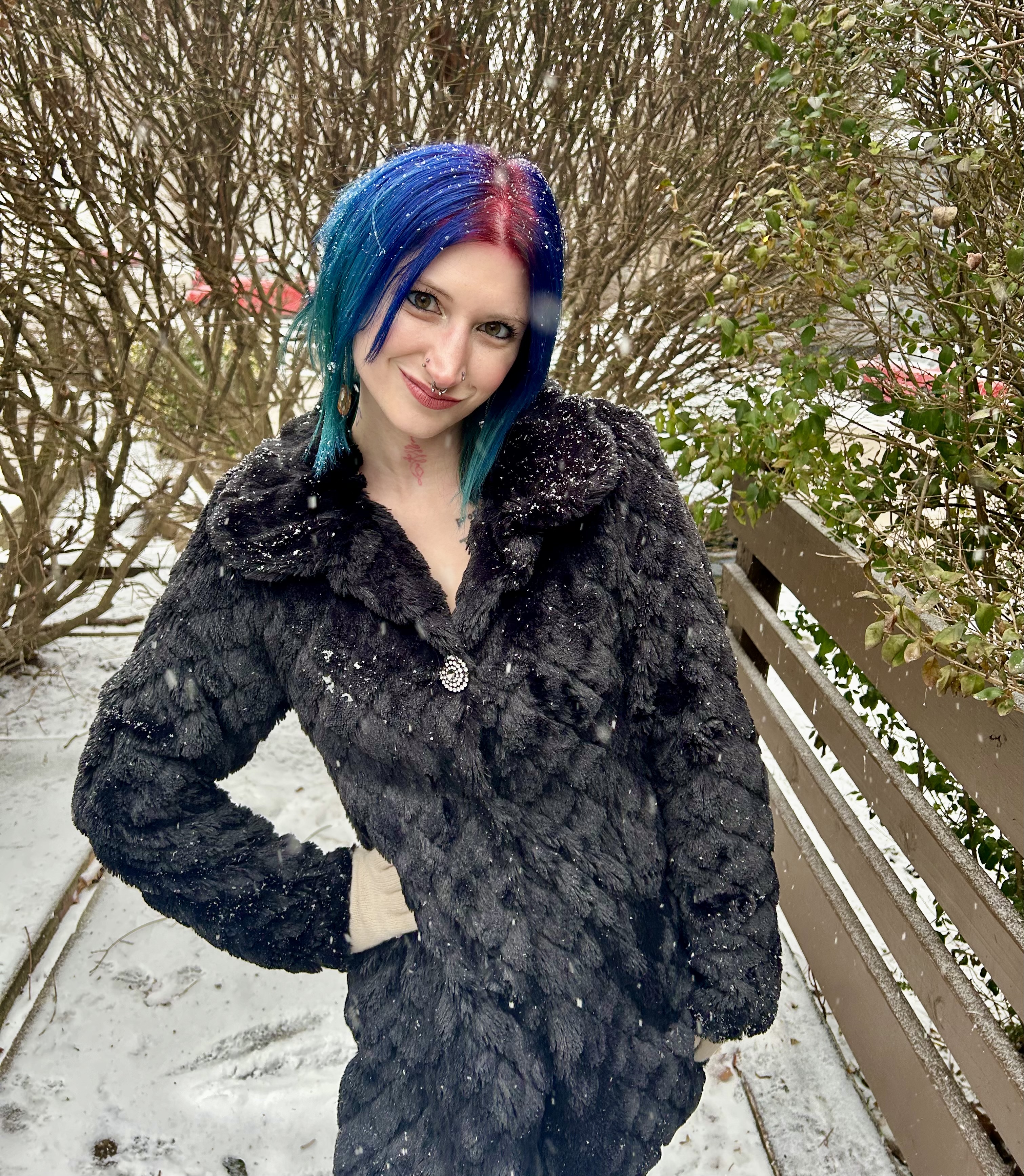 This color combo is everything and we were blown away by the dimension of the Pulp Riot dyes. We only used three colors but it sure doesn’t look that way. There is a kaleidoscope going on! The red and blue near the roots mixed into purple, there are swirling teals, aquatic blues, and jewel toned greens that created a full fledged peacock palette. My favorite animal! I could not wait to take pictures as soon as I got home and I loved seeing the falling snow against the gemstone magic that my genius stylist and I dreamed up. ❤
