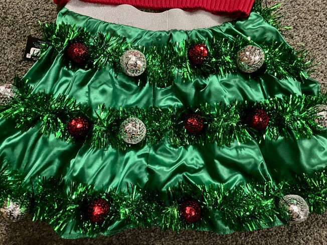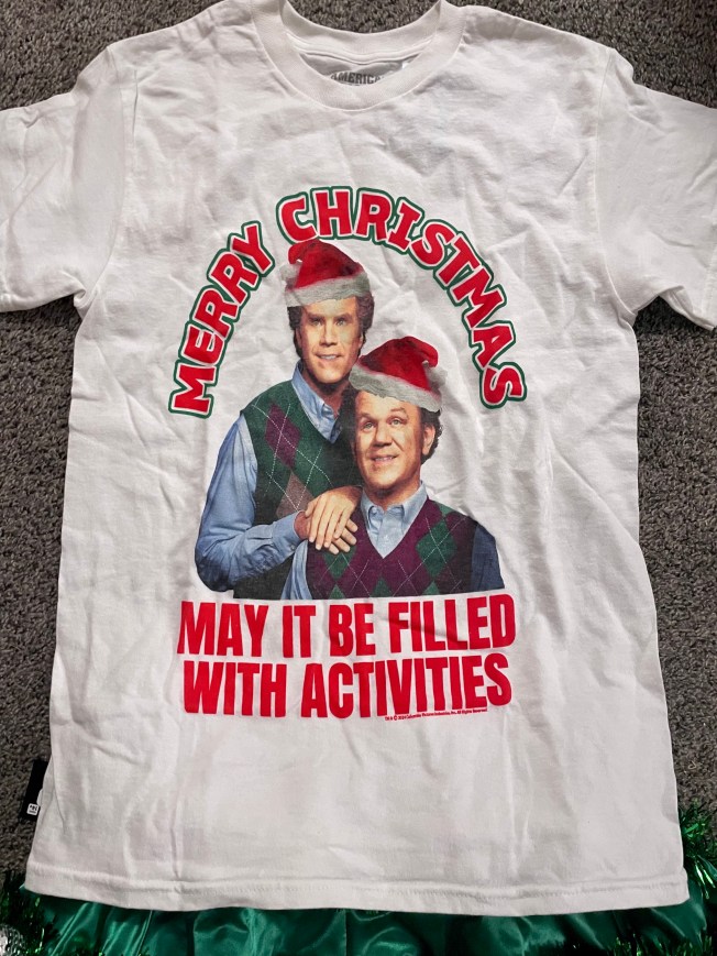 The first thing I clocked was the Christmas tree inspired mini skirt and I knew I could work with that. It is just so festive and FUN with that sparkling tinsel and disco ball style ornaments. I cannot wait to twirl and swirl in it and am happy to have it as I have literally no holiday season themed clothing. I think this skirt is the best place to start! The next order of business was finding a top to pair it with. I bypassed the ugly sweaters because they were upwards of seventy dollars and that was way too expensive to justify. That was no matter because who needs an ugly sweater when you have a Step Brothers T-shirt and sweater vest? 😀