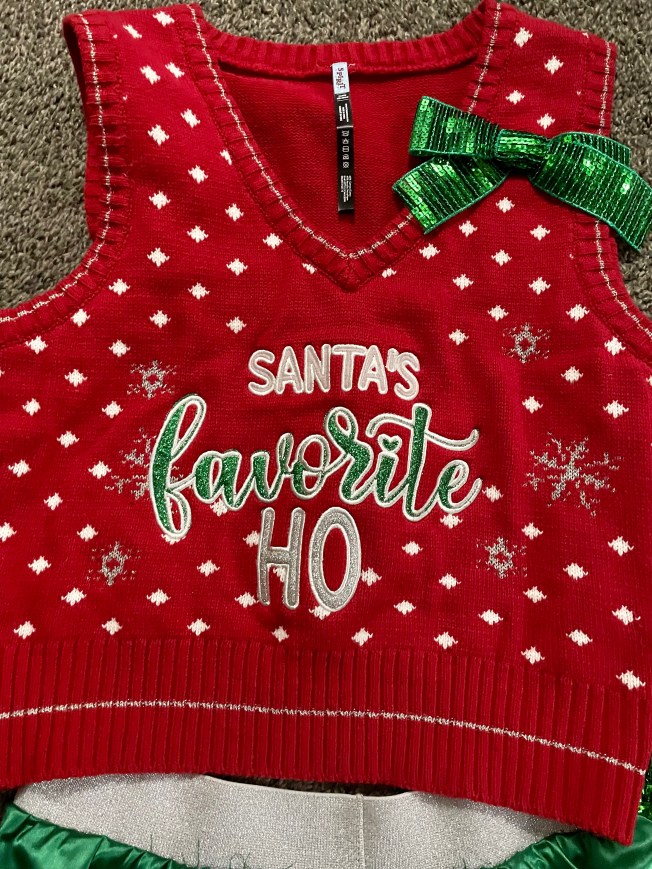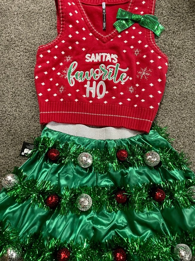 Hello! This past week I took a trip to Spirit Christmas and had a complete blast. Spirit Christmas is basically Spirit Halloween… But Christmas lol and the setup is the same. As soon as you walk in, you are greeted by a walk through of motion activated decor and there is also an area filled to the brim with inflatable lawn decor. And, oh yeah, beaucoup holiday themed T-shirts, costumes, ugly sweaters, stockings, and ornaments. For my holiday OOTD, I had a vision of a Sabrina Carpenter inspired ensemble. The sweater vest below is for my “naughty” OOTD and the T-shirt is for the “nice” version! Check it out: