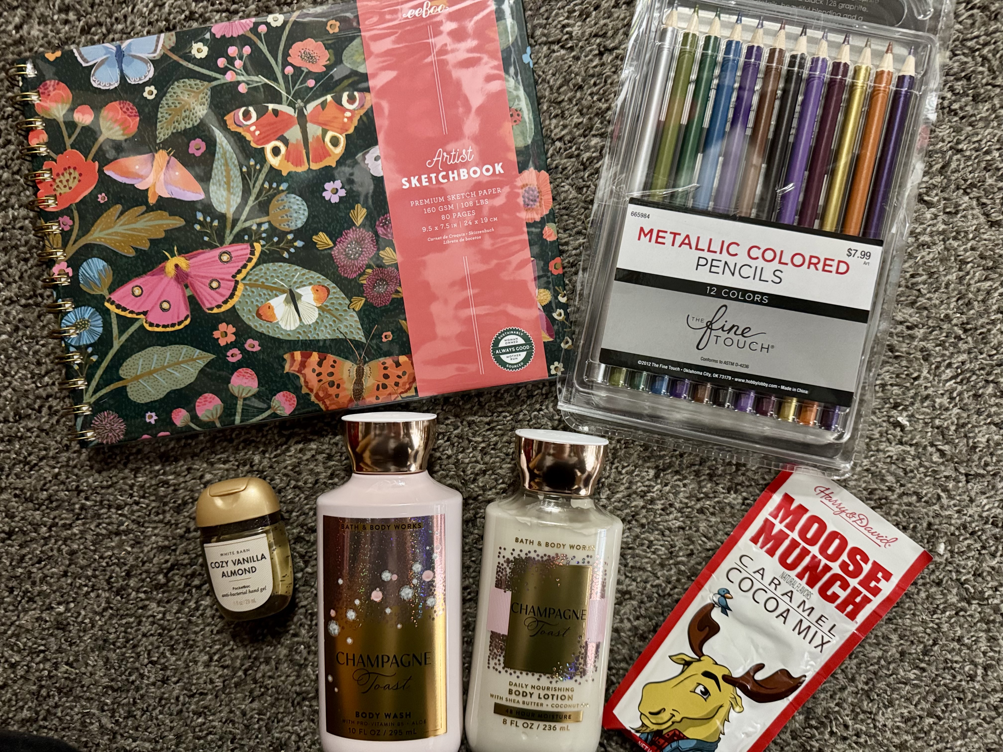 Johnny’s mom, on the other hand, loves to find those unique little somethings that we normally wouldn’t buy for ourselves. I love the gorgeous sketchpad that I received complete with a set of colored pencils so I can craft amateur masterpieces. I have zero talent for art but, hey, it’s exciting to create and Johnny’s mom requested a Lil Red Original to hang up. I’m looking forward to giving it my best shot! Also included was a stunning pair of earrings as well as goodies in my favorite scent from Bath & Body Works – Champagne Toast. Or as Johnny would call it, “Champagne & Toast” lol.