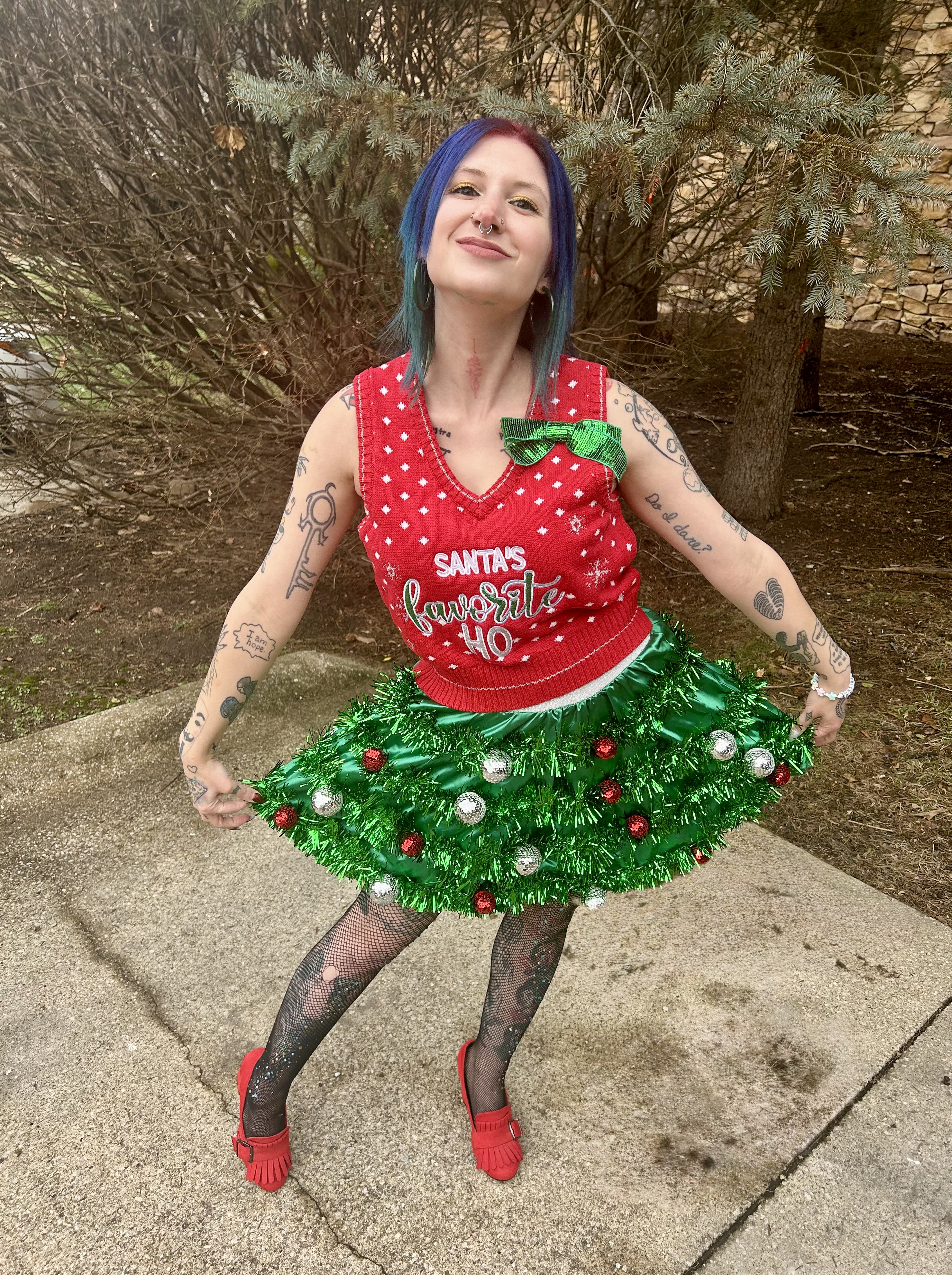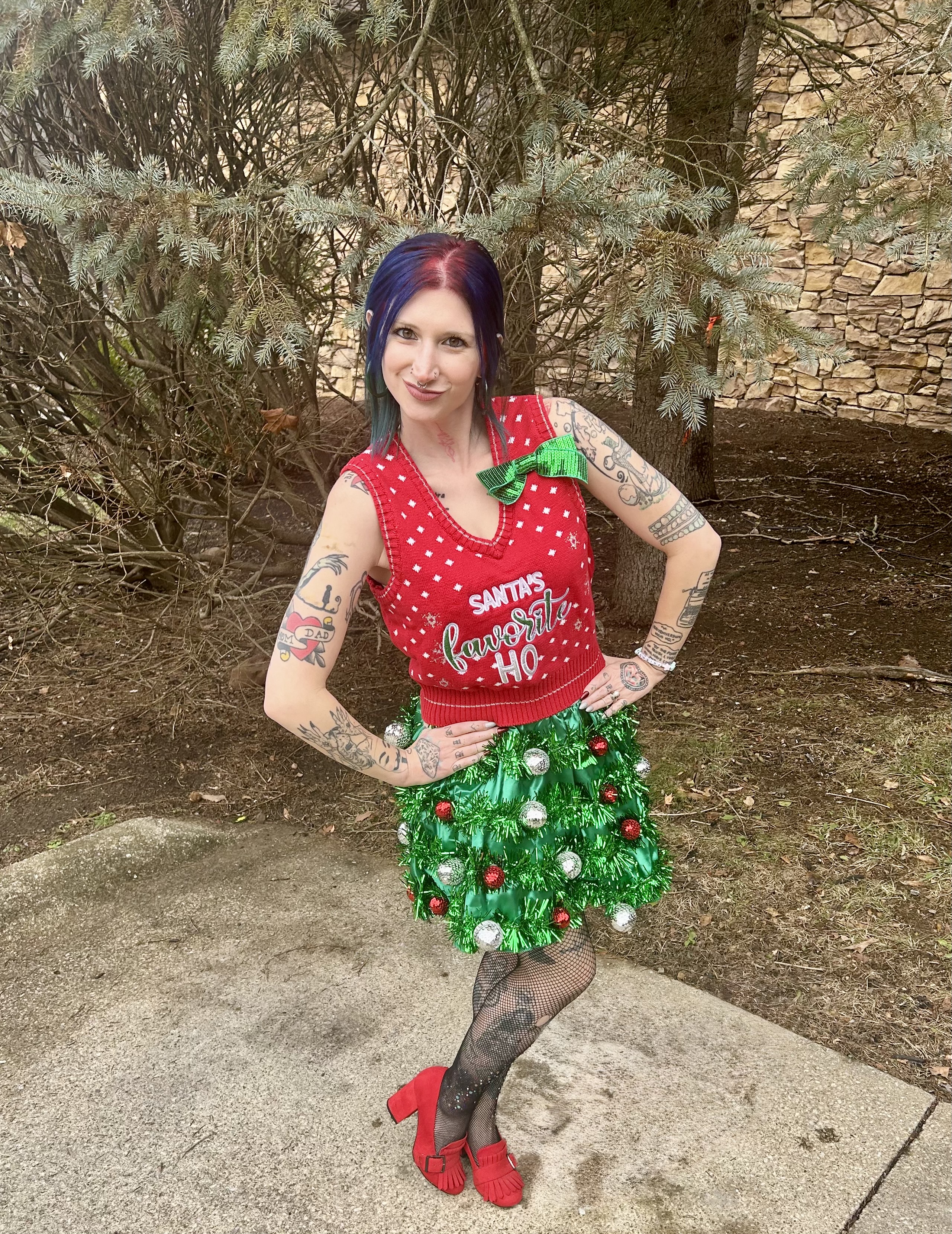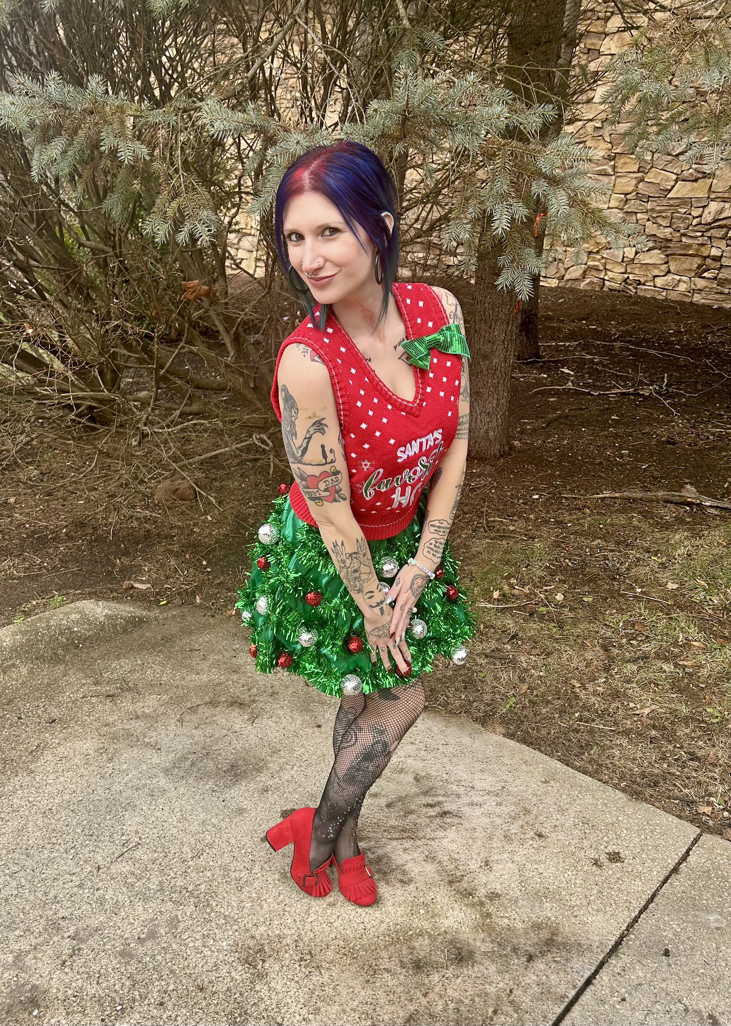 This OOTD was part naughty, part nice, but oh so much fun and I WILL find an event to wear it to next year, damnit. That cheeky sweater vest with the make you blush saying paired so perfectly with my tinsel skirt adorned with red and silver ornaments. It was like a sassy version of Santa’s elves and I got to do it Lil Red’s way as opposed to a store bought costume. The sweater vest may or may not have been a for the sake of content purchase but I did get to bust out the skirt again for my family celebration. My nieces and nephew were obsessed with it and so am I. Although the tinsel definitely started to shed after extended wear!
