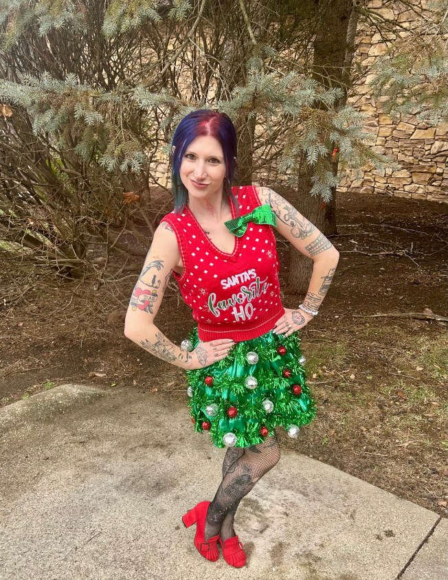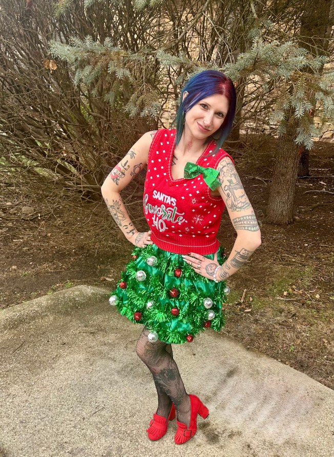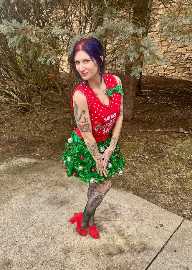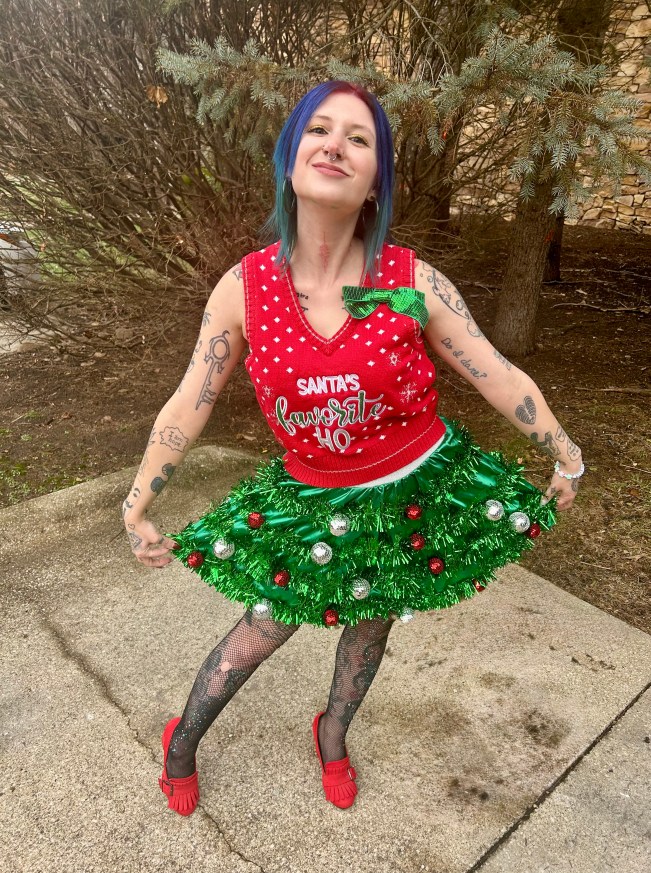 Hi! If you follow me on TikTok, you were able to see my Christmas OOTDs in real time. If not, let’s take a look at them in blog time AKA several weeks later lol. I had three festive fits to break out and I was so excited to wear them all – even if it was just for the sake of taking pictures. That was very much the case for the outfit you are about to see. We didn’t have an adult holiday party to attend and I couldn’t have imagined wearing this ensemble to visit our parents! Check it out: