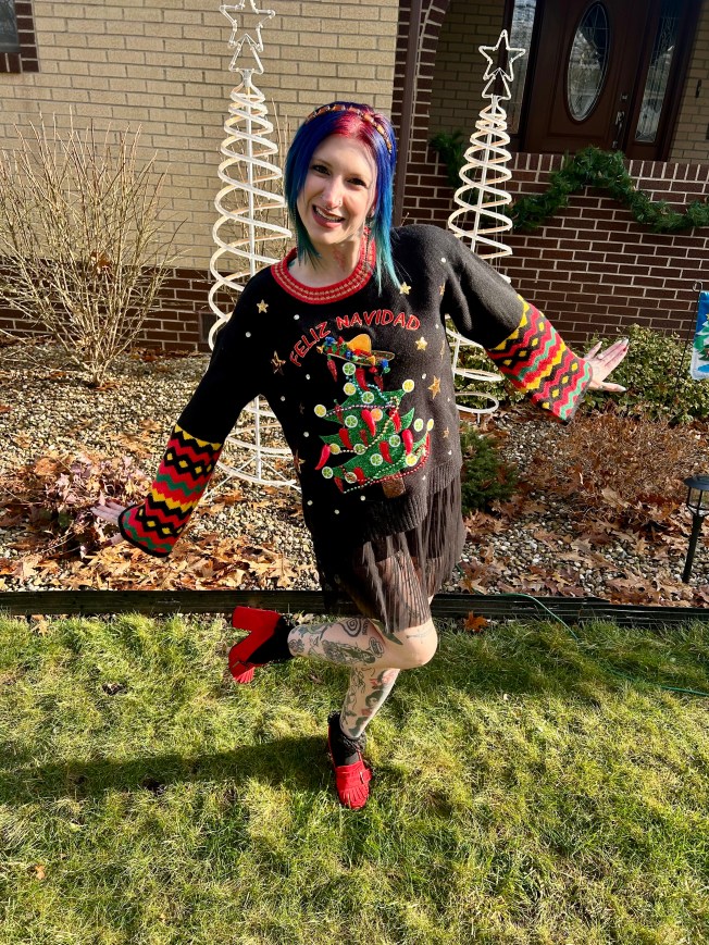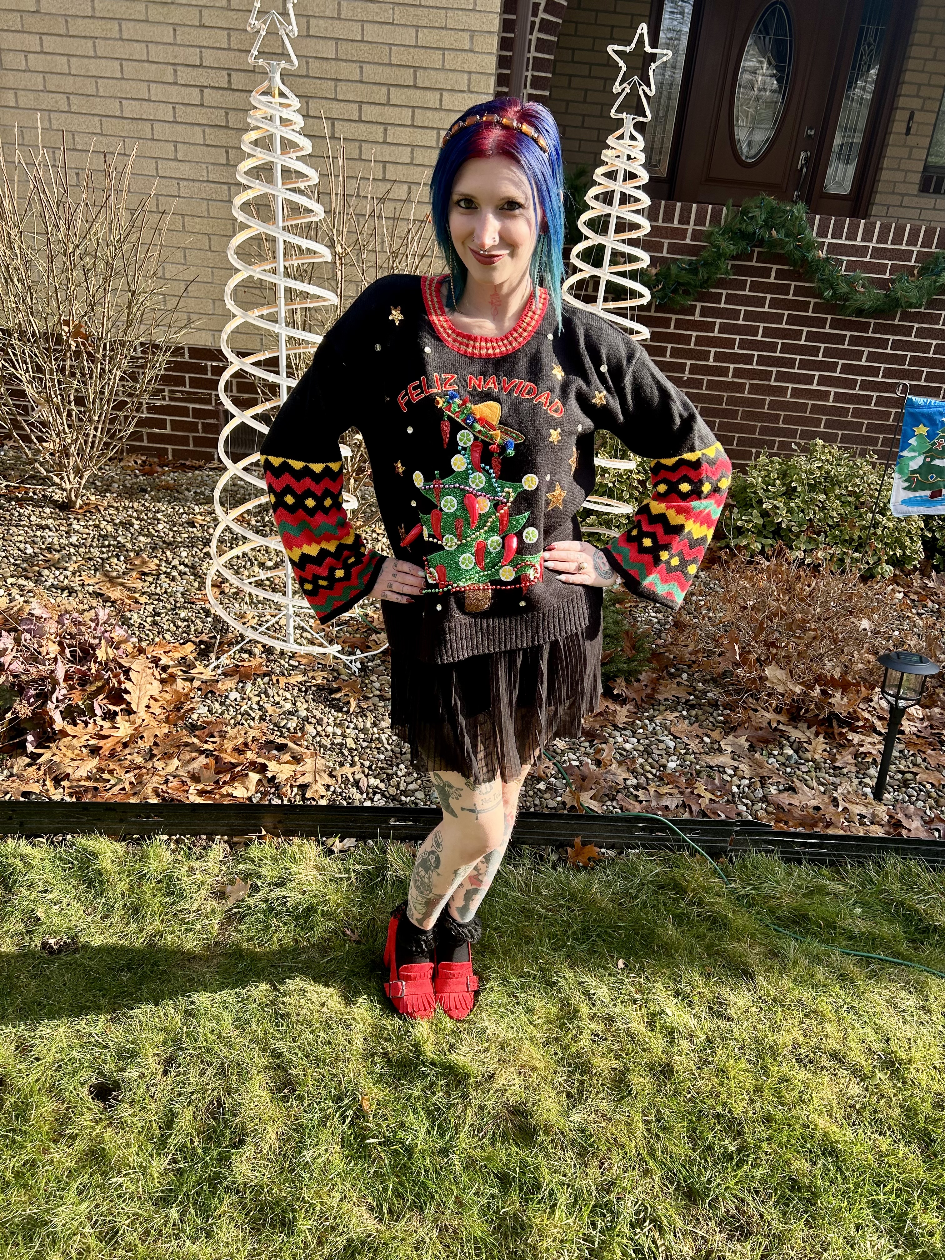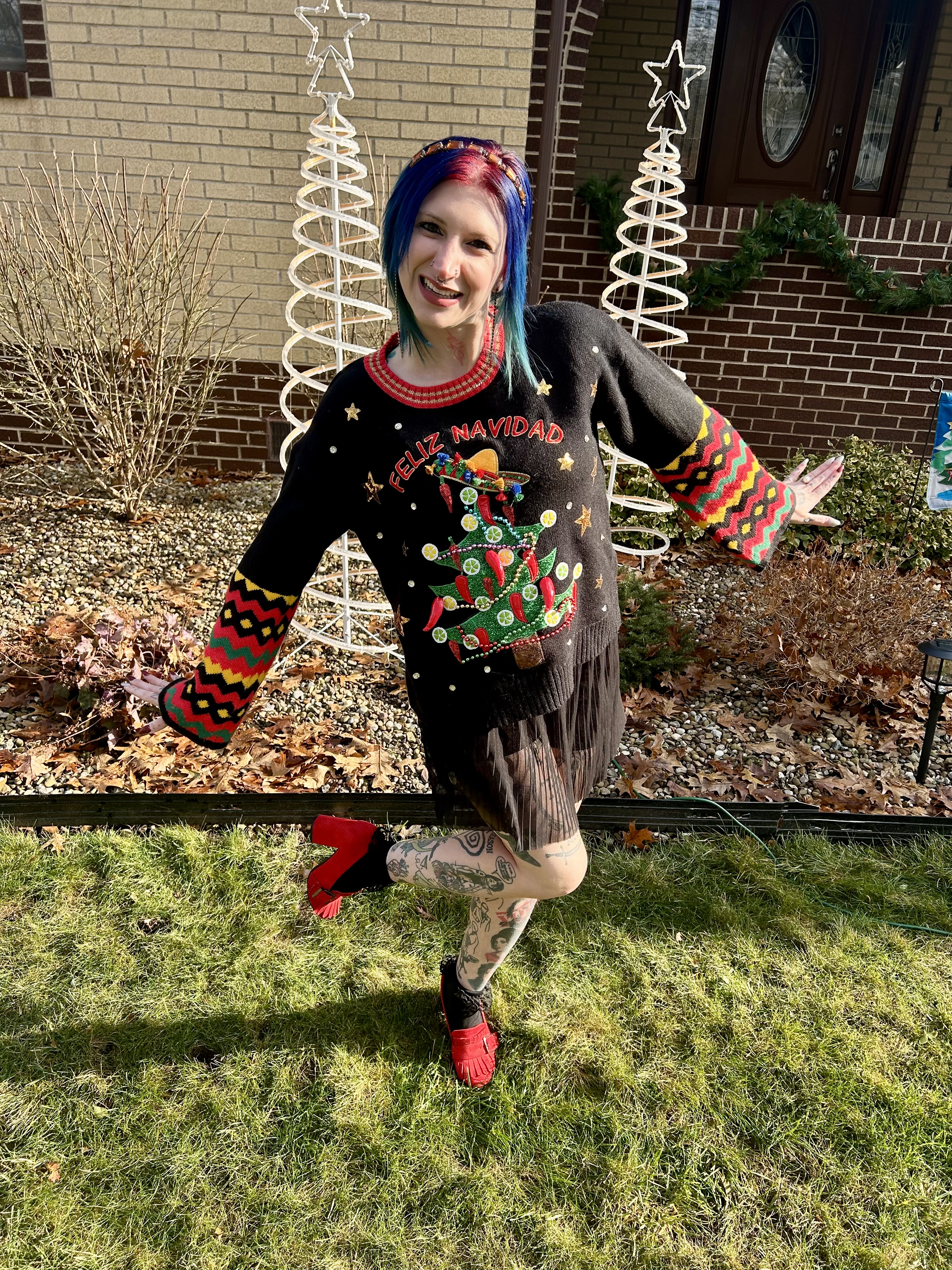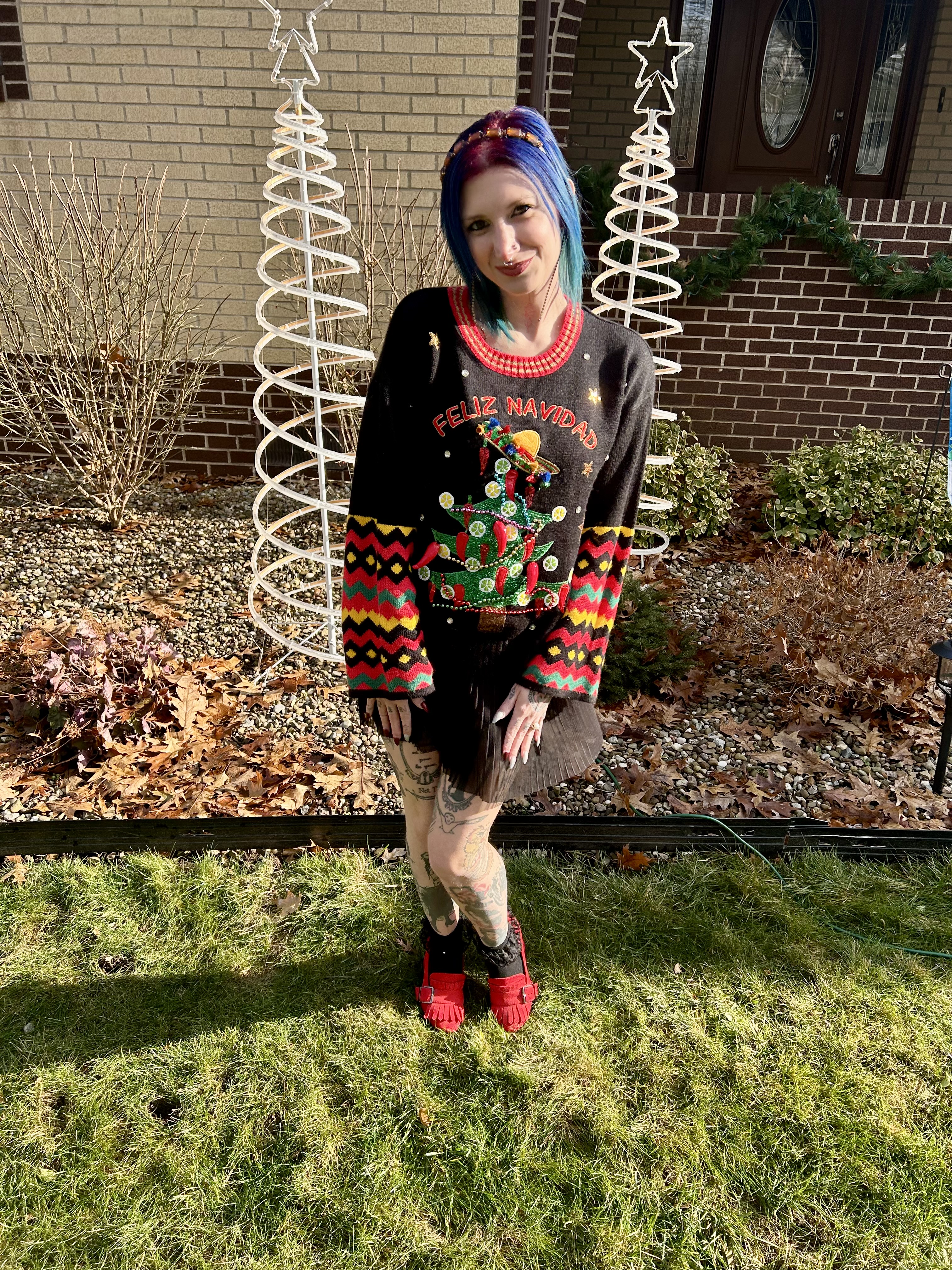 A balmy fifty degree day on Christmas was honestly confusing lol. What do you wear on a winter holiday that feels like spring?! Rather than be too warm or too cool, I decided to combine the two seasons for a look that kept me comfortable during the heat wave while serving up a dose of festive fun. To start, I chose my favorite and only Christmas sweater from Walmart. Johnny and I got this years ago when we went to a friend’s Christmas party and I just freaking love it. Those bright colors completely pop and this twenty buck purchase has served me well for many a Christmas Day.